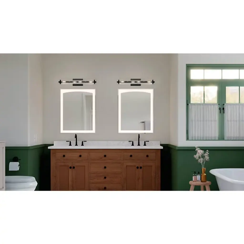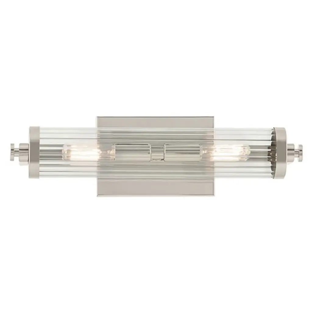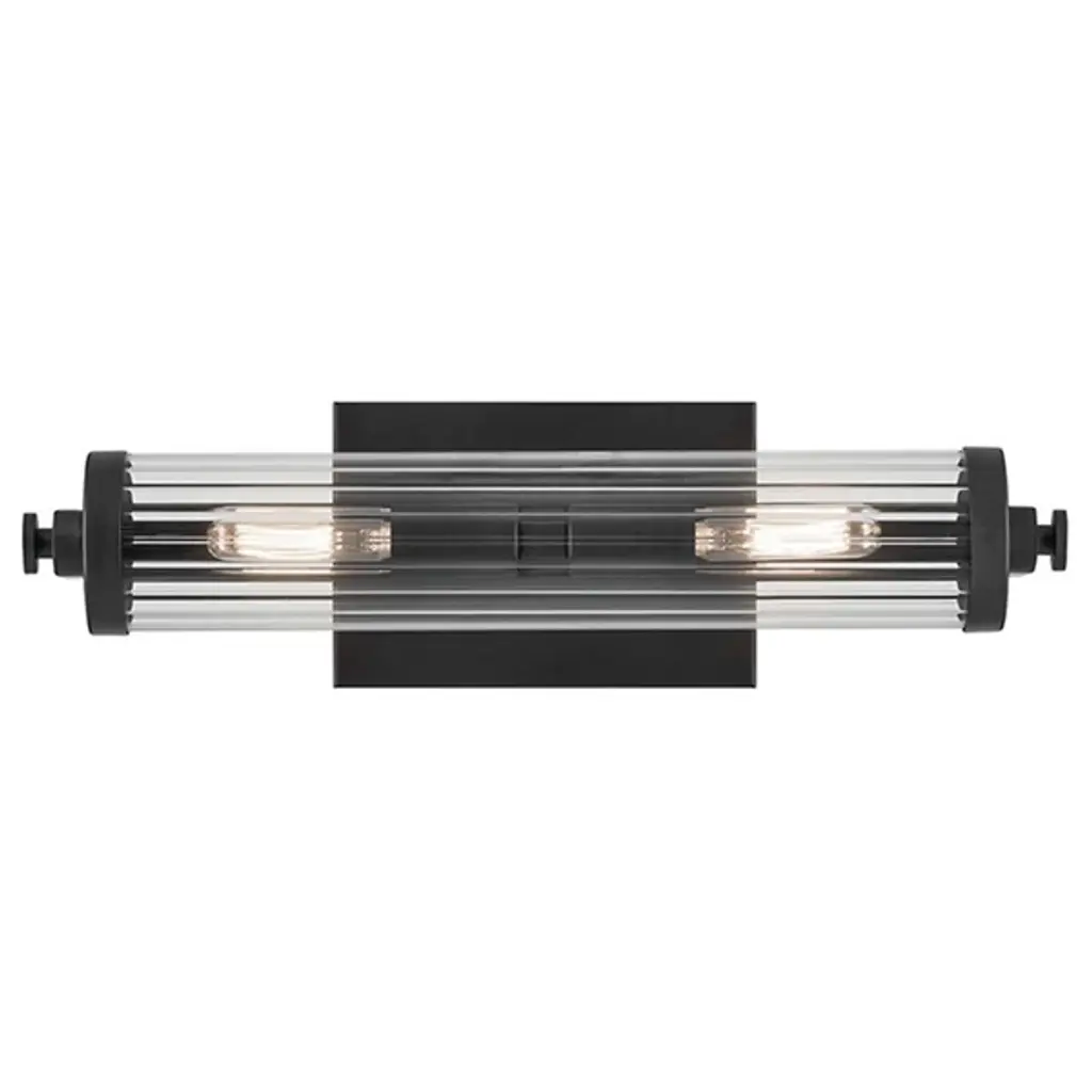 Bring a sleek and modern take on a vintage silhouette to your bath or vanity with the Azores Wall Sconce by Kichler. The cylindrical fixture is supported by a smooth rectangular metal backplate as a clear ribbed glass shade forms a tube that encloses its bulbs. Capped at each end with a metal accent and industrial-style finial, this fixture can be mounted vertically or horizontally to brighten a variety of bath layouts.