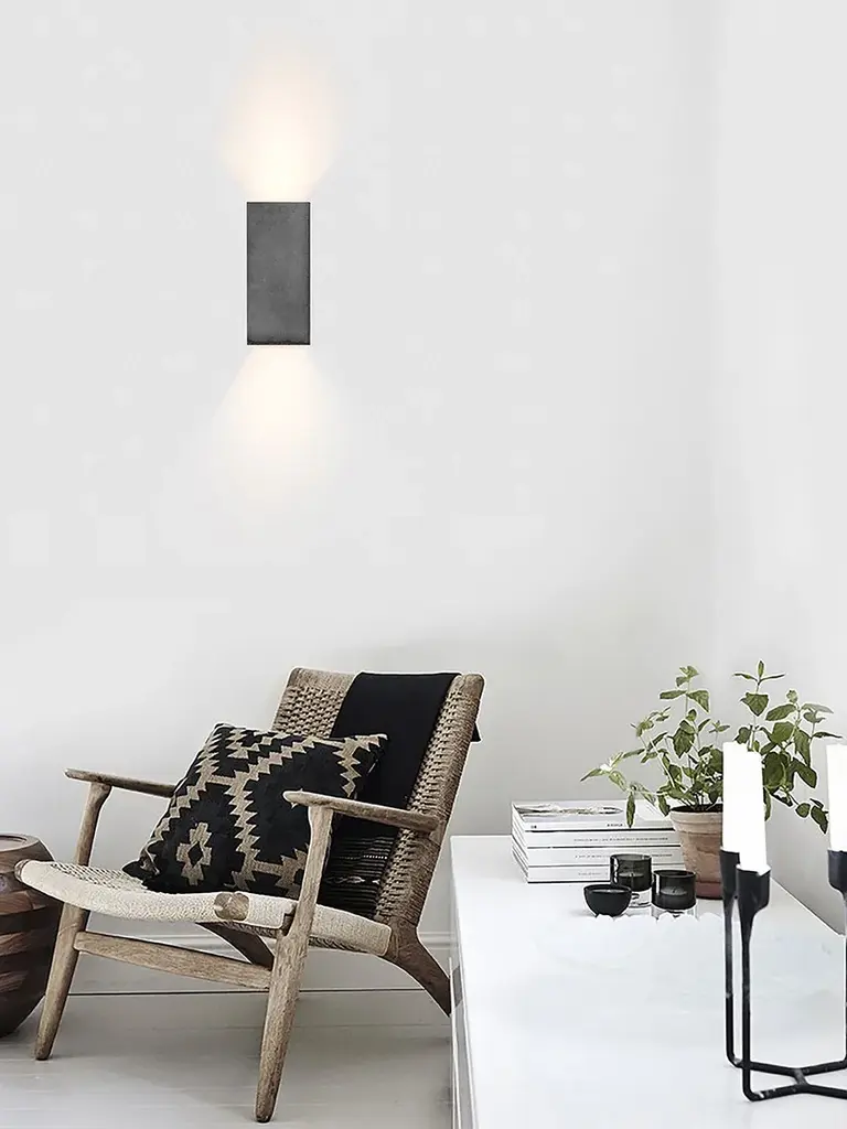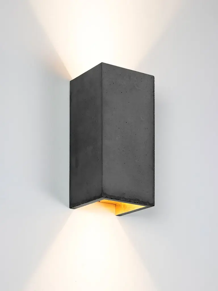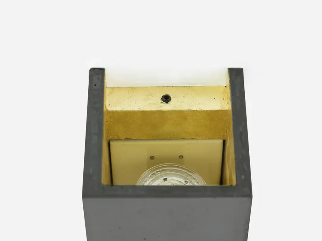 The rectangular wall lamp [B8] DARK is cast from dark grey concrete and comes with a gold, silver or copper plating on the inside.The wall lamp works great as a solitary "eye-catcher" or alternatively it could be combined in a series along the entire length of a wall. Due to its minimalistic design and the contrasting materials, the lamp is modern and timeless at the same time and can therefore be combined with any style. Included: The handmade lamp shade is delivered ready to install with two GU10 bulb mounts and mounting hardware.The lamp requires two GU10 light bulbs (please note that the bulbs are not included).Energy label: A++ to ERated Voltage: max 250 V / 60HzWatts: max 50W.