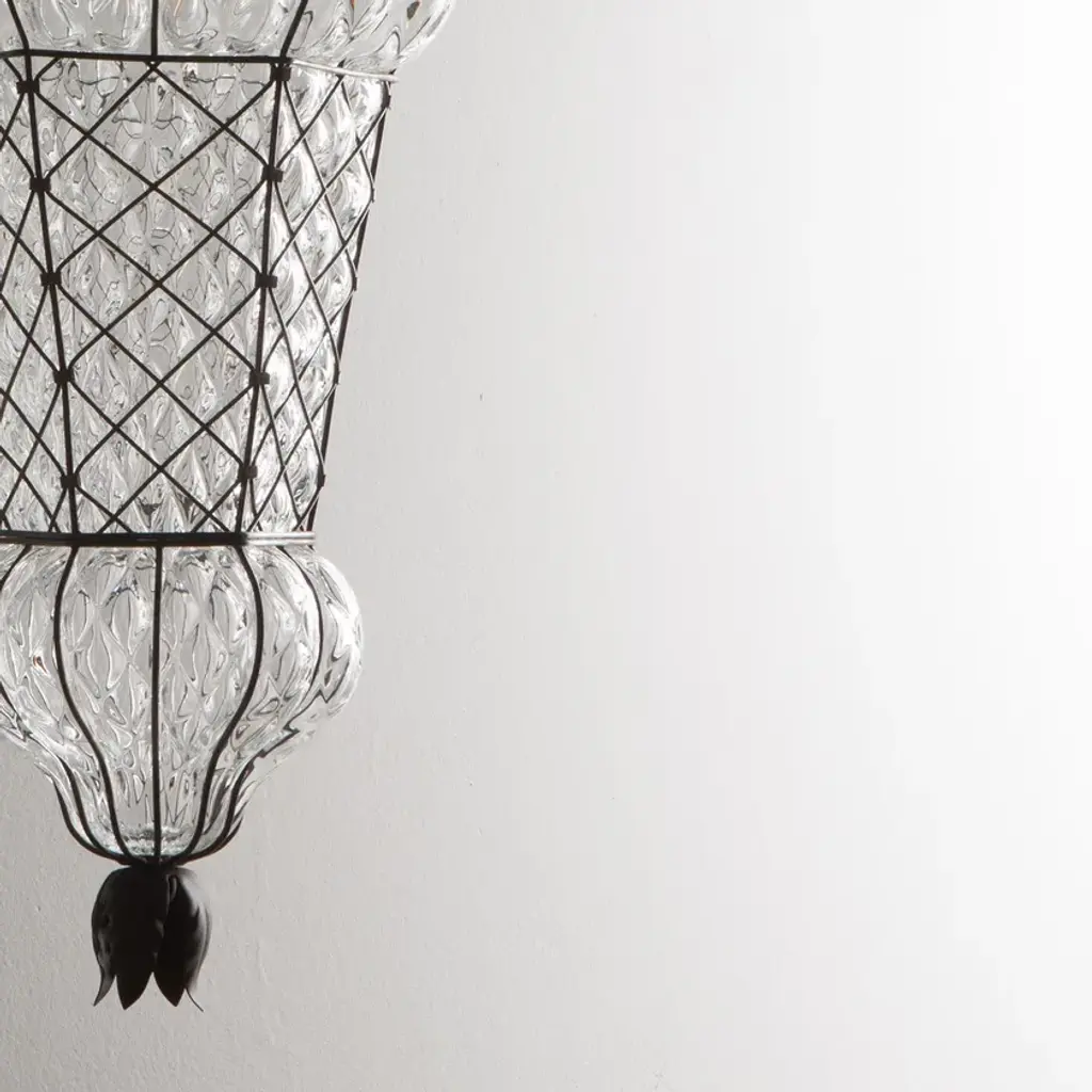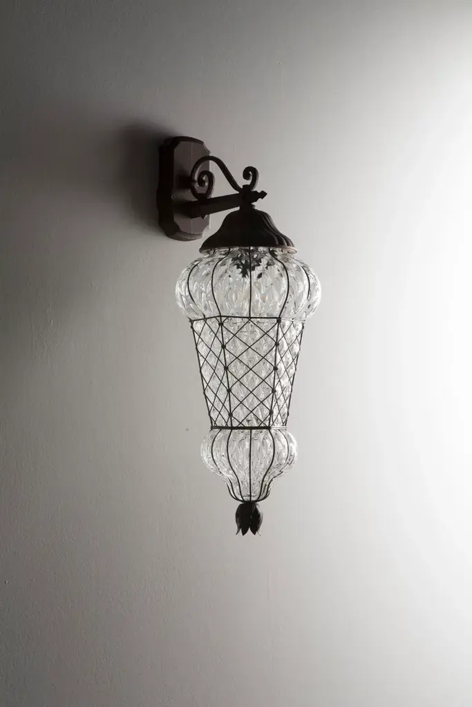 Murano glass wall light.It has an extremely classical Arabic style line.The end pieces are constructed from a braided wire leaving full freedom to the glass to show its roundness.A diameter-2 shaped network imprisons glass forcing it into a regular shape.