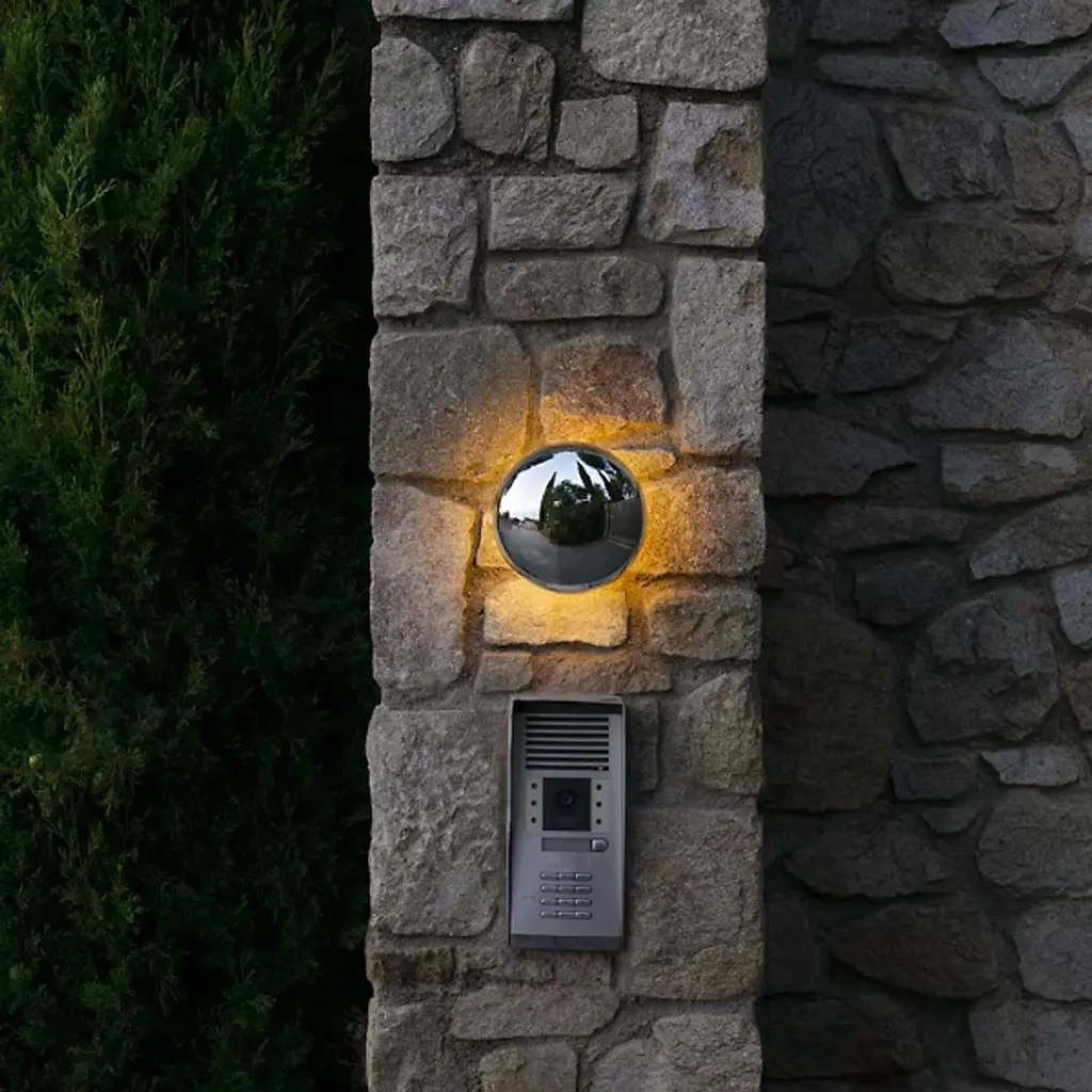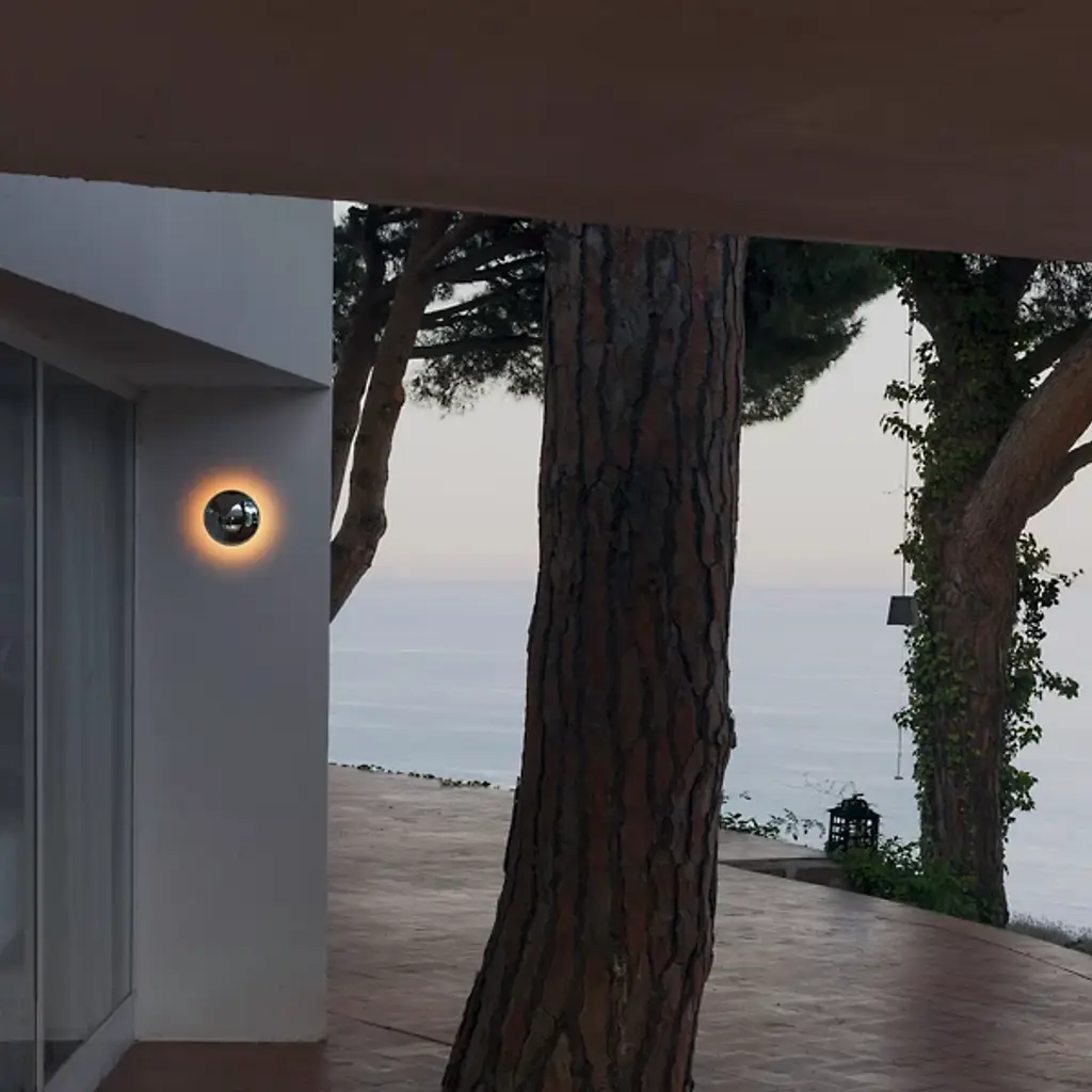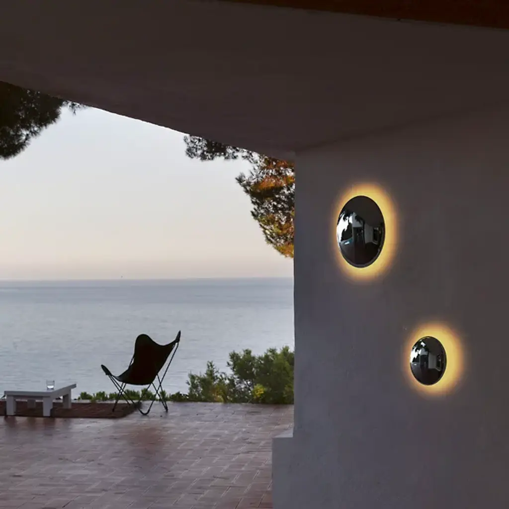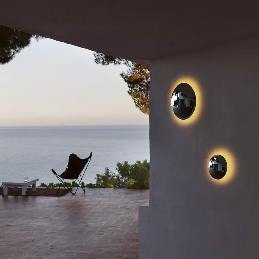 The Babila outdoor wall sconce projects indirect ambient light creating a gentle aura as light and shadow contrast against the rounded metal shade. An energy efficient LED source directs light on the wall behind the sconce providing pleasant illumination as the day turns into night. The polished option acts as a mirror reflecting the surroundings.