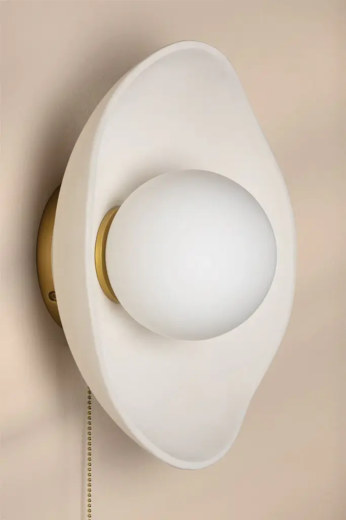 Bacia, meaning bowl in Portuguese, features a matte white ceramic shade delicately surrounding an opal matte globe. A beaded Aged brass pull chain is capped by a white ceramic accent. The all-white tones and soft matte finish add to this sconce's simple, subtle and adaptive nature, making it just as comfortable in a rustic farmhouse kitchen as in a clean, modern living room.