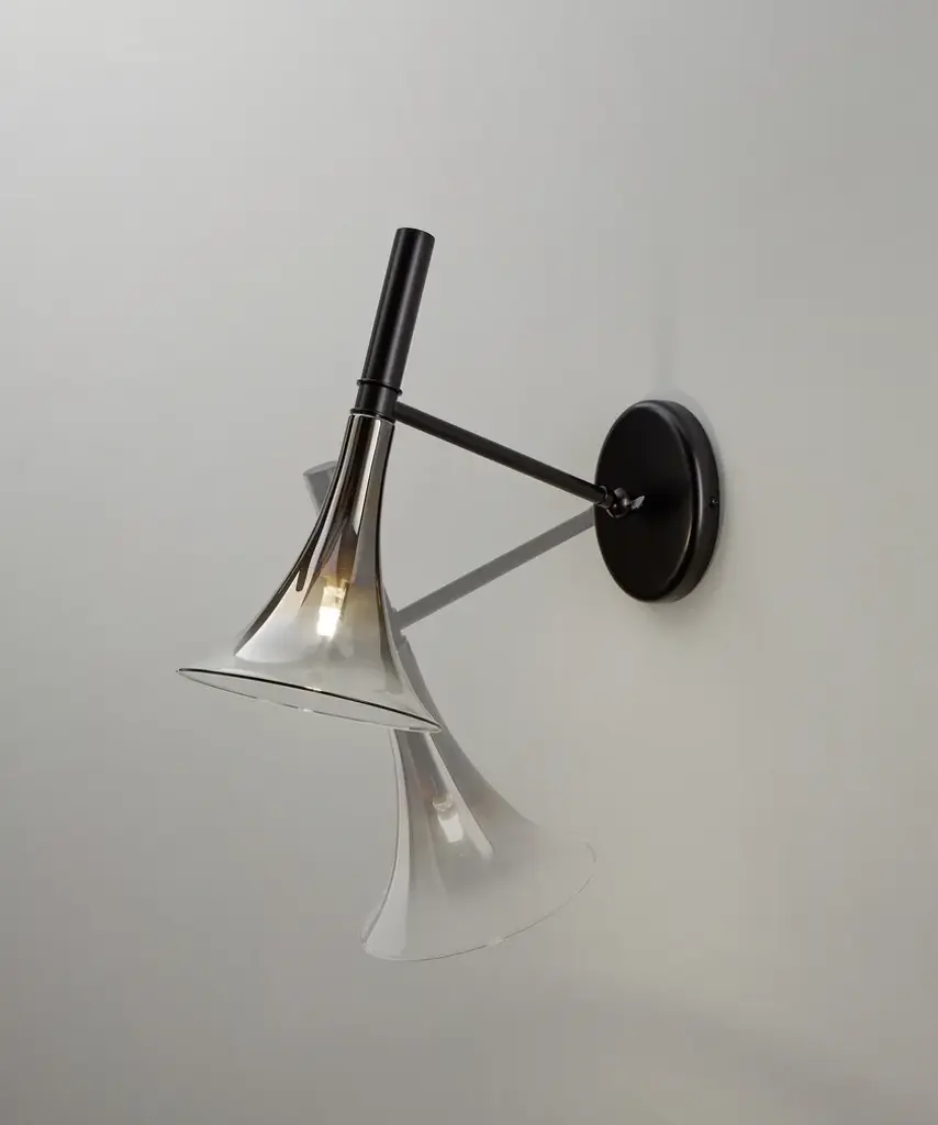 Baffo is an adjustable wall lamp with titanium or gold shiny coating or white fading blown glass. Metal structure FINISHES: Fumè+White/B LED BULB: 1 x 6w - E14A> A++IP20INDOORON REQUEST DIMMABLE WITH: TRIACCERTIFICATION: CE/EACWEIGHT: 4 KGùThe new wall lamp version joins the successful family of Baffo: a versatile orientable sconce suitable for creating a perfect harmony with the surrounding elements.