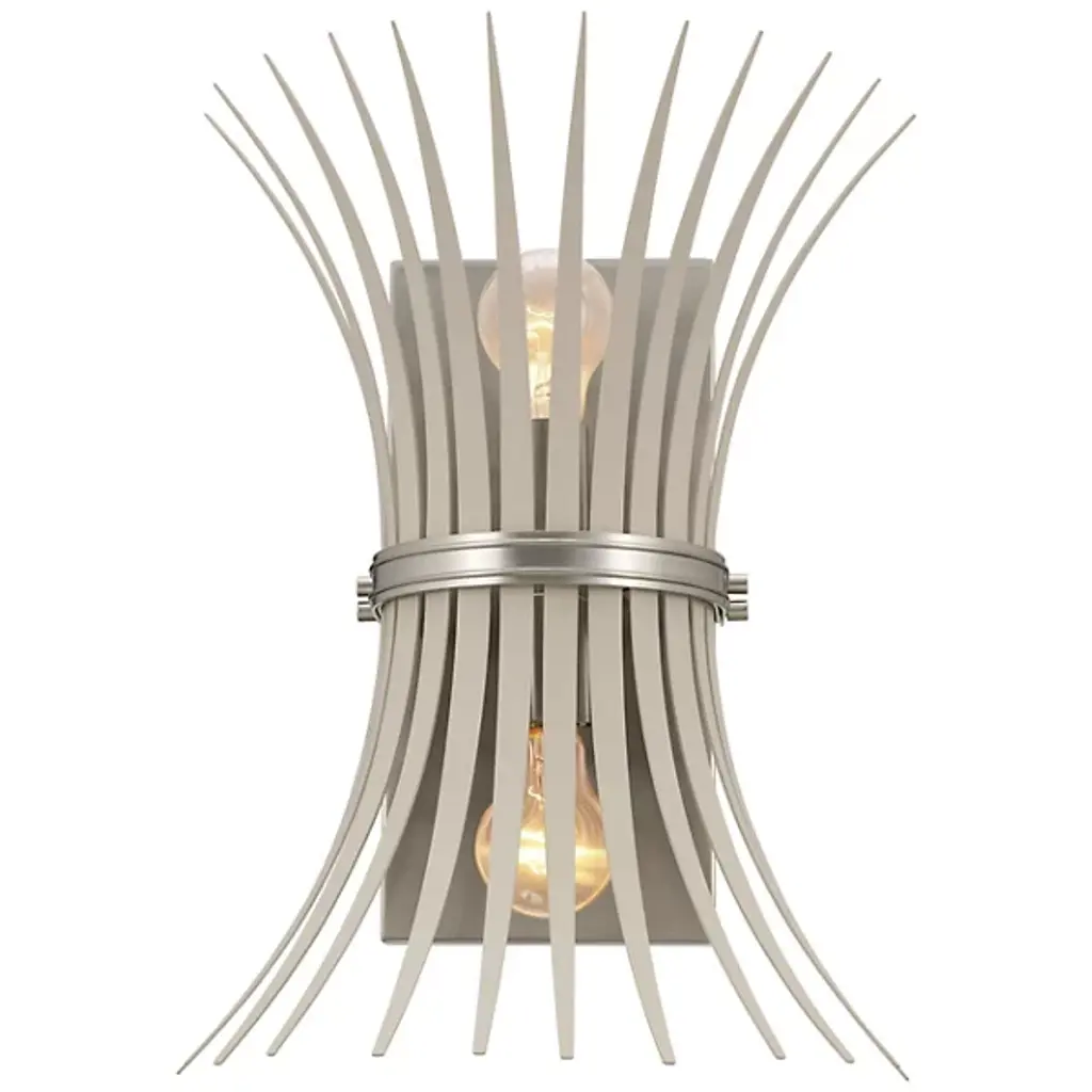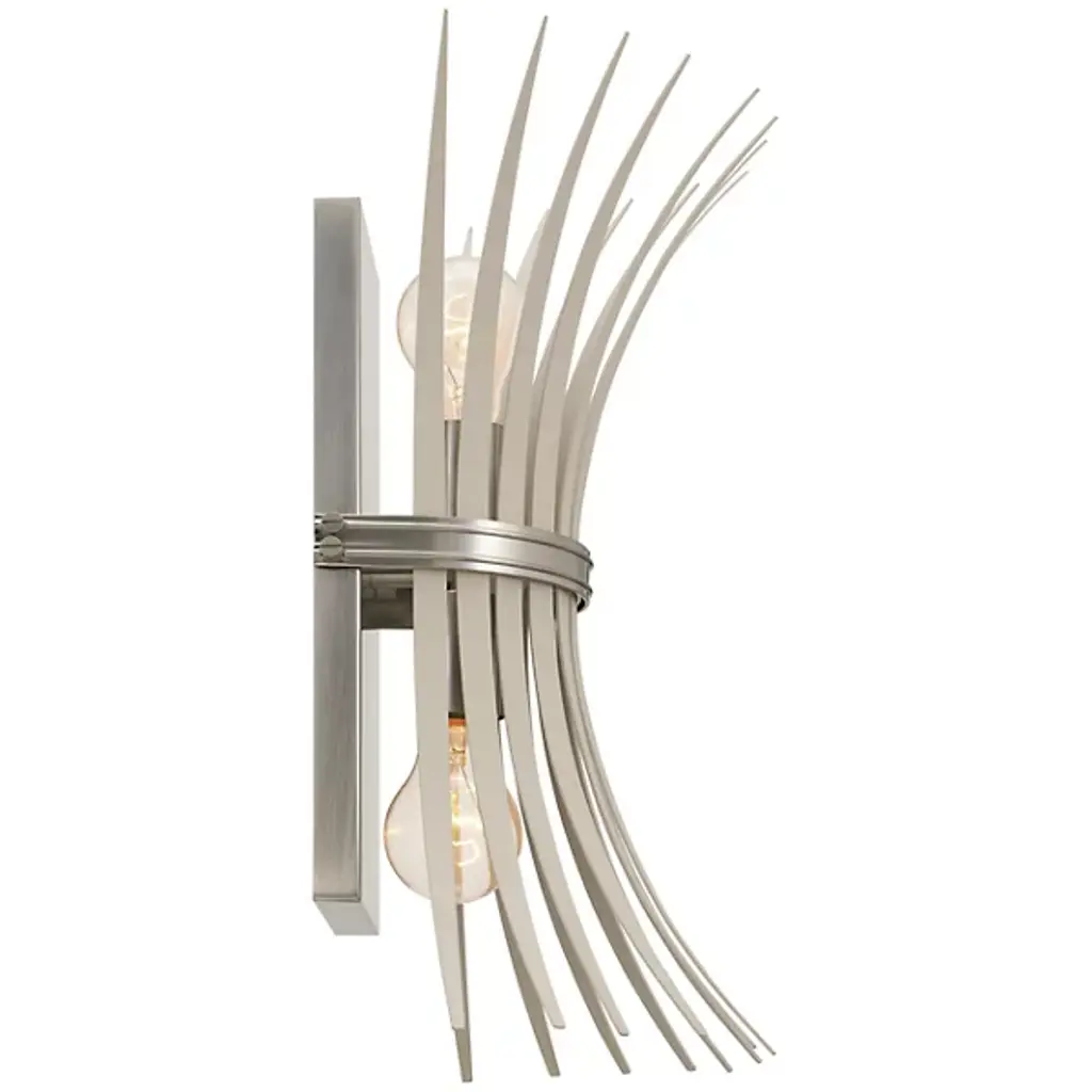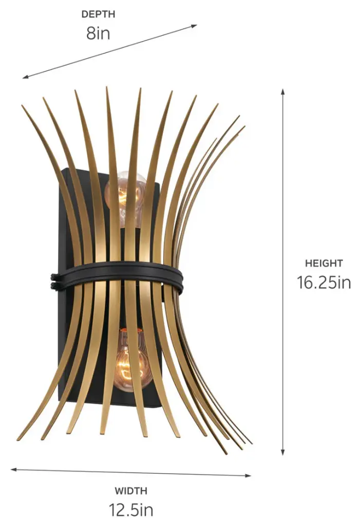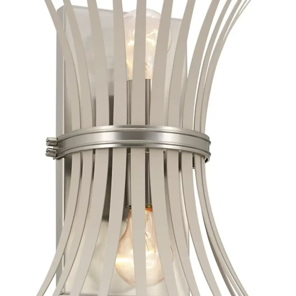Let the Baile Wall Sconce by Kichler Illuminate your home. Crafted with the quintessential, pointed strand formation prevalent throughout the Baile family of light fixtures, this wall sconce boasts an elegant steel ring that is secured by a rectangular backplate at your wall. Aligned with this backplate are incandescent bulbs neatly encased. Both bulbs are vertically positioned, with one bulb at the sconce’s summit and the other at the bottom. This wall-mounted furnishment brings light to your 21st-century entryways and walkways.