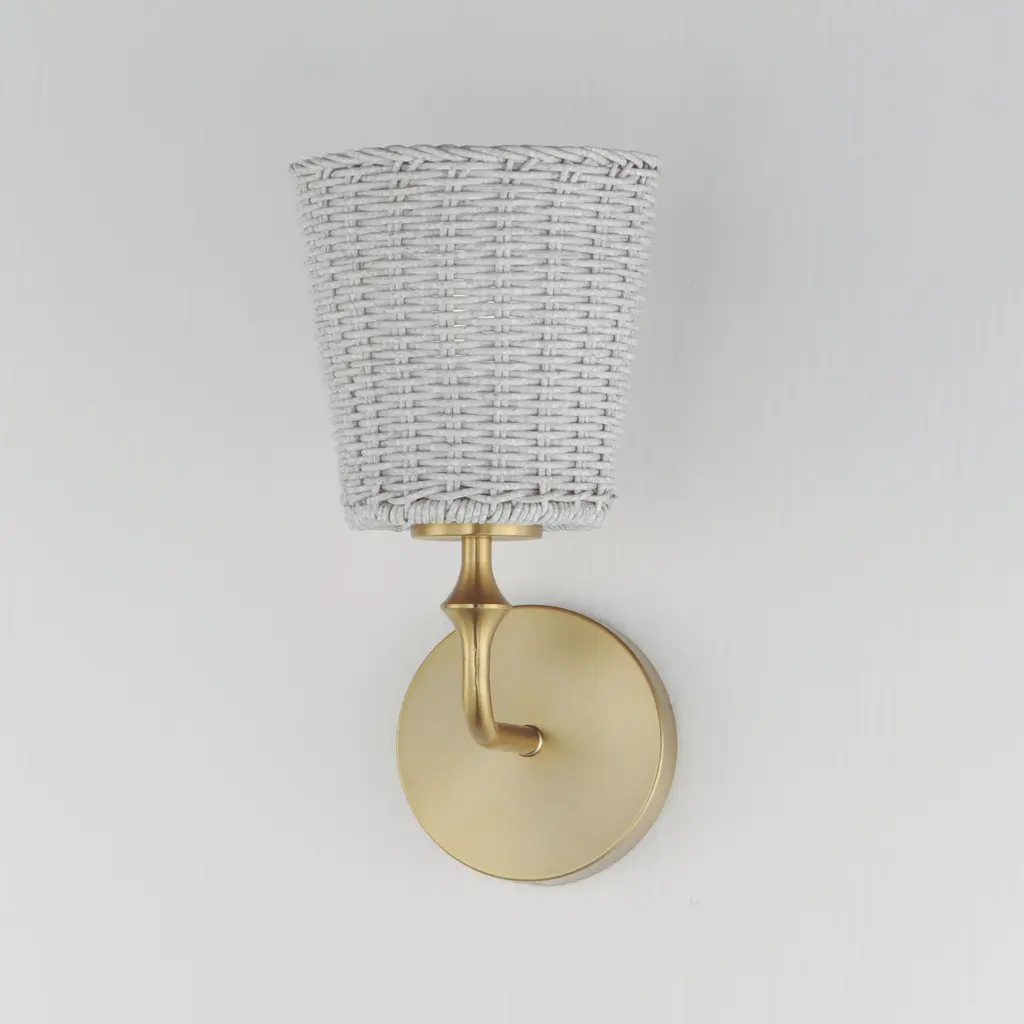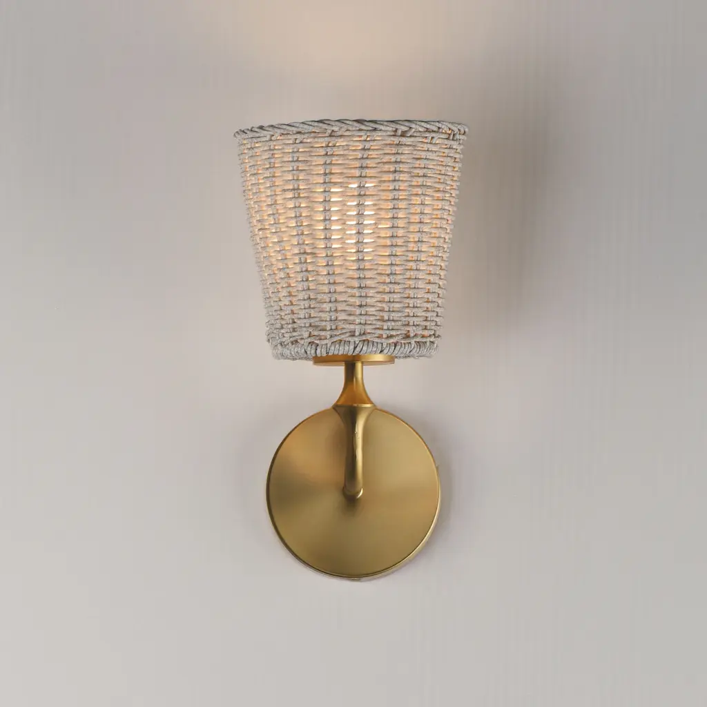 Featuring wicker shades made of synthetic rattan, this bath vanity lighting collection brings an elegant coastal flair to your space. Choose from a Natural wicker finish with a Dark Bronze frame accented by brushed golden highlights, or a Weathered White rattan with a Natural Aged Brass frame for a timelessly elegant composition.