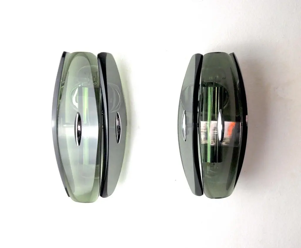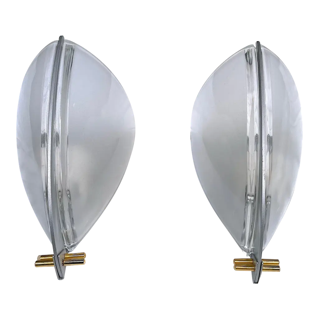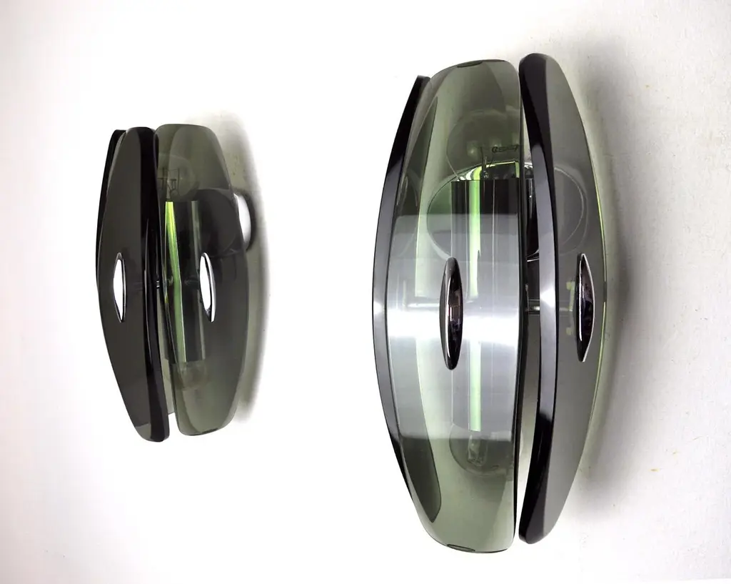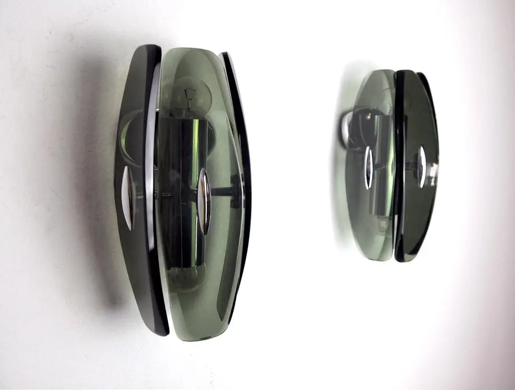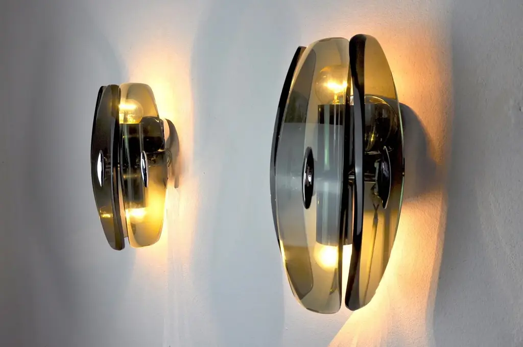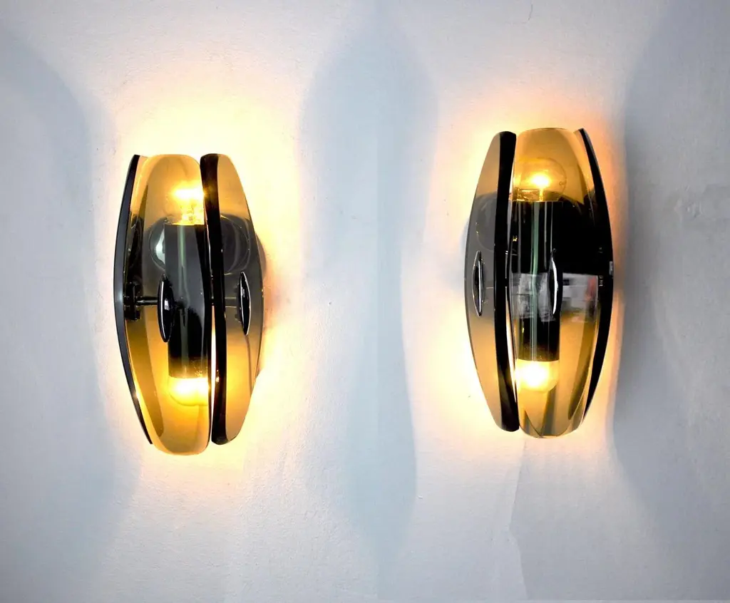 Very nice pair of Veca wall lights produced in Italy in the 70s. Wall lights made up of brown cut bakelite plates and a chrome structure. Unique object that will illuminate wonderfully and bring a real design touch to your interior. Electricity checked, perfect state of conservation. This piece is attributed to the mentioned designer/maker. It has no attribution mark and no official proof of authenticity, however it is well documented in design history. I take full responsibility for any authenticity issues arising from misattribution, European Plug (up to 250V).The wiring of this item may be original and might need replacement, if not specified otherwise.