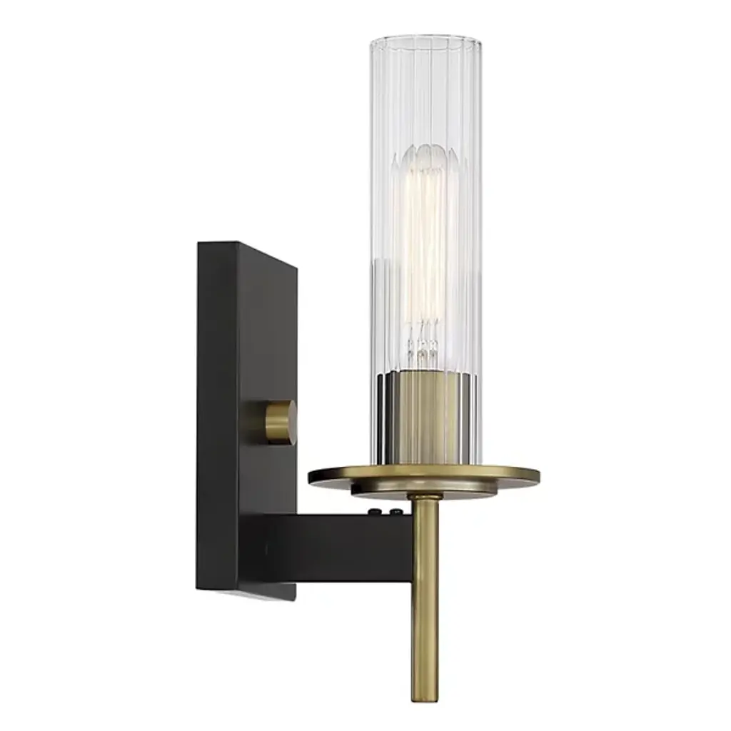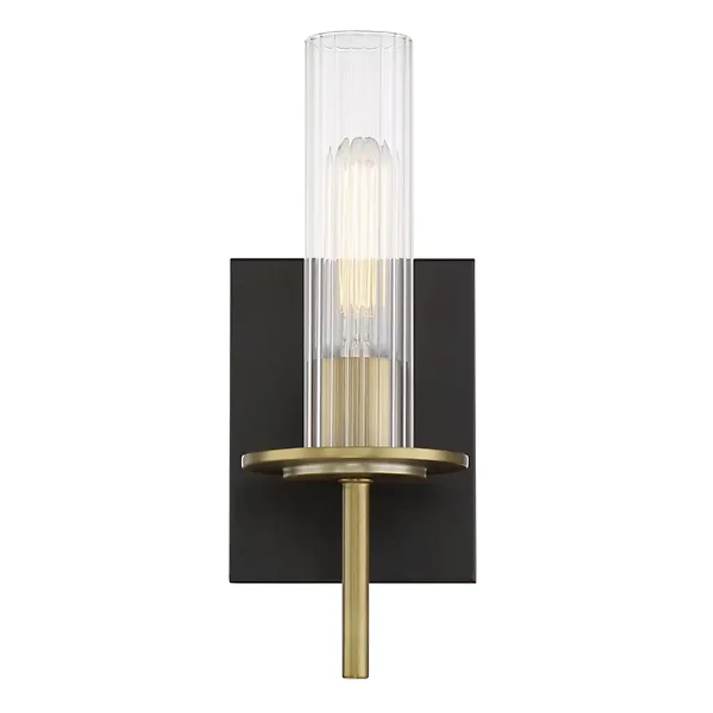 Stark, stylish and simple, the Baldwin Park Bath Wall Sconce from Minka-Lavery adds an inspired retro accent to interior walls. A rectangular wall plate keeps the fixture in place, offset by a round central accent and extending a horizontal crossbar from its lower edge. It also secures a slim stem and stepped bobeche that blooms a vintage candelabra lamp within a contoured shade of clear ribbed glass and glitters out with welcome warmth.