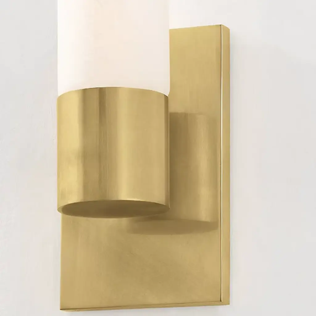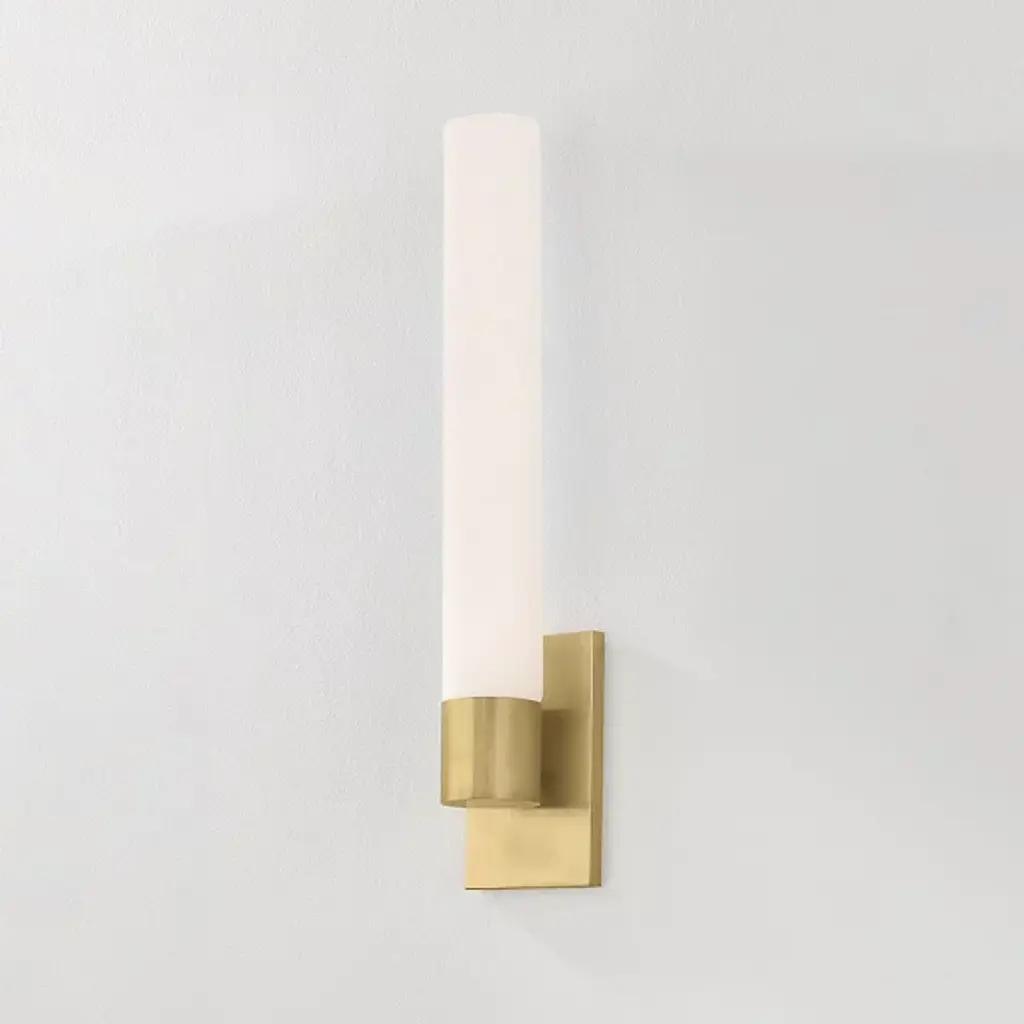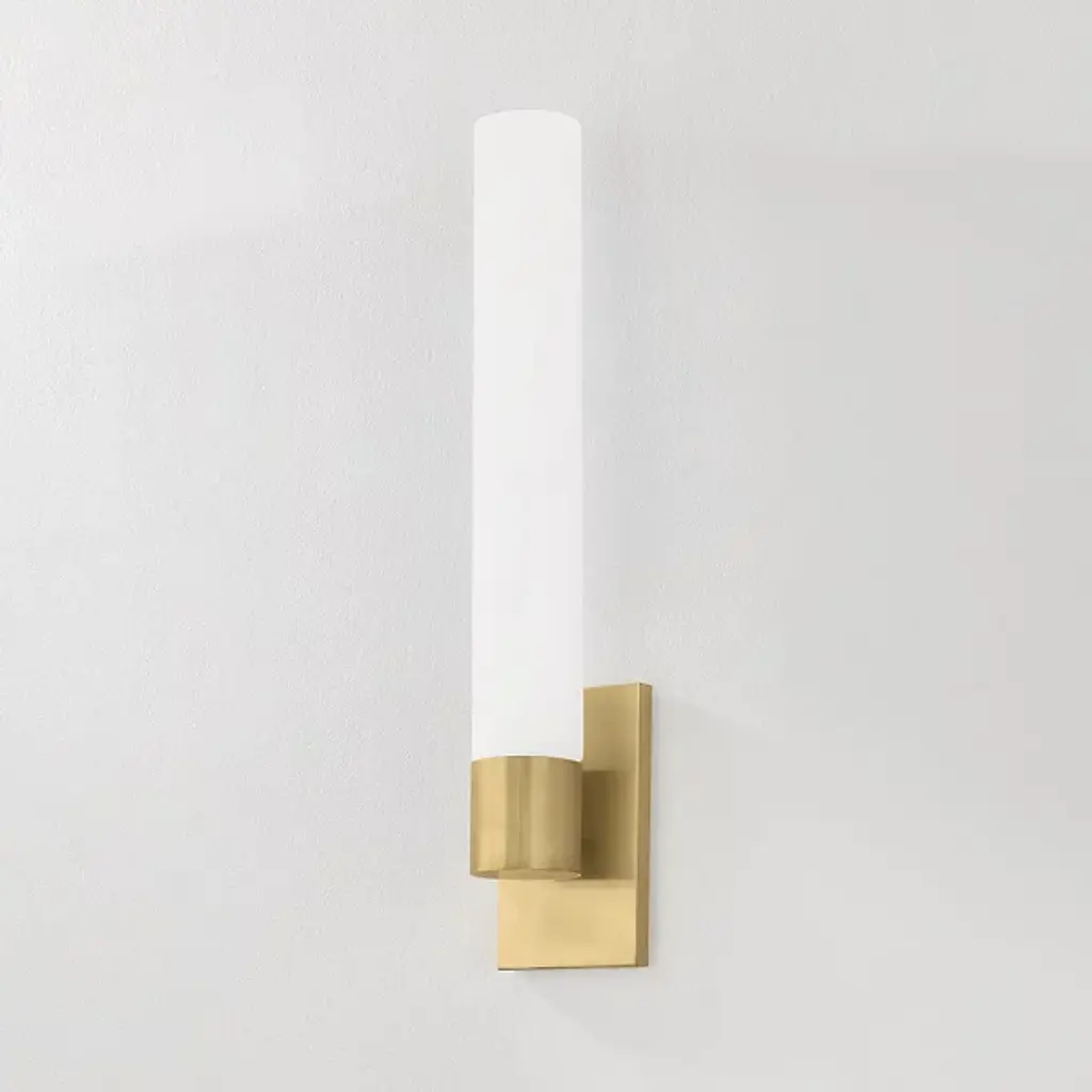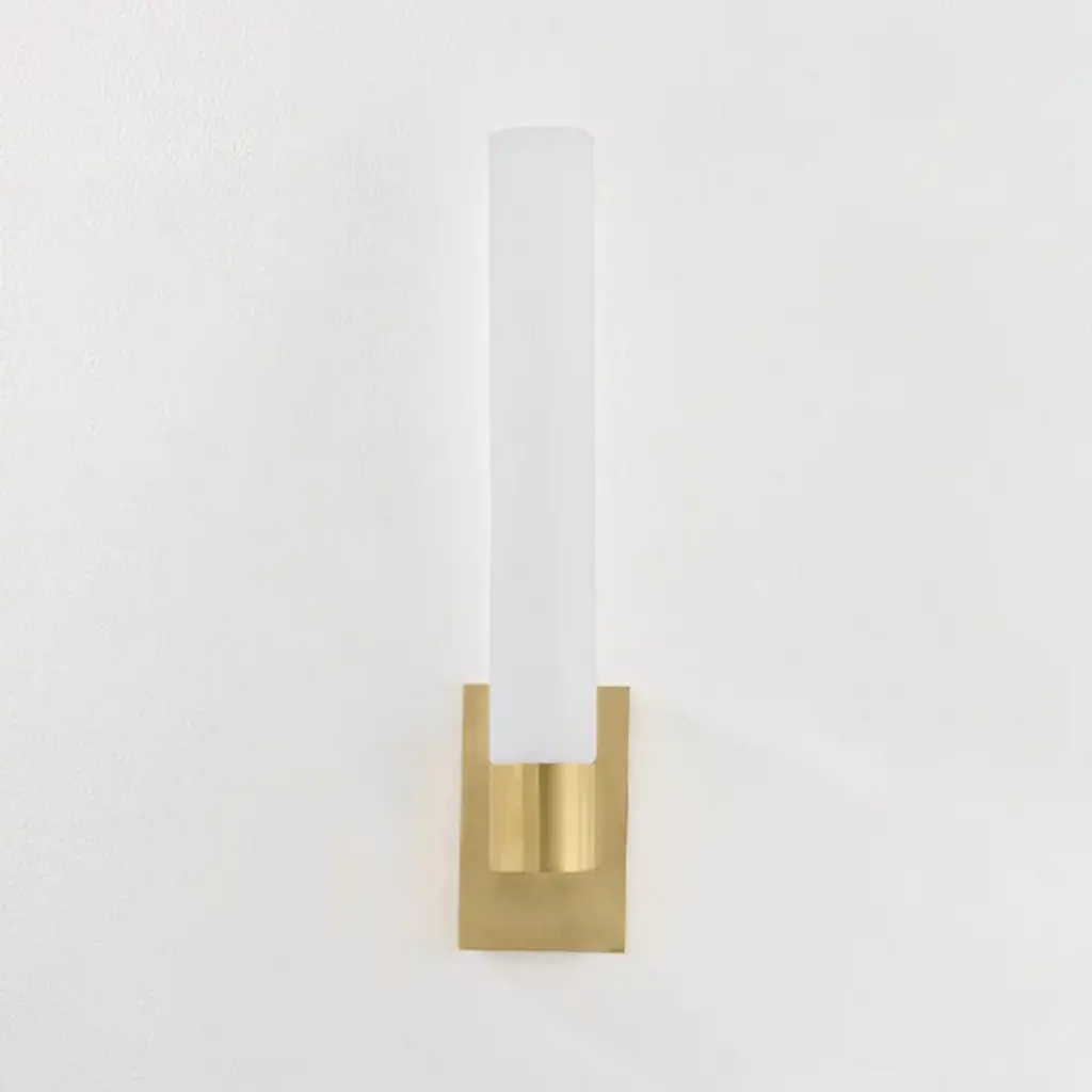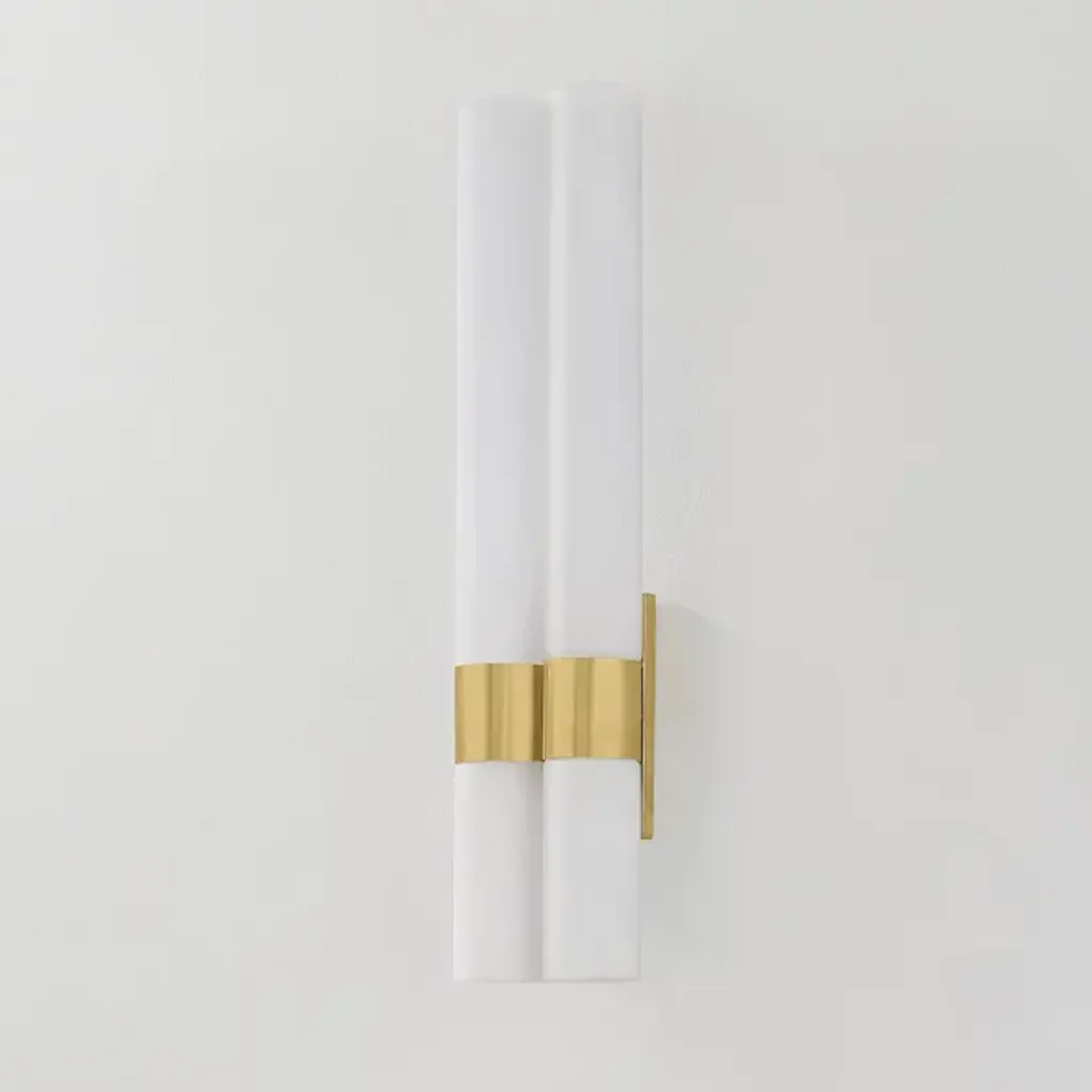 The Balema LED Wall Sconce from Corbett Lighting delivers light through a single cylindrical tube anchored by a refined brass mounting system. An LED core illuminates the matte cloud glass evenly, highlighting the delicate veining patterns within. A rectangular backplate provides stable support while complementing the vertical orientation of the design. This balanced LED wall fixture offers everyday illumination that works equally well in bathrooms, hallways, or anywhere needing focused lighting.
