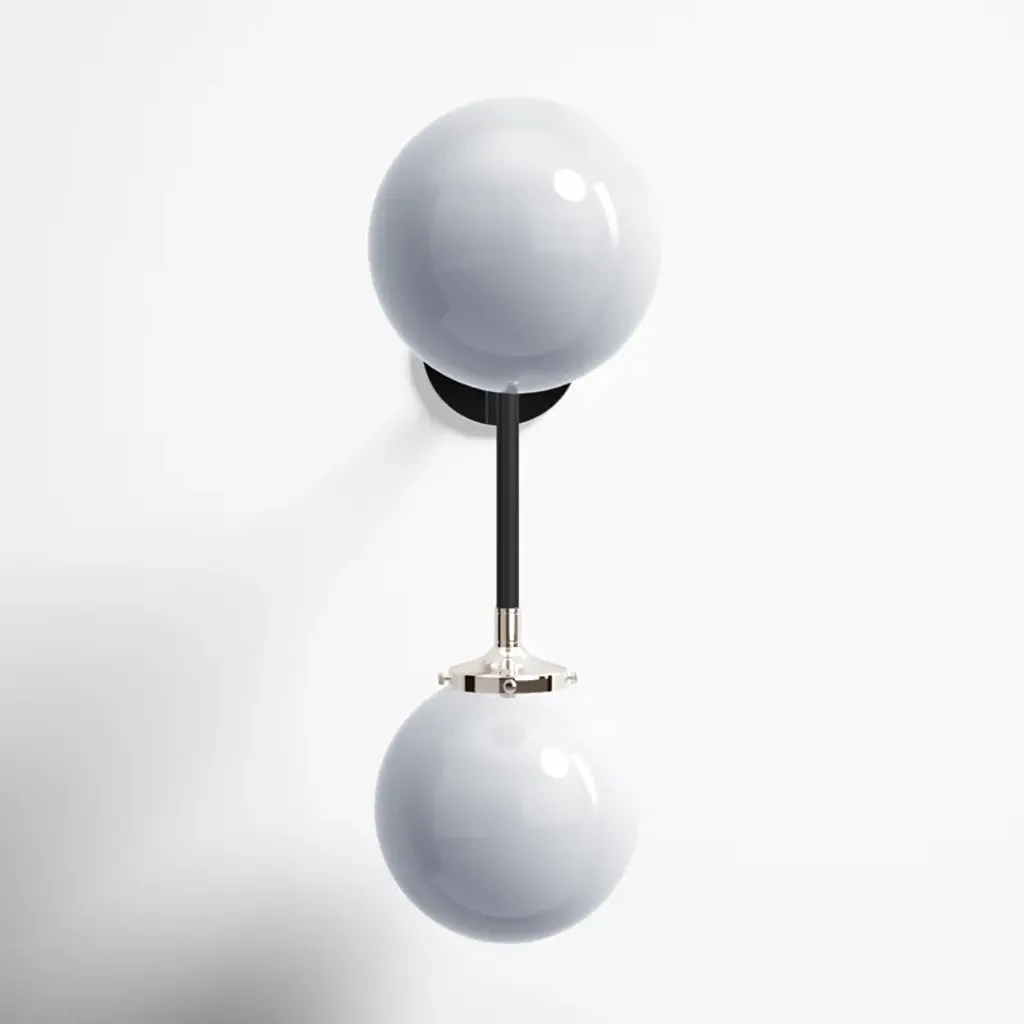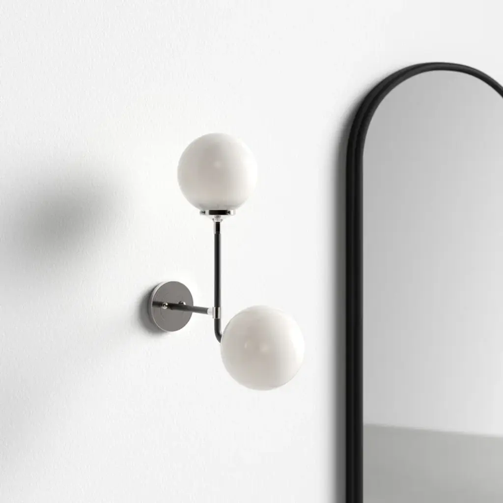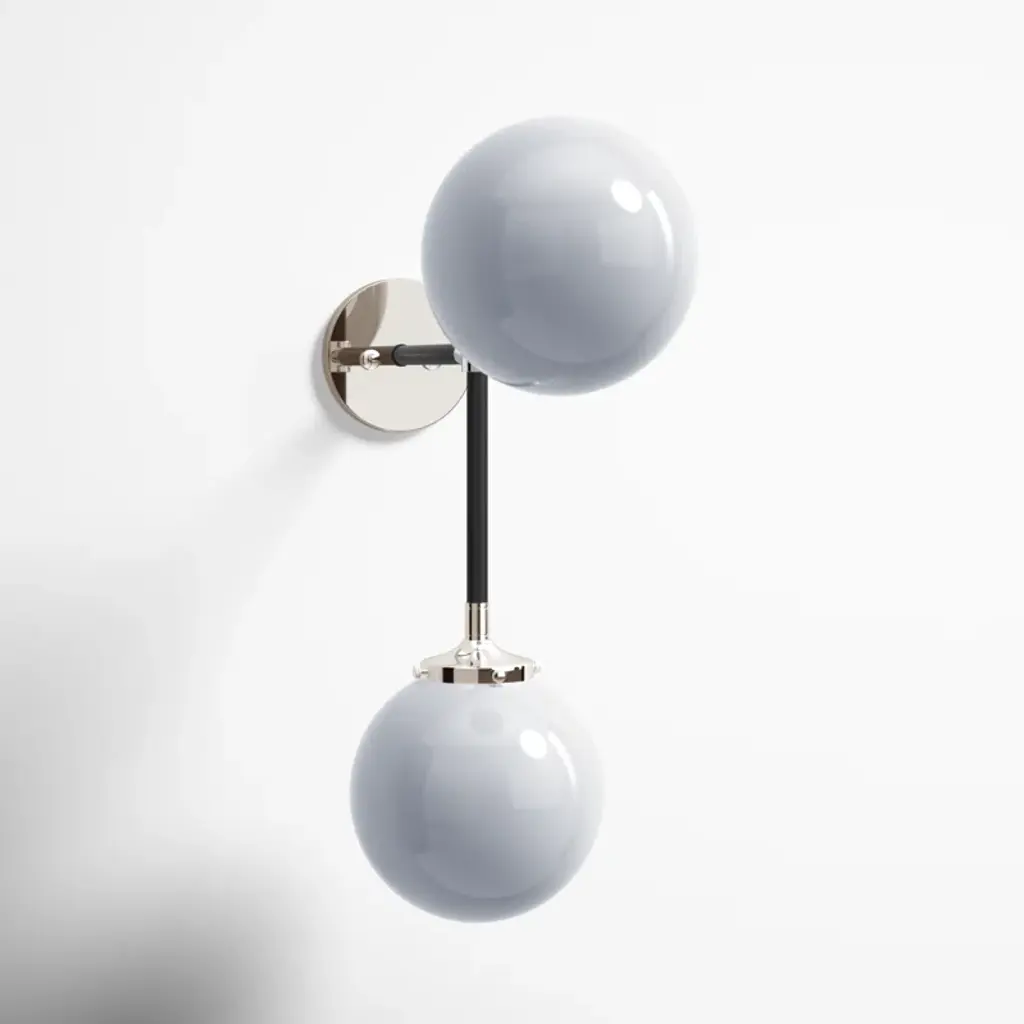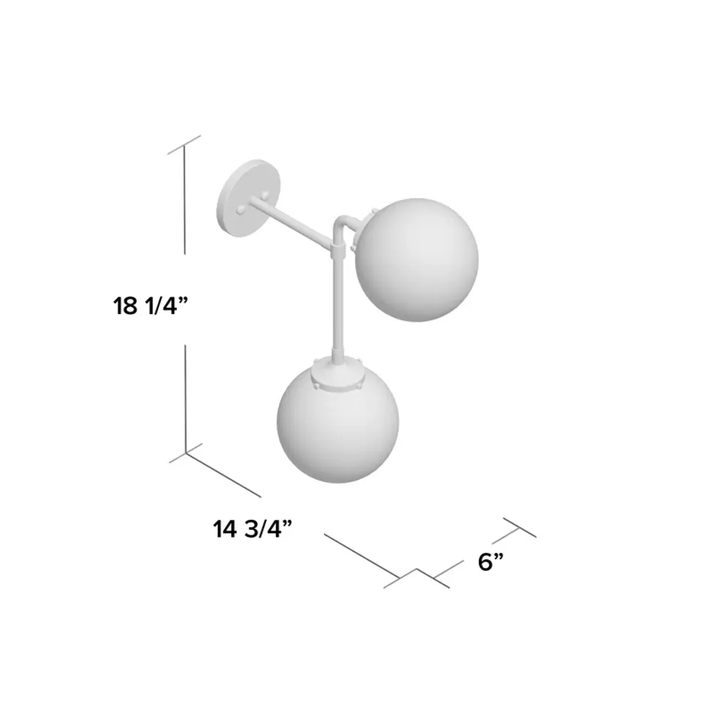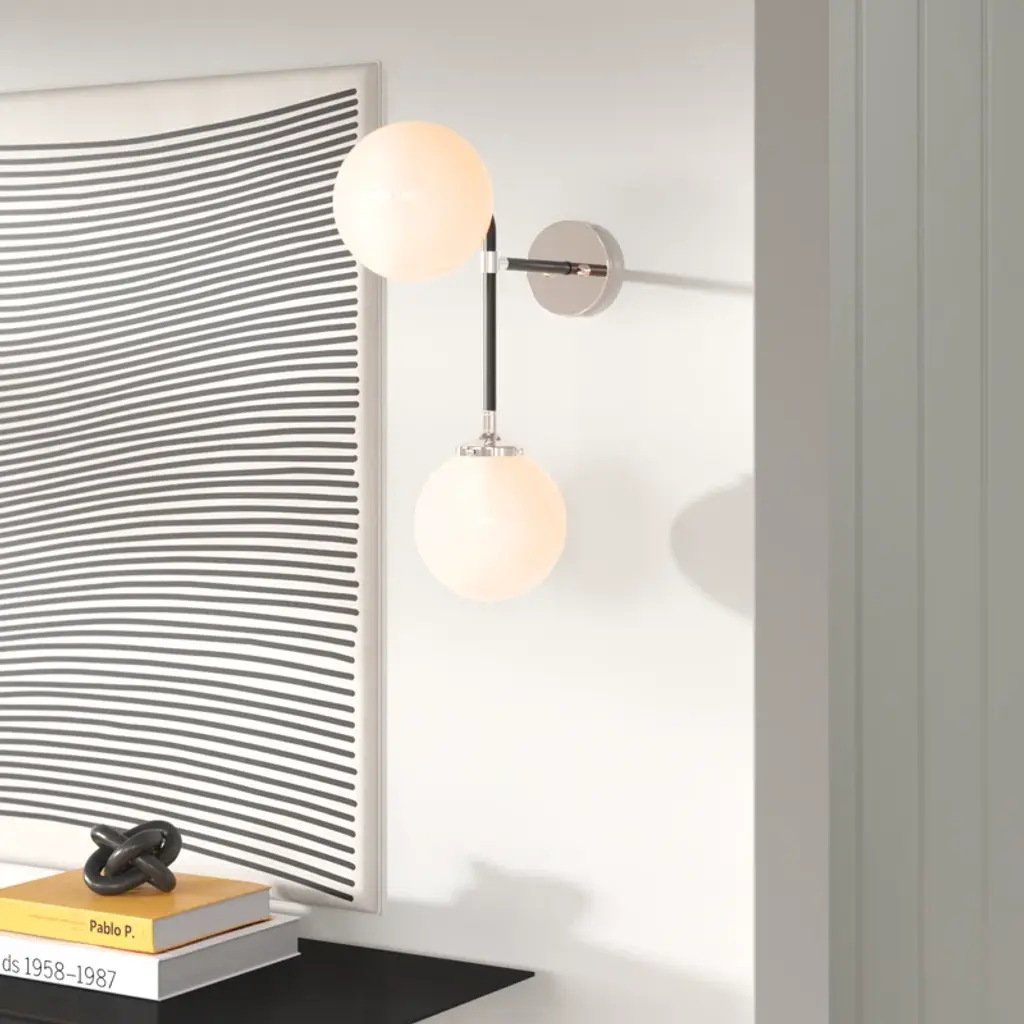 This double-light wall sconce pairs two of our favorite mid-century-inspired trends in lighting: Oversized globe shades, and industrial-style pipe arms. This sconce has a circular backplate that supports its L-shaped arm, and is plated in a black and nickel finish. There are two frosted globe shades at the end of each arm, giving this piece an iconic mid-century silhouette we're all about. Plus, that frosting helps diffuse the light of the 40W bulbs (sold separately) evenly.