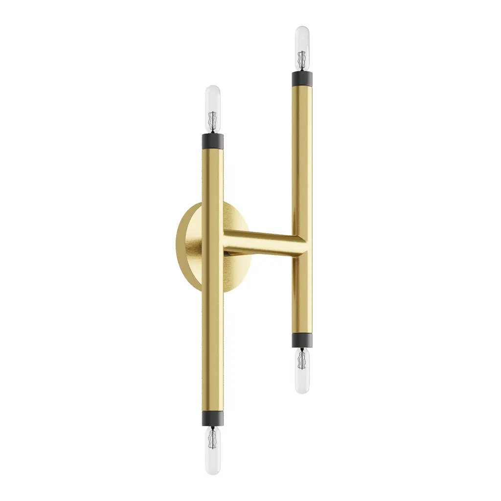 The staggered bars of our sleek Ballard add an industrial charm offset with a two-tone finish. Crafted of antique brass-plated iron with bronze accents, its intriguing form recalls the linear spacing between bricks. This clever tubular design can also be mounted as a sconce. Damp-rated, although limited covered outdoor conditions may affect finish.