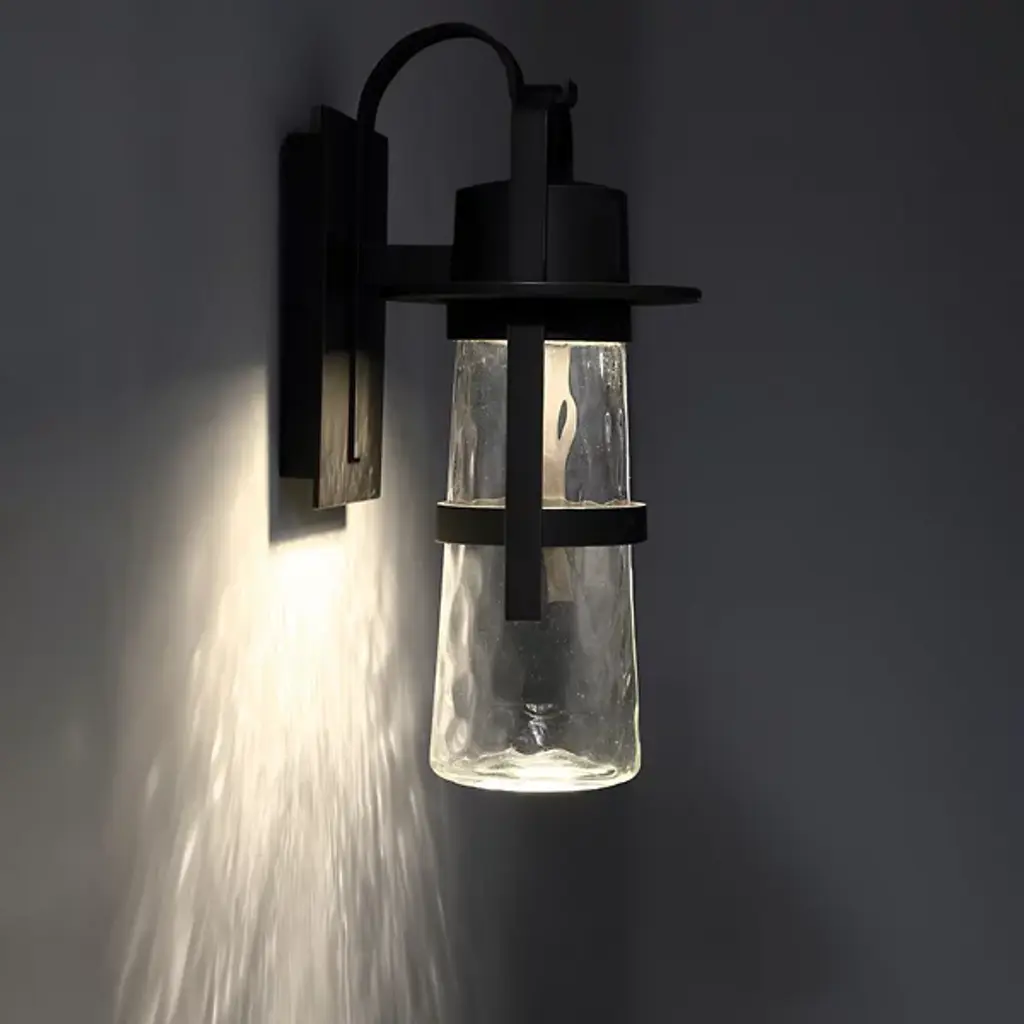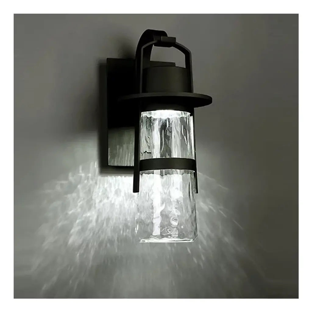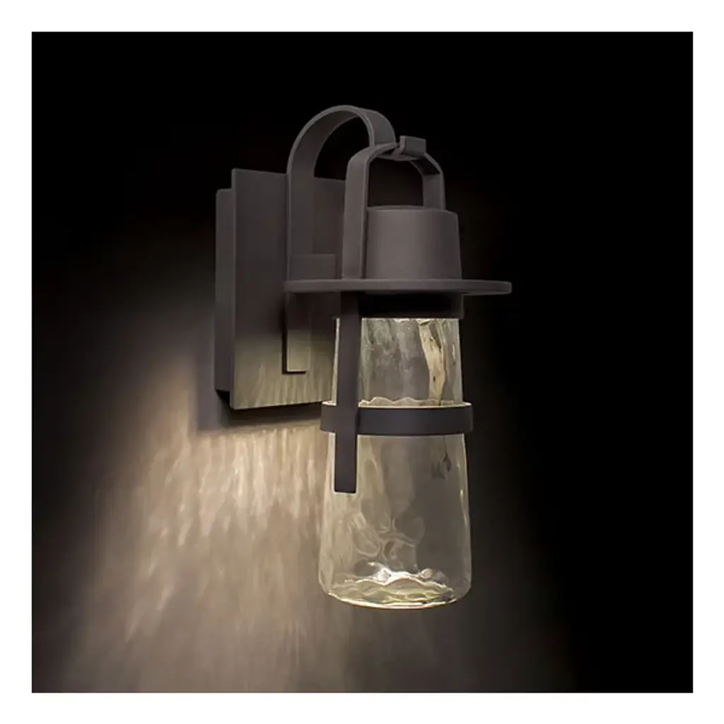 The Balthus Indoor/Outdoor Wall Sconce from Modern Forms draws inspiration from traditional lantern design while incorporating LED technology. Developed in 2015, this piece features an arched arm that extends from the wall to support a hooded structure containing the light source. The mouth-blown, hammered glass shade creates textural light patterns when illuminated, while the aluminum construction provides weather resistance for exterior installations. The cylindrical clear glass allows the LED to project downward while the hood prevents upward light pollution, making it suitable for environmentally conscious outdoor lighting.