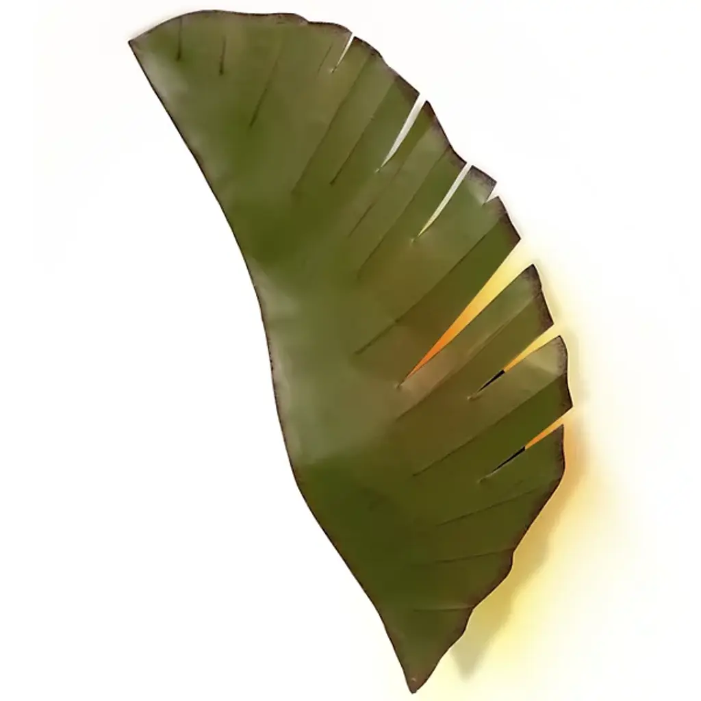 The Varaluz Banana Leaf 2-Light Wall Sconce beautifully replicates the shape and detailing of a banana leaf as it surrounds and hides the inner light source. Light peeks out around the sides, creating lovely ambiance and further emphasizing the shade's fine details. Made out of hand-forged recycled steel.