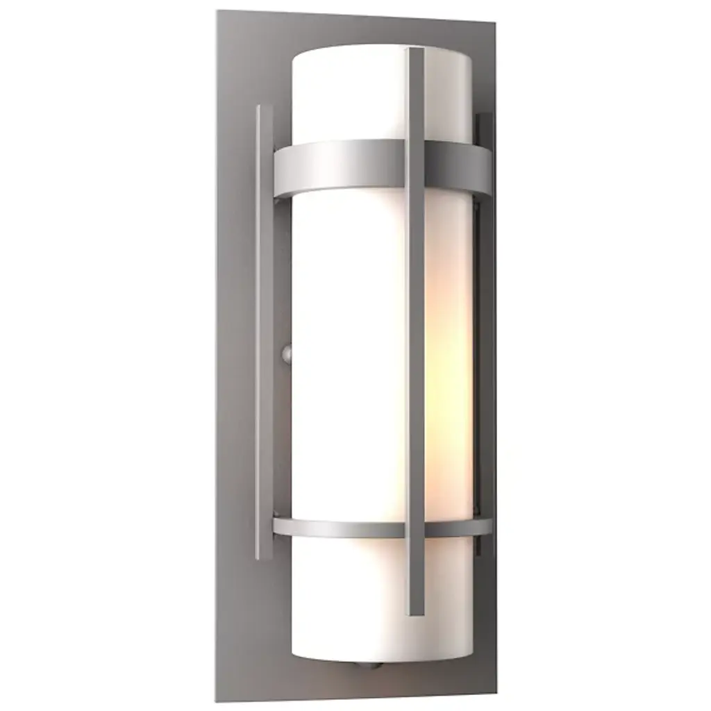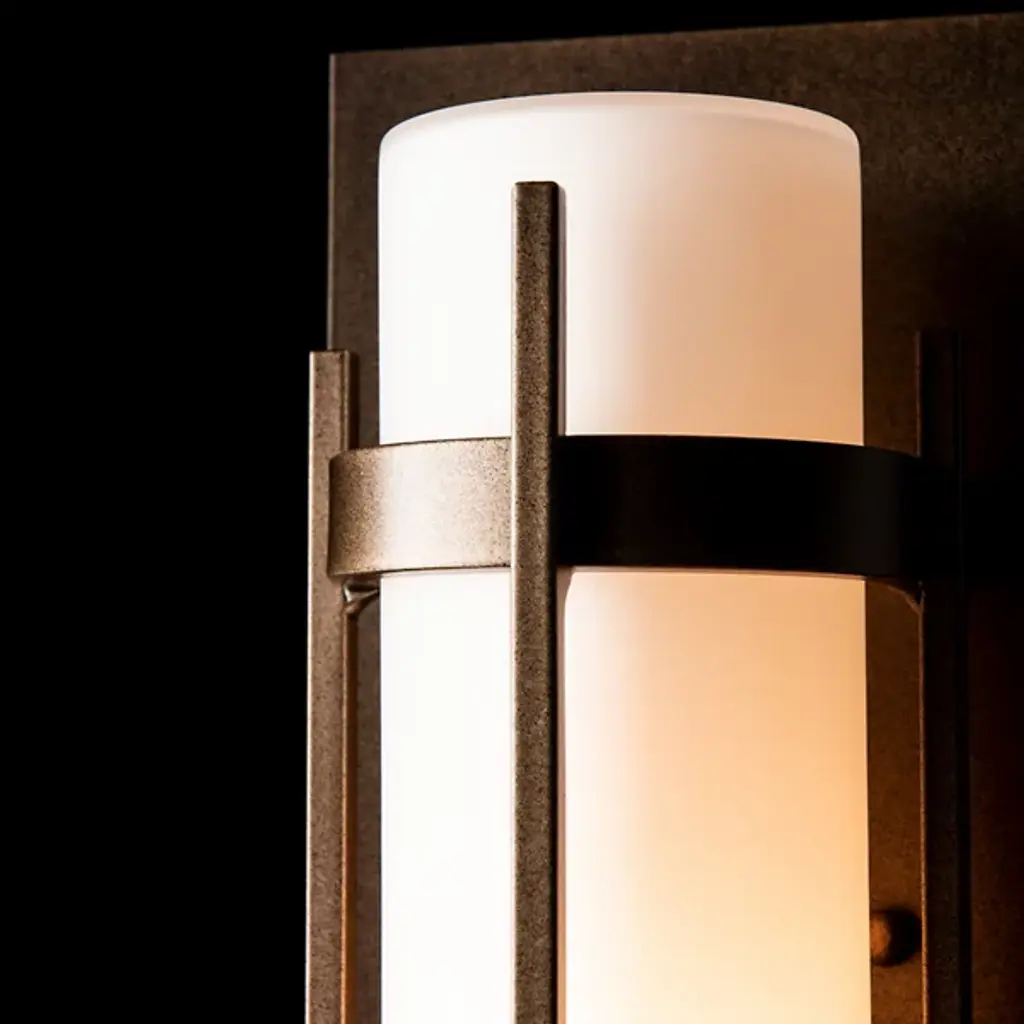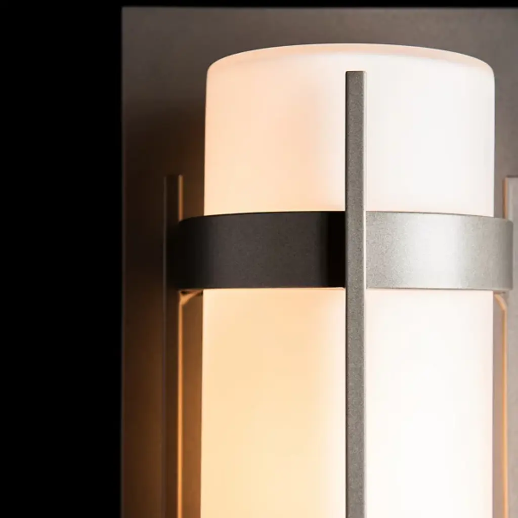 An enduring design that is in equal parts classic and modern. The Banded Coastal Outdoor Wall Sconce by Hubbardton Forge features a hand-forged aluminum frame that is coated with a coastal finish, making it both durable and safe from harsh outdoor elements. A semi-cylindrical shade crafted from hand-blown glass is held onto the rectangular backplate with two curved bands and slender horizontal rods. When lit, this elegant luminaire beautifully illuminates exterior spaces like patio, porches, and backyards.