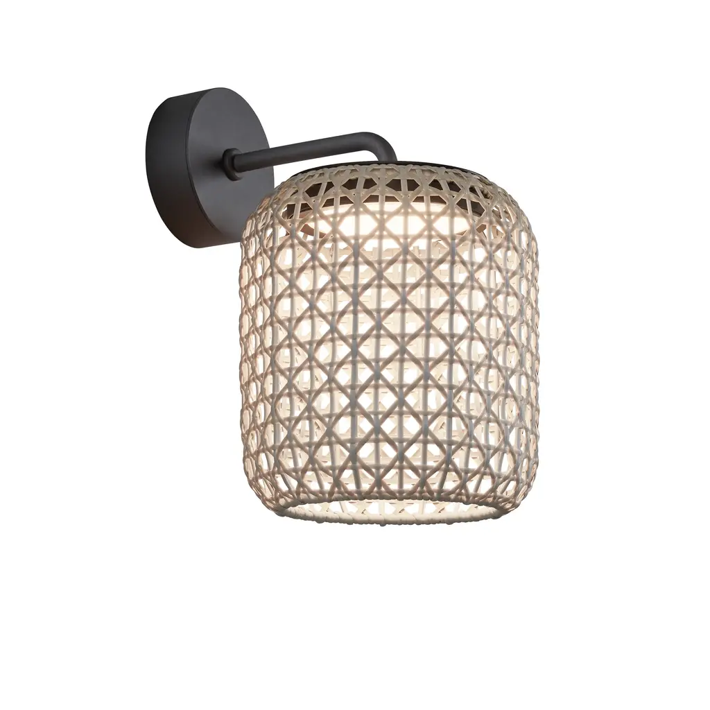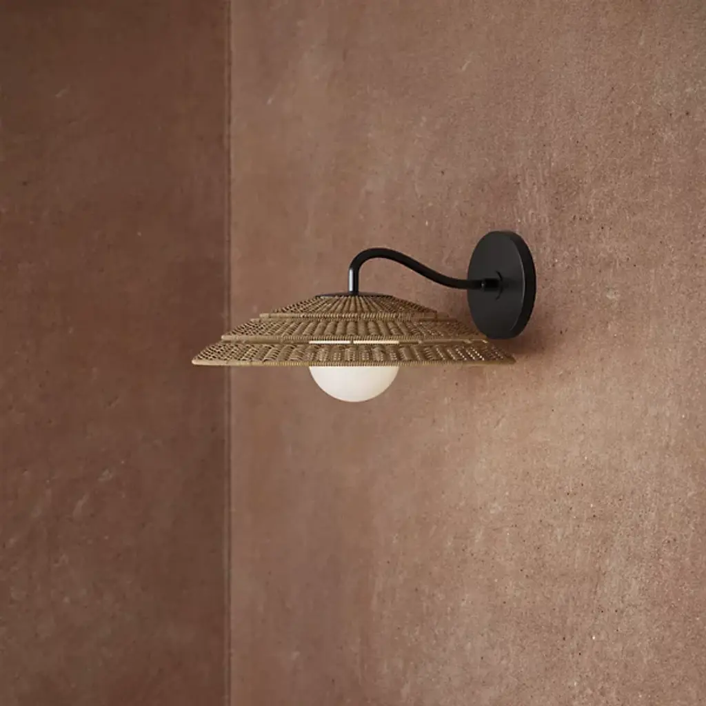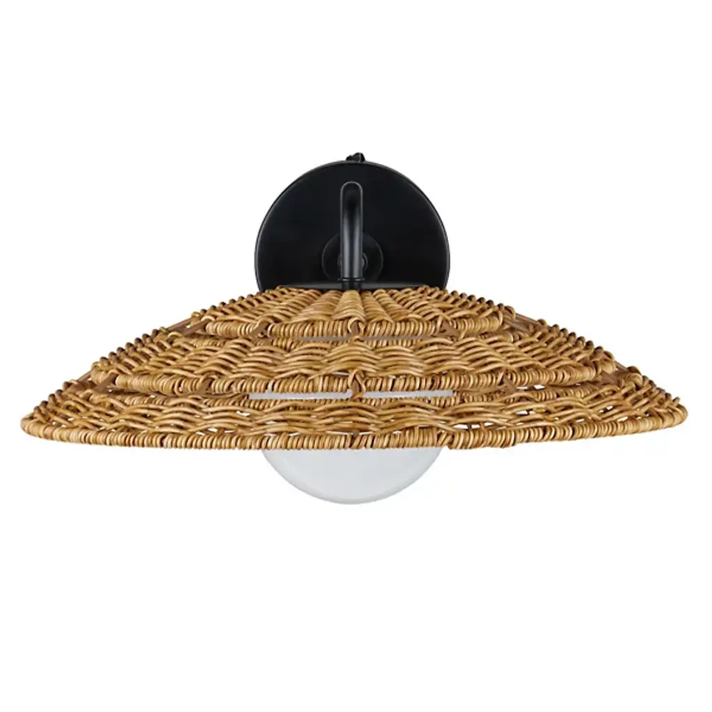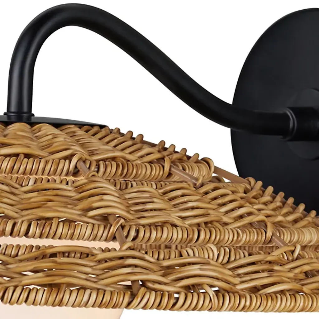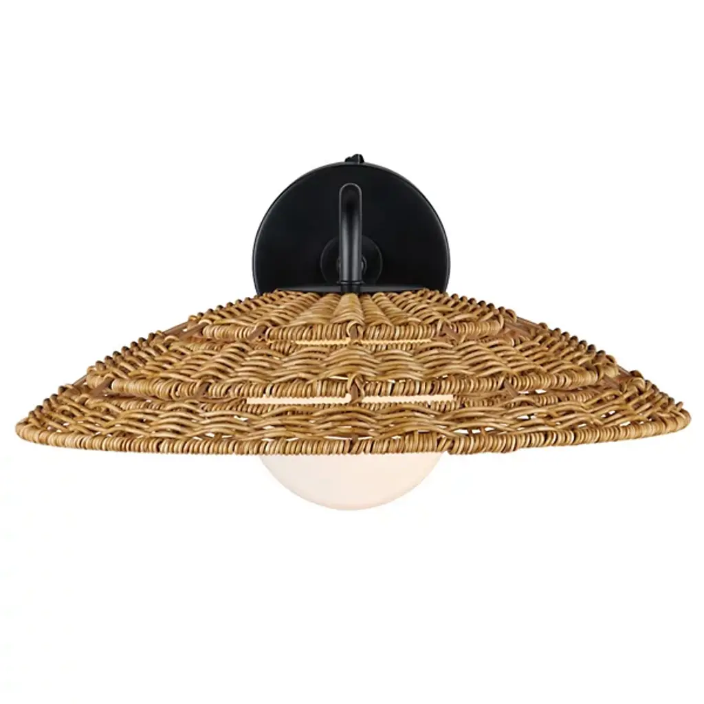 The Barbary Outdoor Wall Sconce from Currey & Company combines handwoven synthetic wicker with durable metal construction for outdoor applications. An inverted bowl-shaped shade showcases uniform weaving that adds texture while maintaining weather resistance. The curved gooseneck arm extends from a circular backplate, positioning the woven shade away from the wall. A milk glass globe glows softly through the central opening in the wicker shade. This dimmable fixture is wet-location tested, making it suitable for covered patios, porches, or entryways where artisanal character meets outdoor resilience and reliable performance.