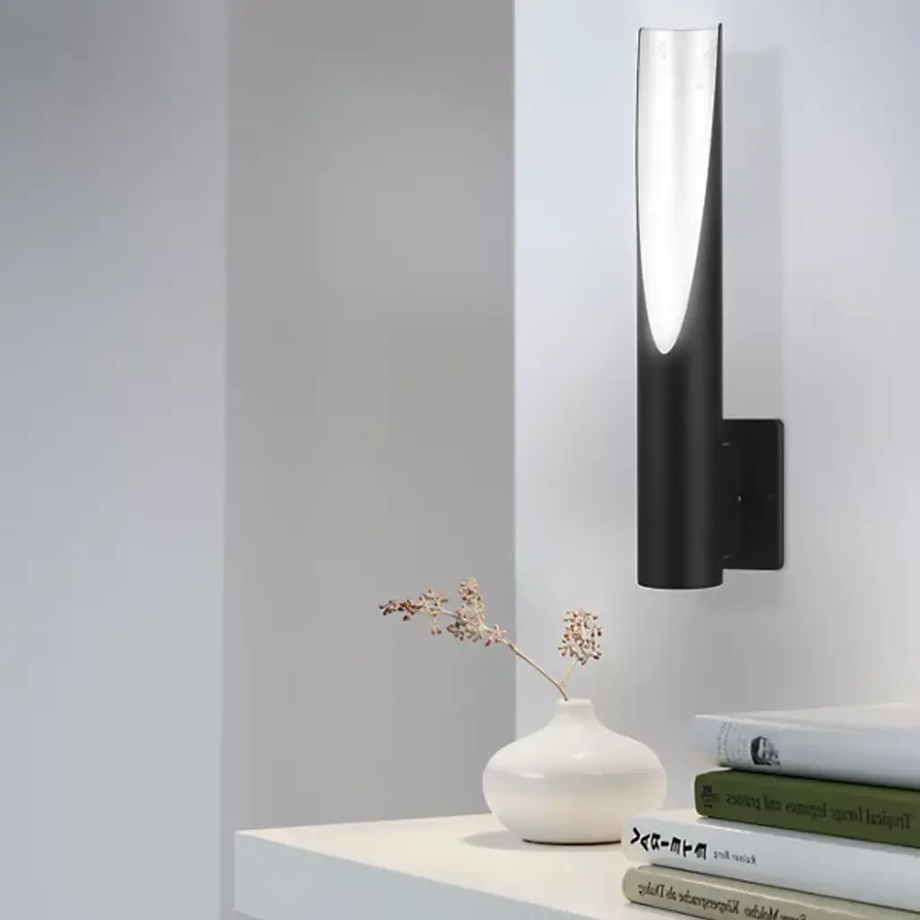 Raise the bar of your interior décor with the simple, sculptural lines of the Barbotto Wall Sconce by Eglo. An intriguing fixture that straddles the line between contemporary and minimalist design, it uses a square wall plate to extend a vertically-held steel cylinder slightly out from its mounting surface. The cylinder itself has a conical cutout expanding as it runs upward, shaping a concave space with a metallic surface that contrasts well with the matte-textured exterior of the rest of the sconce. This reflective channel is home to the sconce’s energy-efficient LED lamping which emits a smooth wash of light up onto the wall.