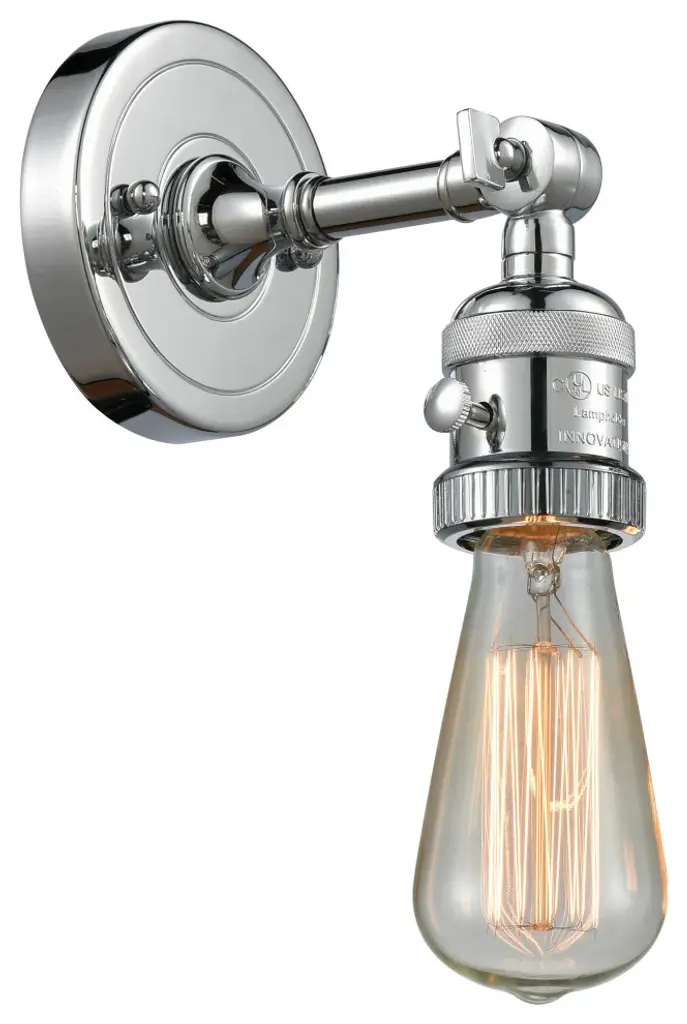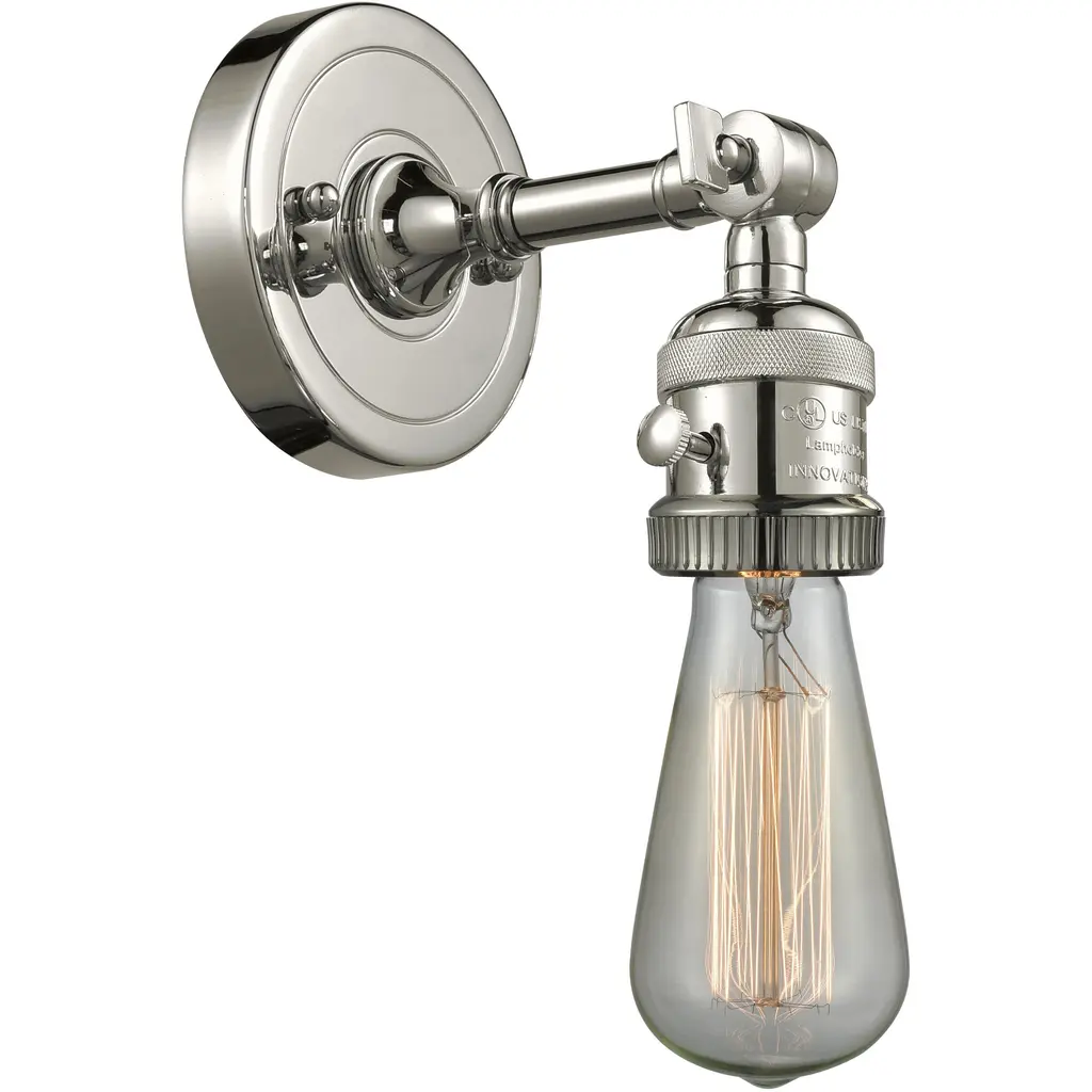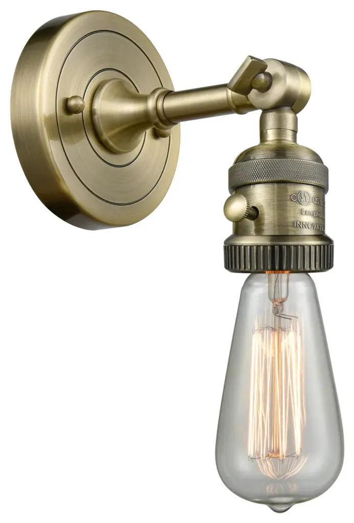 INNOVATIONS 203SW-SN-LED Bare Bulb 1 Light 4.5 inch Sconce With Switch Brushed Satin Nickel. Style: Traditional, Industrial, Farmhouse, Restoration-Vintage. Collection Name: Franklin Restoration. Metal Finish(Body): Brushed Satin Nickel. Metal Finish(Canopy/Backplate): Brushed Satin Nickel. Material: Steel, Cast Brass. Dimension(in): 6.375(H) x 4.5(W) x 6.75(Ext). Bulb: (1)6W LED(Included). Voltage: 120. Dimmable: Yes. Color Temperature (Kelvin): 2700. Color Rendering Index (CRI): 82. Lumens: 600. Life Expectancy (Hours): 15000. Backplate Dimension(in): 4.5(Dia) x 0.75(Depth). ADA Compliant: No. California Proposition 65 Warning Required: Yes. UL/ETL Certification Type: Damp Location.