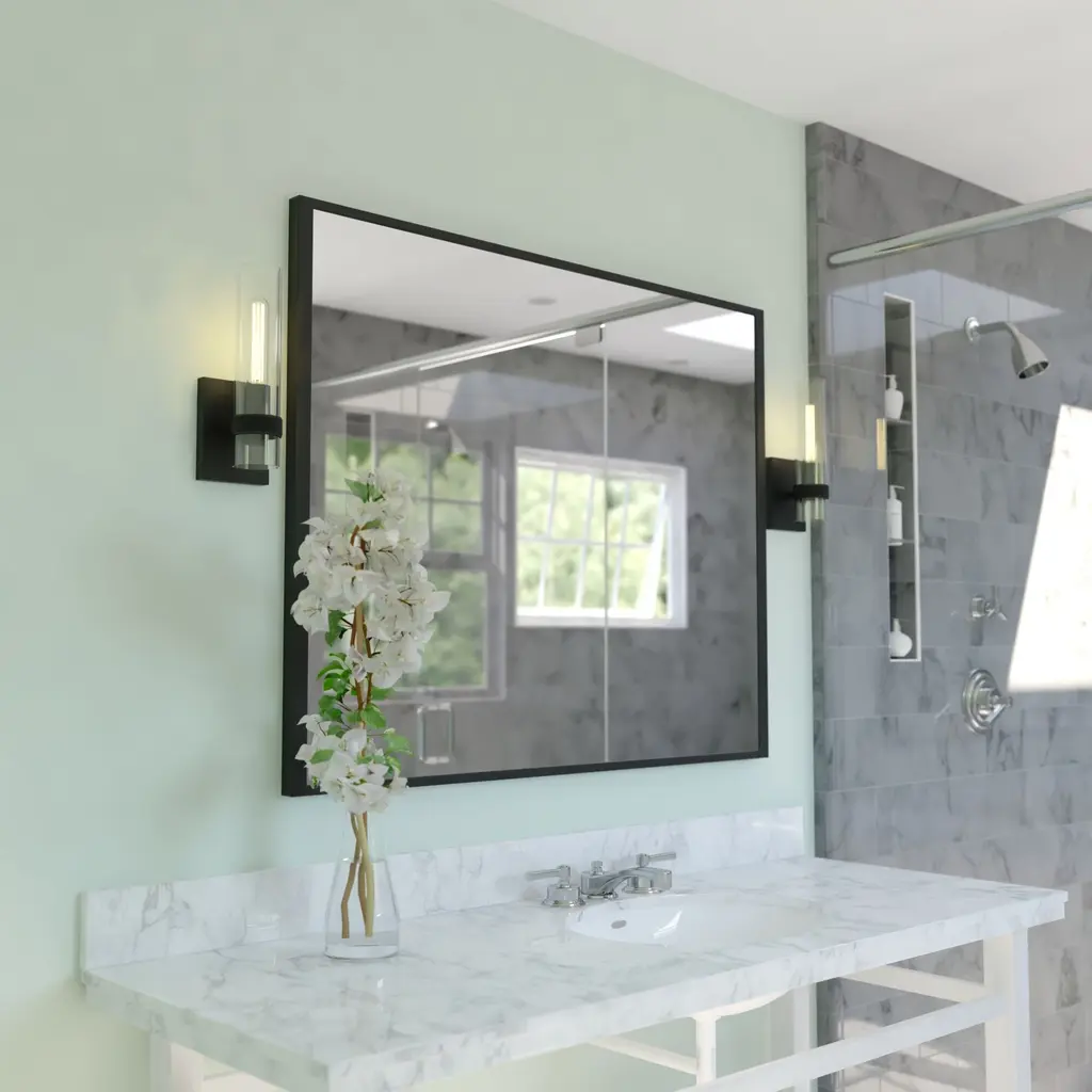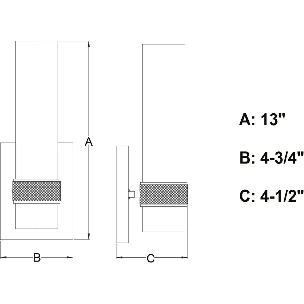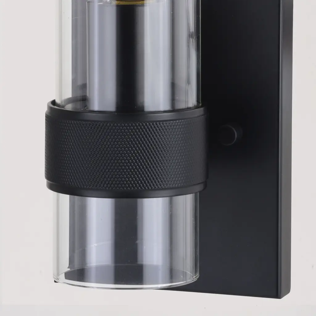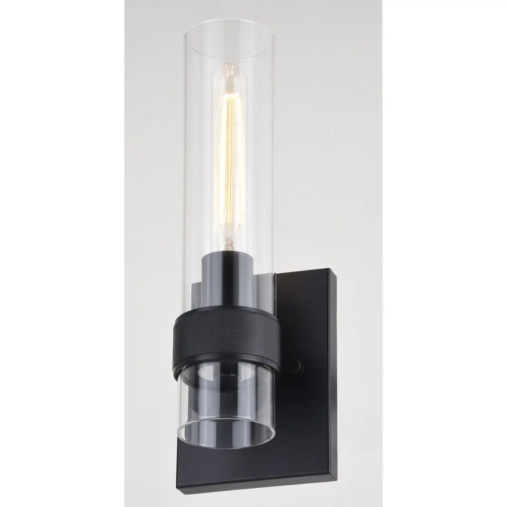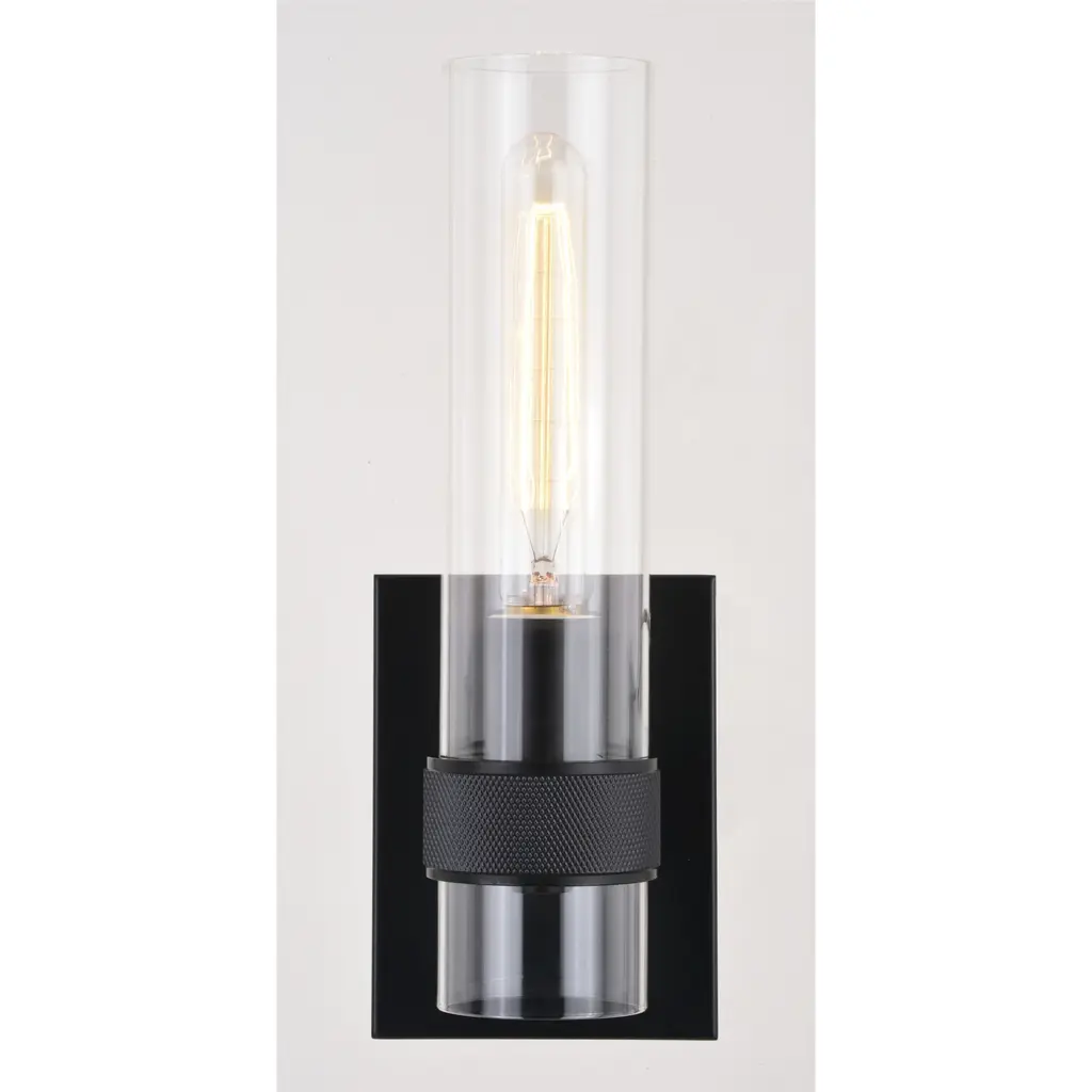 The Bari collection is a blend of simplicity and sophistication featuring a contemporary knurled ring. Ample light emanates from the elongated clear glass shade creating a dramatic effect. Pair with a clear filament bulb for the optimal look. This damp rated wall sconce is ideal for bathrooms, hallways, stairways, and bedrooms.