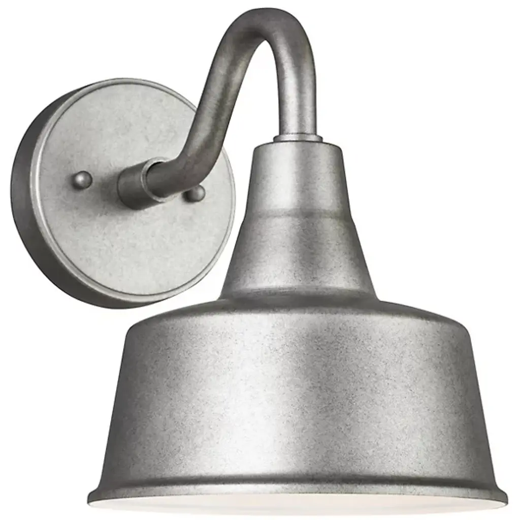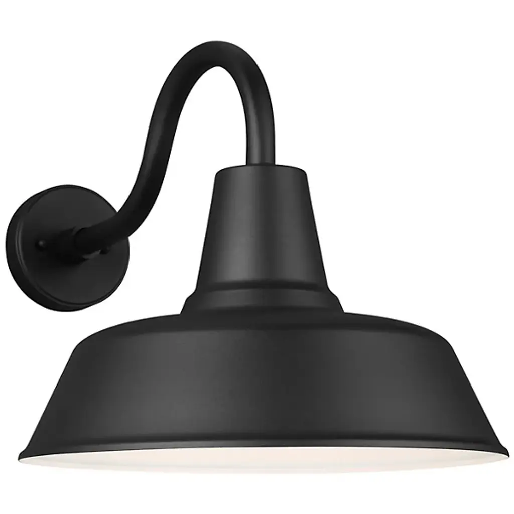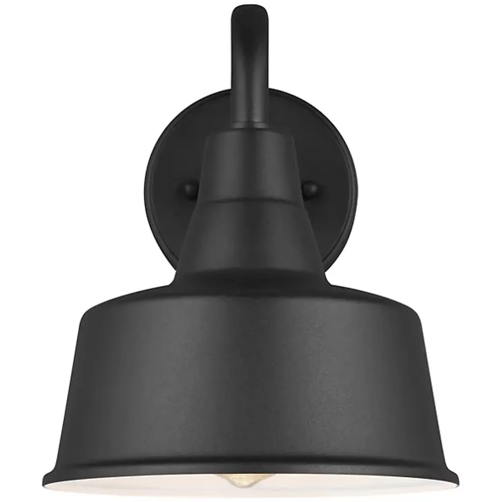 Illuminate your exteriors and enhance your curb appeal with the Barn Light Outdoor Wall Sconce by Visual Comfort Studio, formerly known as Sea Gull Lighting, Handcrafted from aluminum and durable enough for a variety of applications, the fixture is anchored to its mounting surface by a stepped disc wall plate that sends out a curving stem arcing out, up and downwards to a single, wet-listed socket. A shallow, flaring shade with a smooth interior surrounds the lamping, casting a wide splash of light below ideal for nighttime navigation.