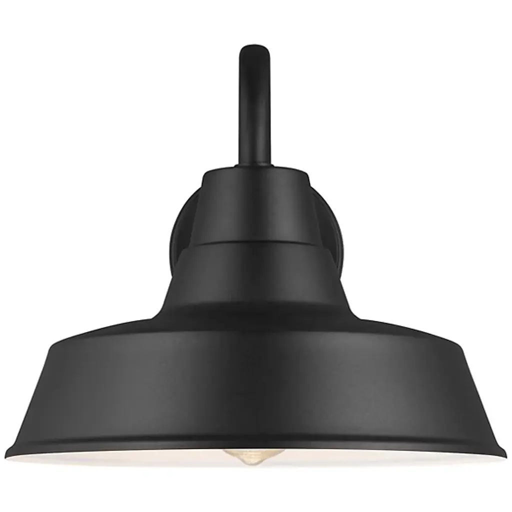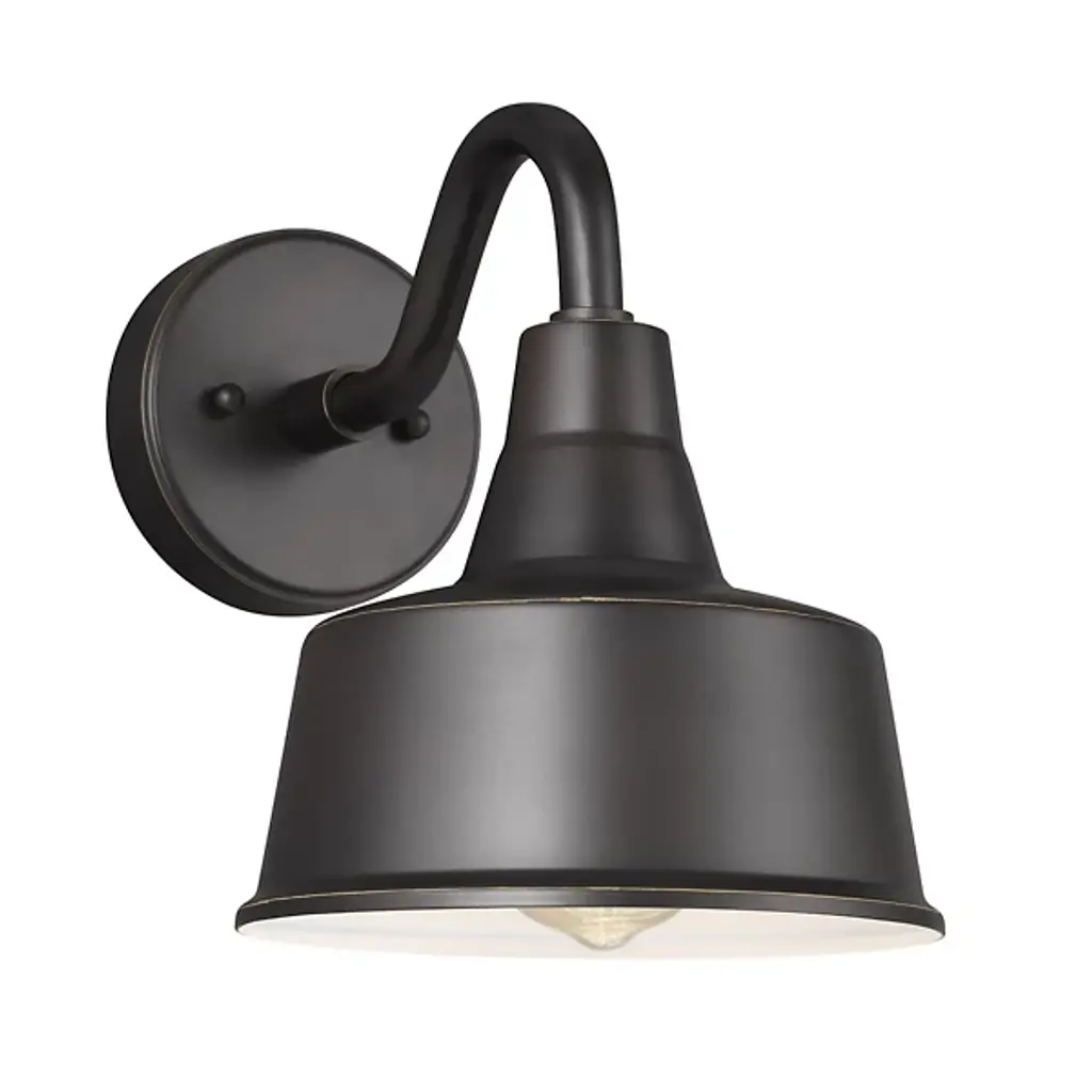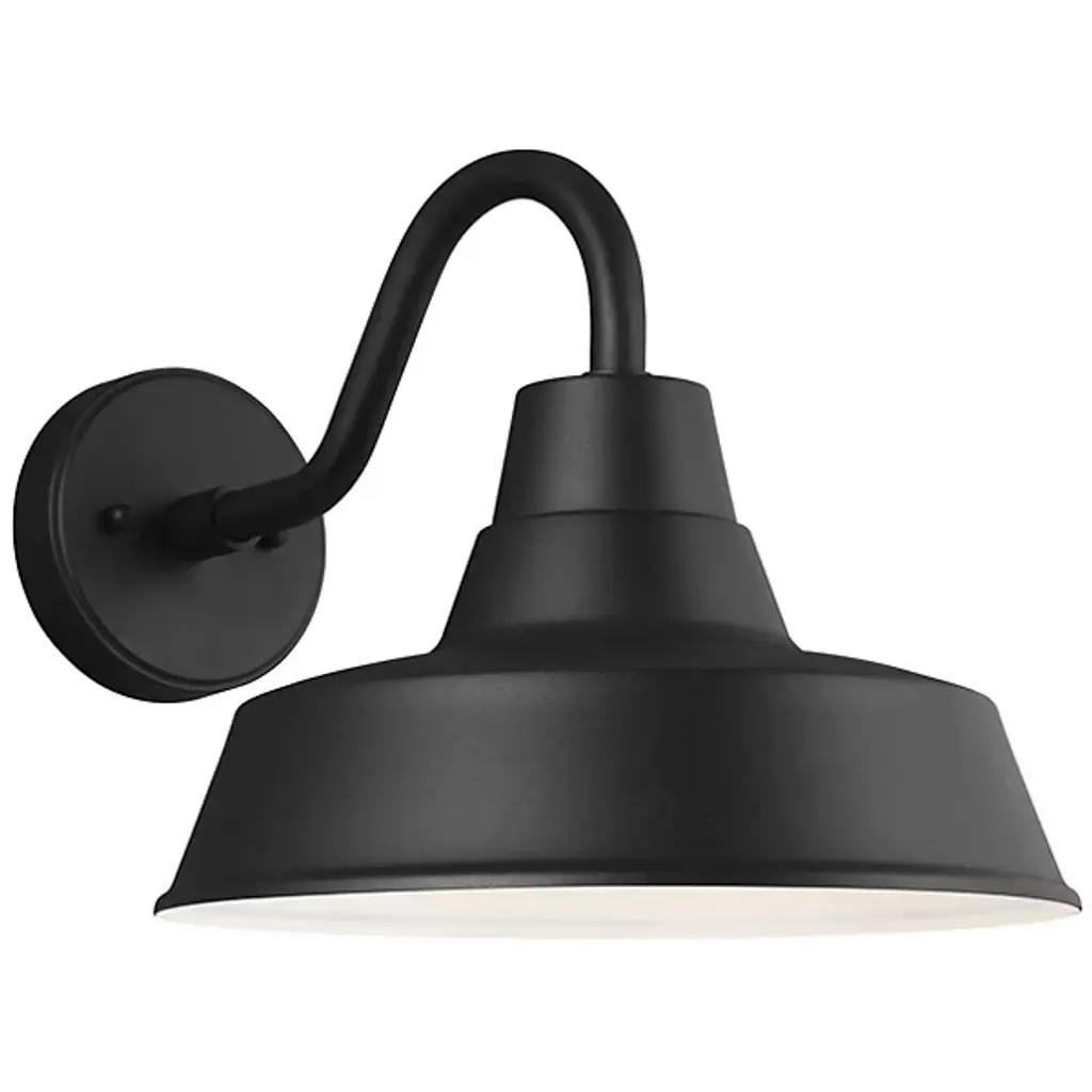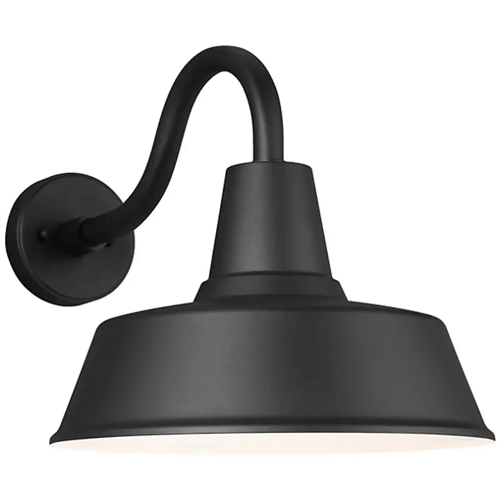 Illuminate your exteriors and enhance your curb appeal with the Barn Light Outdoor Wall Sconce by Visual Comfort Studio, formerly known as Sea Gull Lighting, Handcrafted from aluminum and durable enough for a variety of applications, the fixture is anchored to its mounting surface by a stepped disc wall plate that sends out a curving stem arcing out, up and downwards to a single, wet-listed socket. A shallow, flaring shade with a smooth interior surrounds the lamping, casting a wide splash of light below ideal for nighttime navigation.