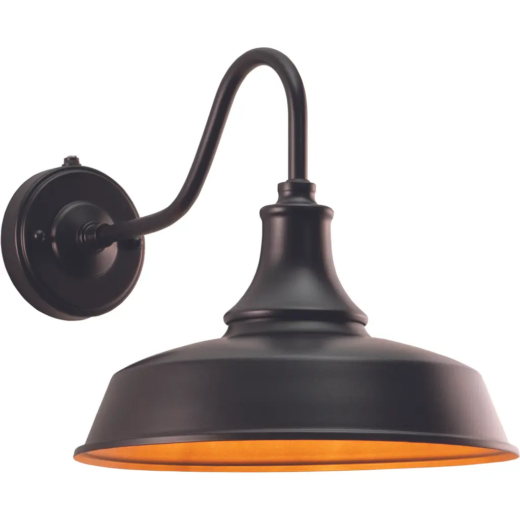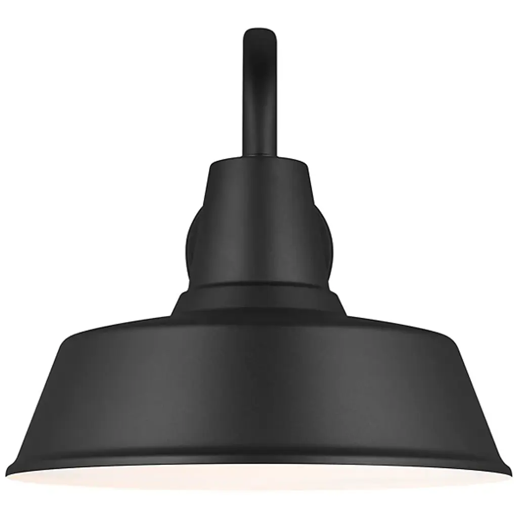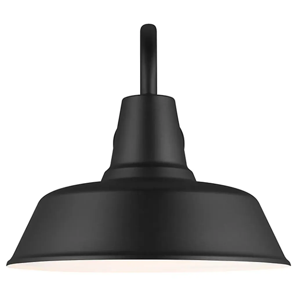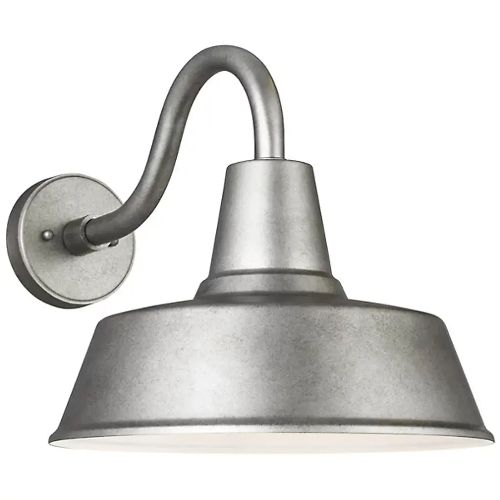 Illuminate your exteriors and enhance your curb appeal with the Barn Light Outdoor Wall Sconce by Visual Comfort Studio, formerly known as Sea Gull Lighting, Handcrafted from aluminum and durable enough for a variety of applications, the fixture is anchored to its mounting surface by a stepped disc wall plate that sends out a curving stem arcing out, up and downwards to a single, wet-listed socket. A shallow, flaring shade with a smooth interior surrounds the lamping, casting a wide splash of light below ideal for nighttime navigation.