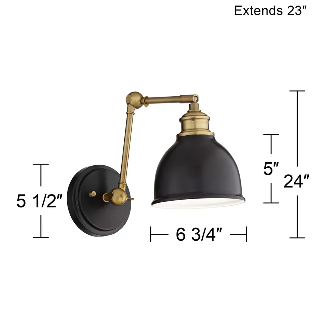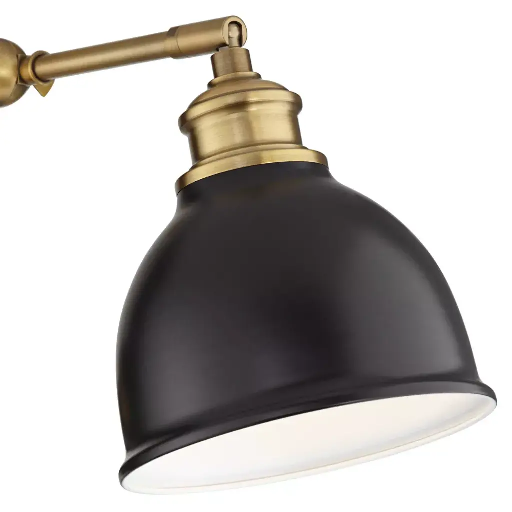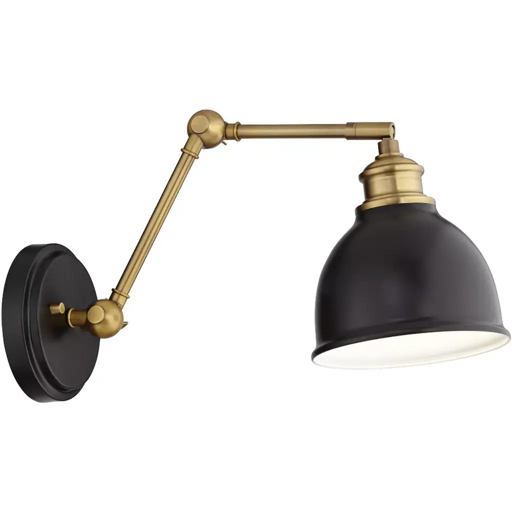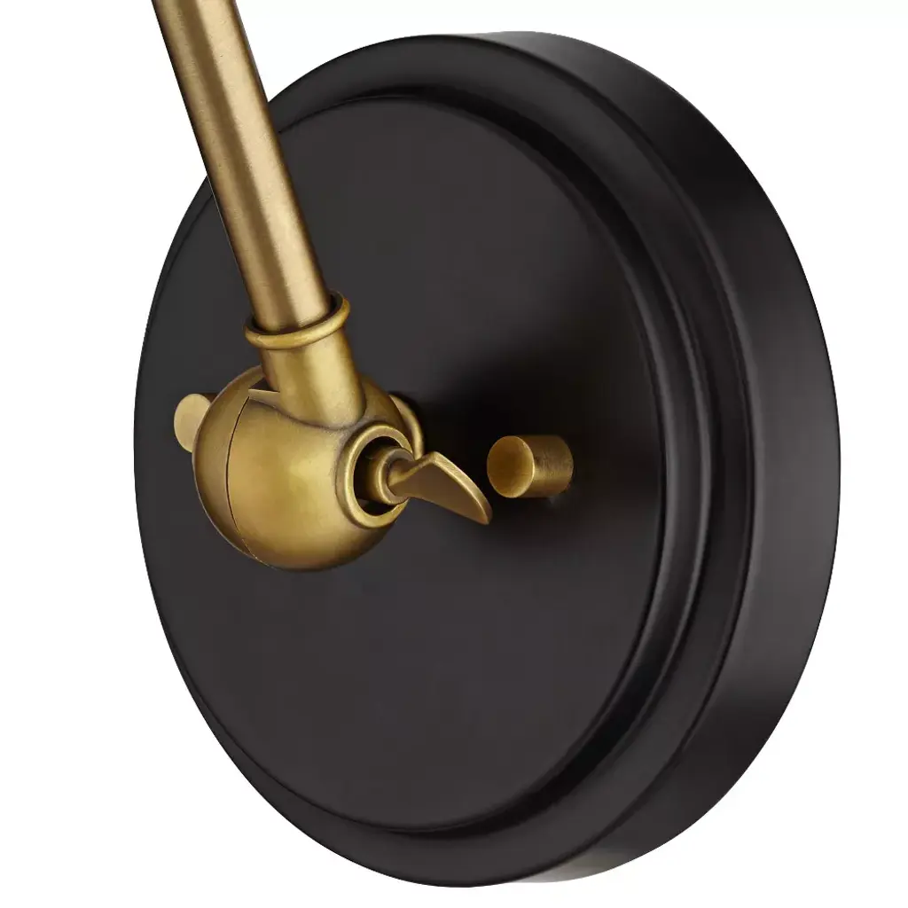 Make a room shine with these modern metal wall lamps set of two. Two adjustable articulation points allow for customized positioning, while a swivel on the lamp head adjusts up and down to guide light where it's needed. A black finish shade and backplate complement the antique brass finish hardware for a contemporary and industrial appeal.