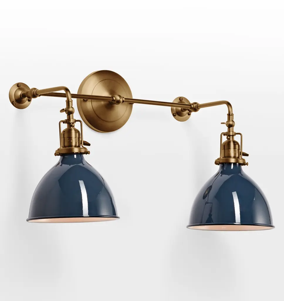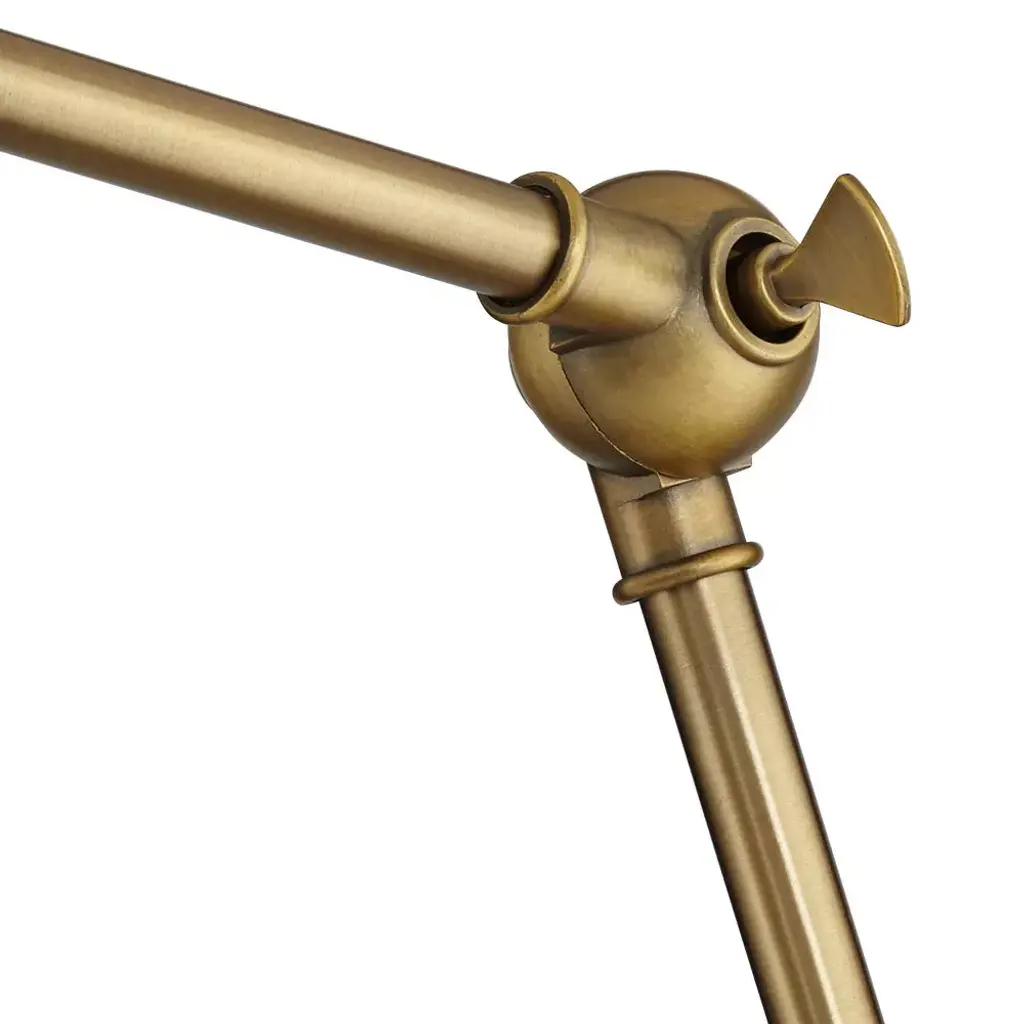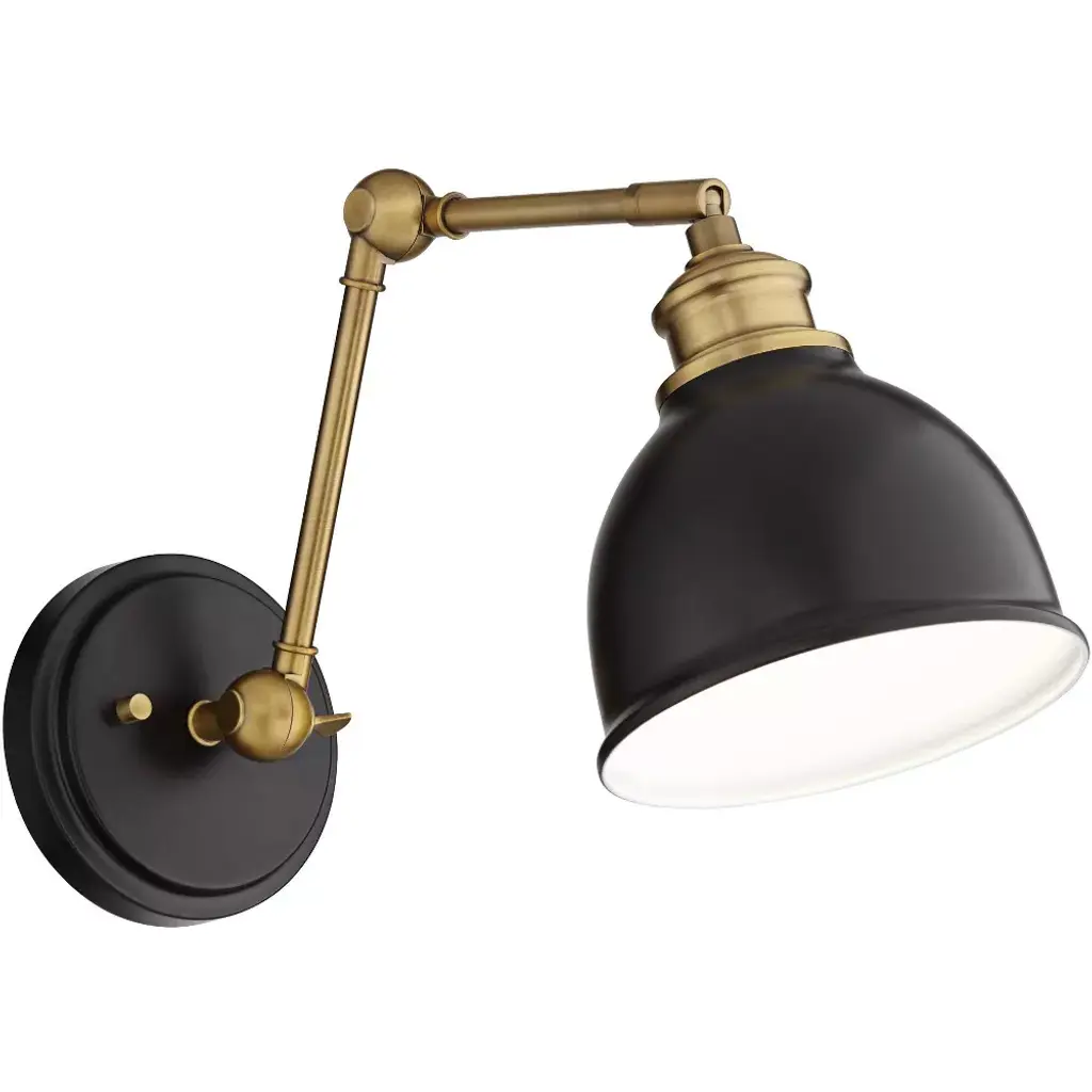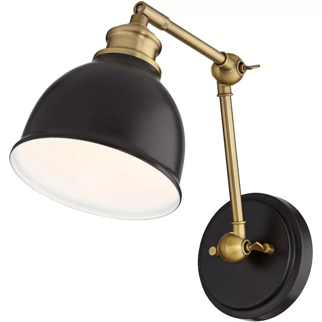 Make a room shine with these modern metal wall lamps set of two. Two adjustable articulation points allow for customized positioning, while a swivel on the lamp head adjusts up and down to guide light where it's needed. A black finish shade and backplate complement the antique brass finish hardware for a contemporary and industrial appeal.