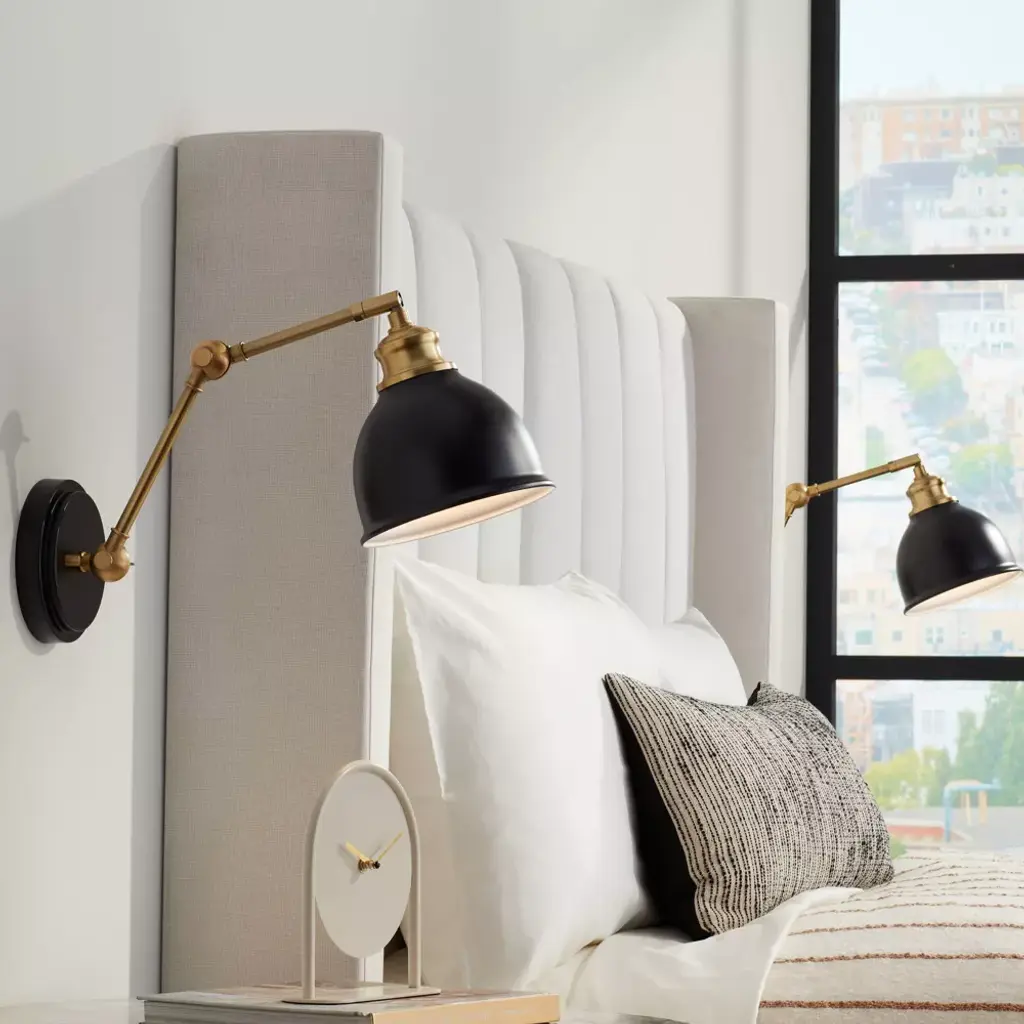 Barnes And Ivy Sania Modern Swing Arm Wall Lamps Set Of 2 Black Brass Plug-in Light Fixture Adjustable Up Down Shade For Bedroom Bedside Living Room