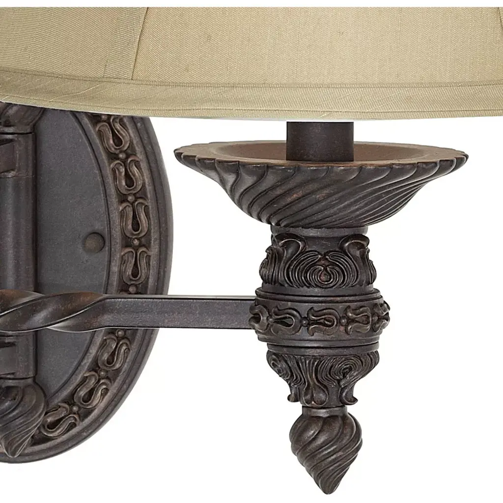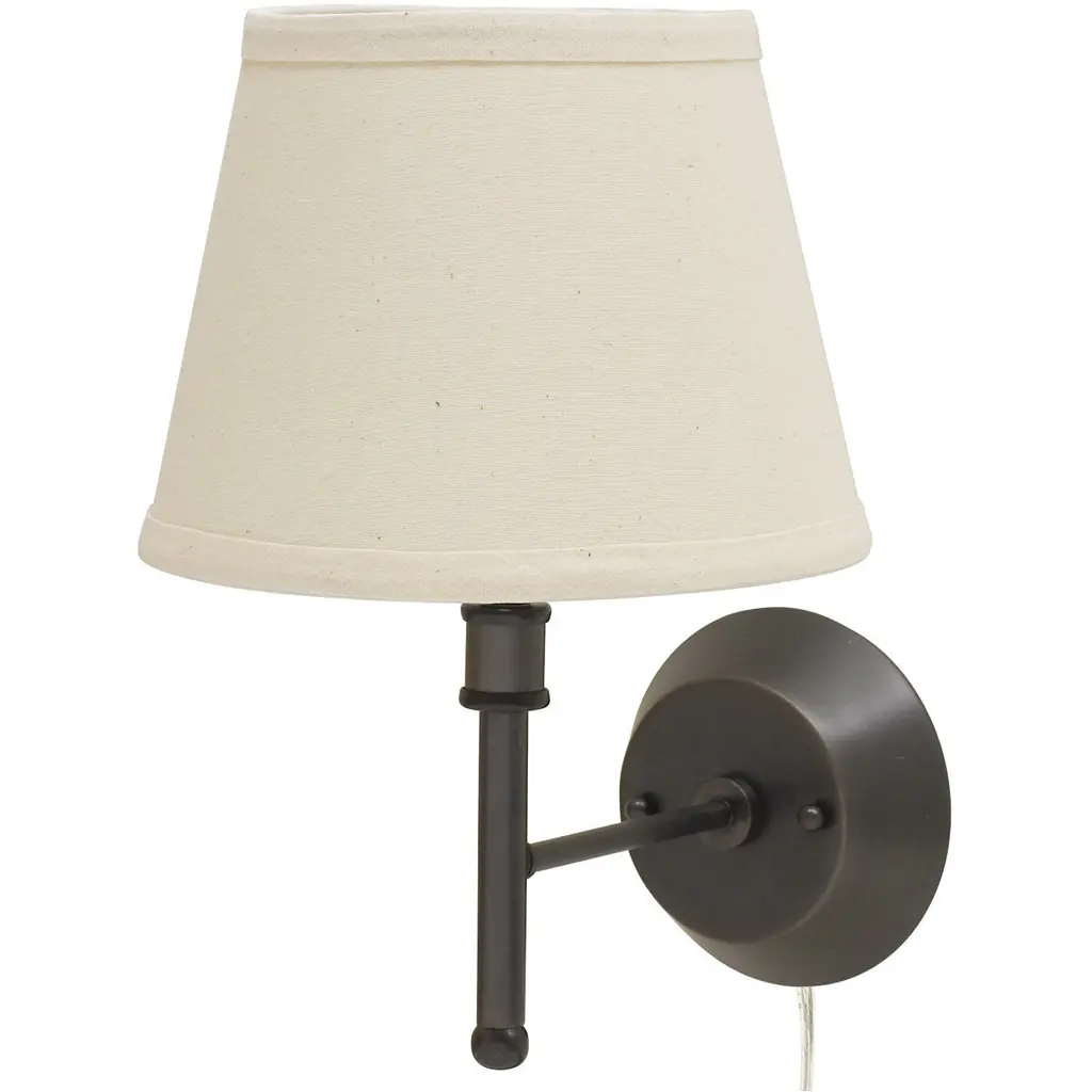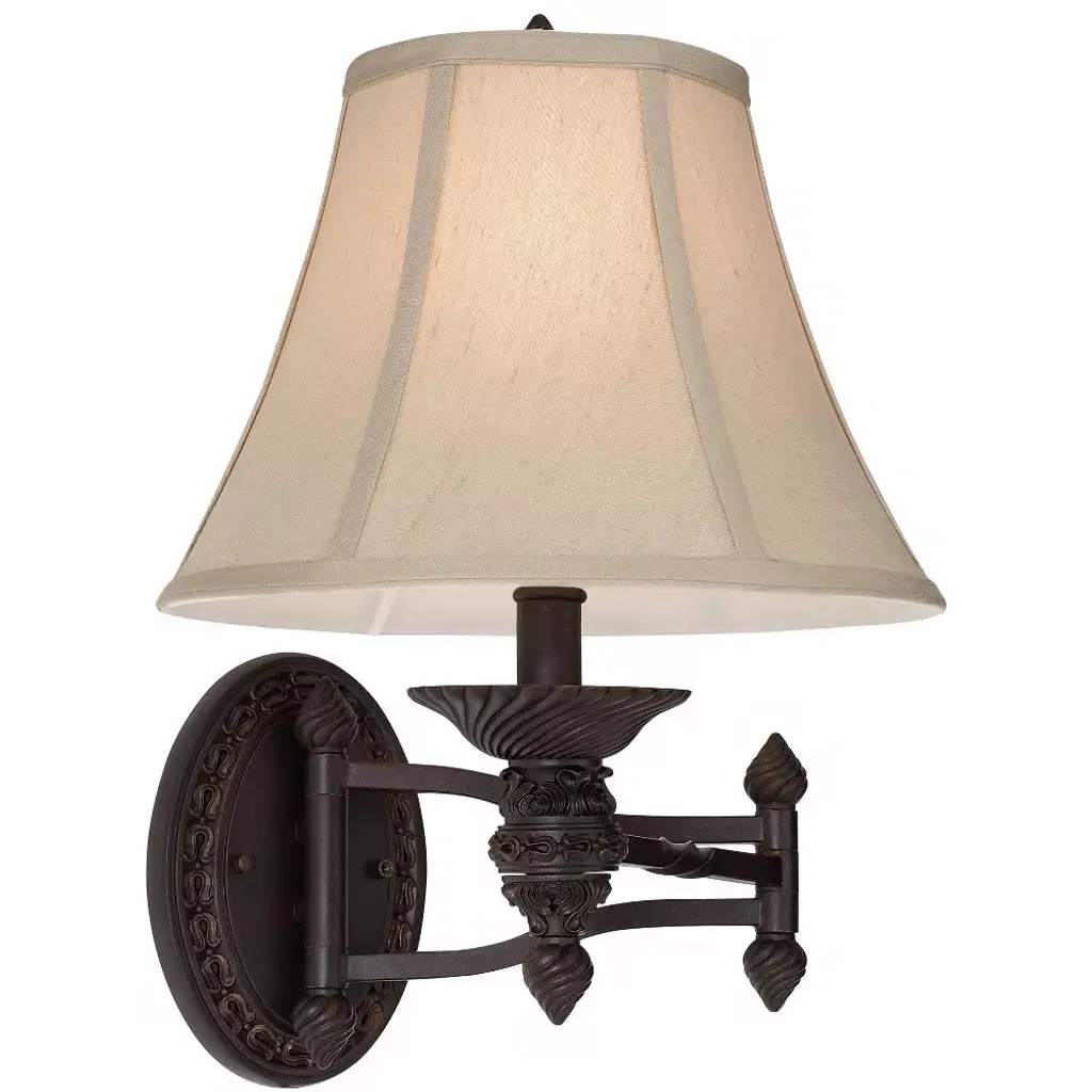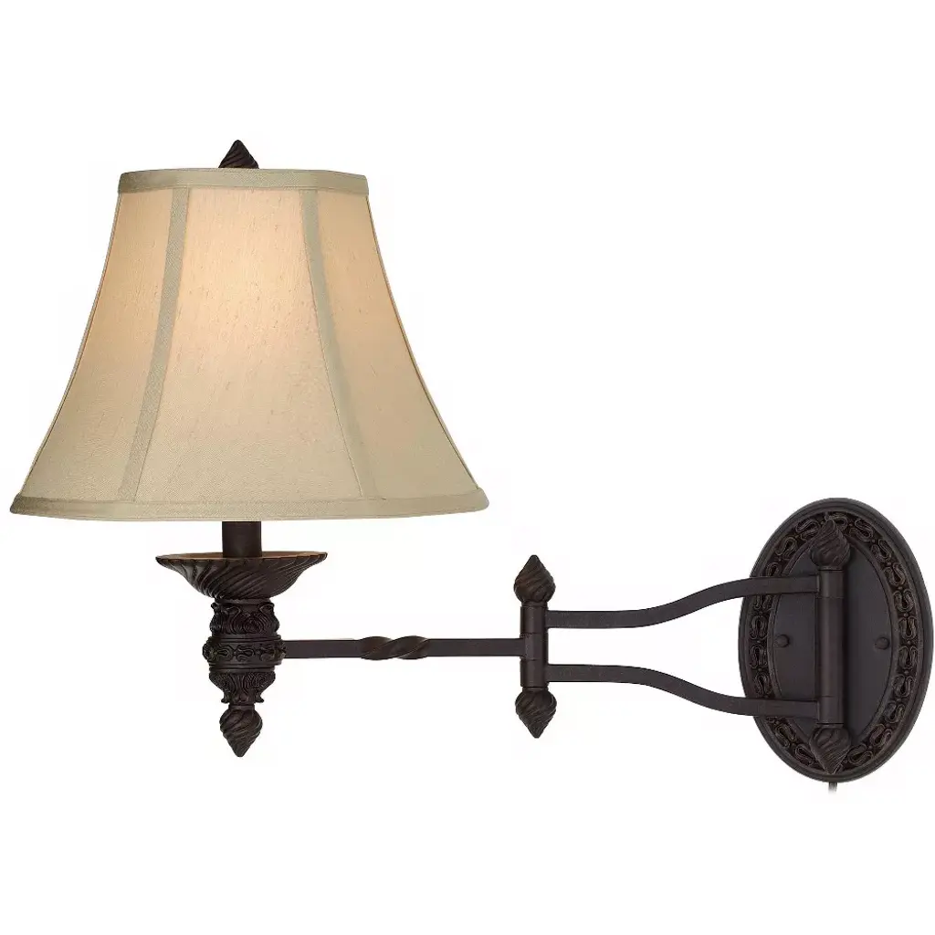 Classic lines and detailing gives the Godia swing arm wall lamp a traditional appeal. A warm bronze finish adorns the oval backplate and turned arm while the shade is a beige fabric with fold-over trim. Get the ideal lighting level with the included full-range dimmer.