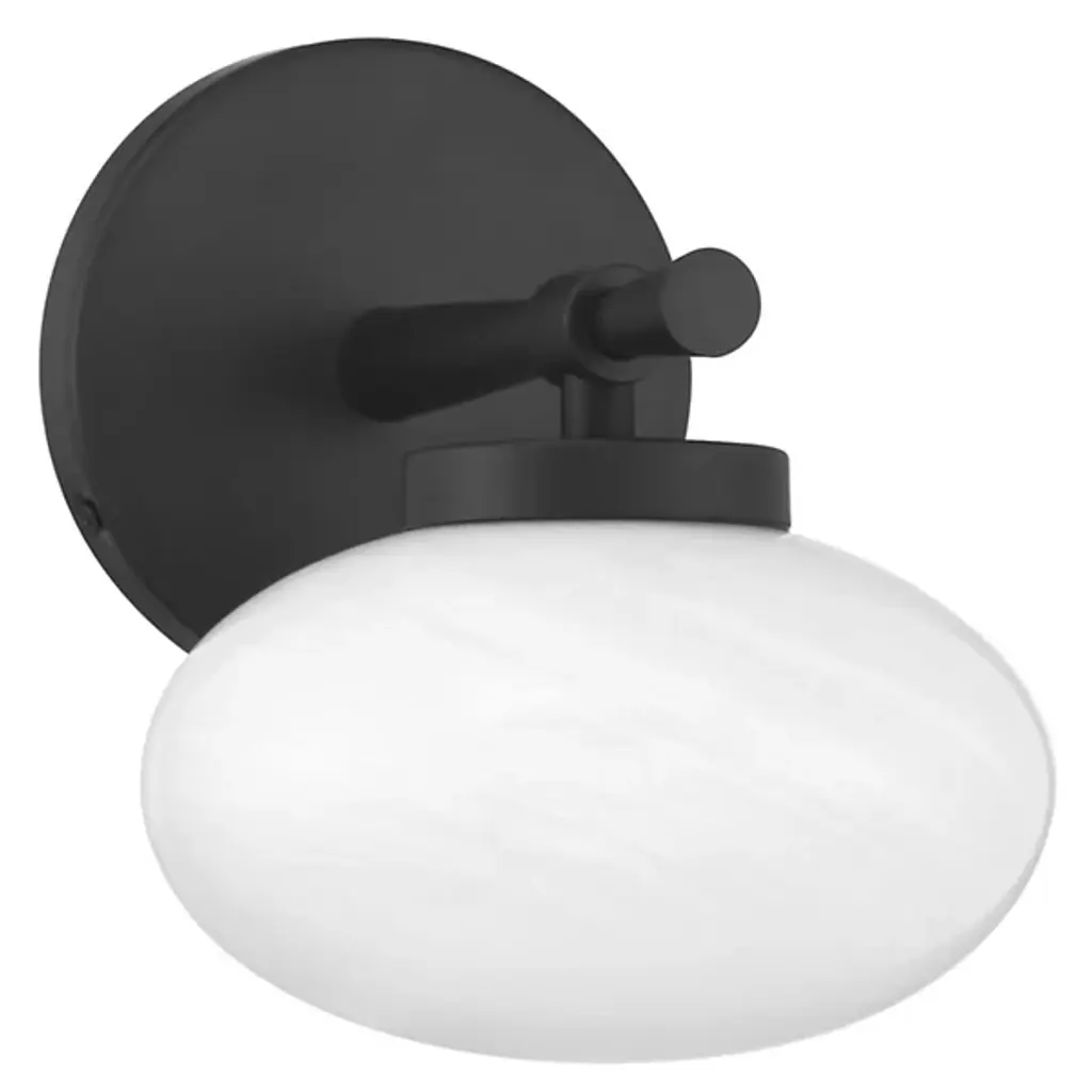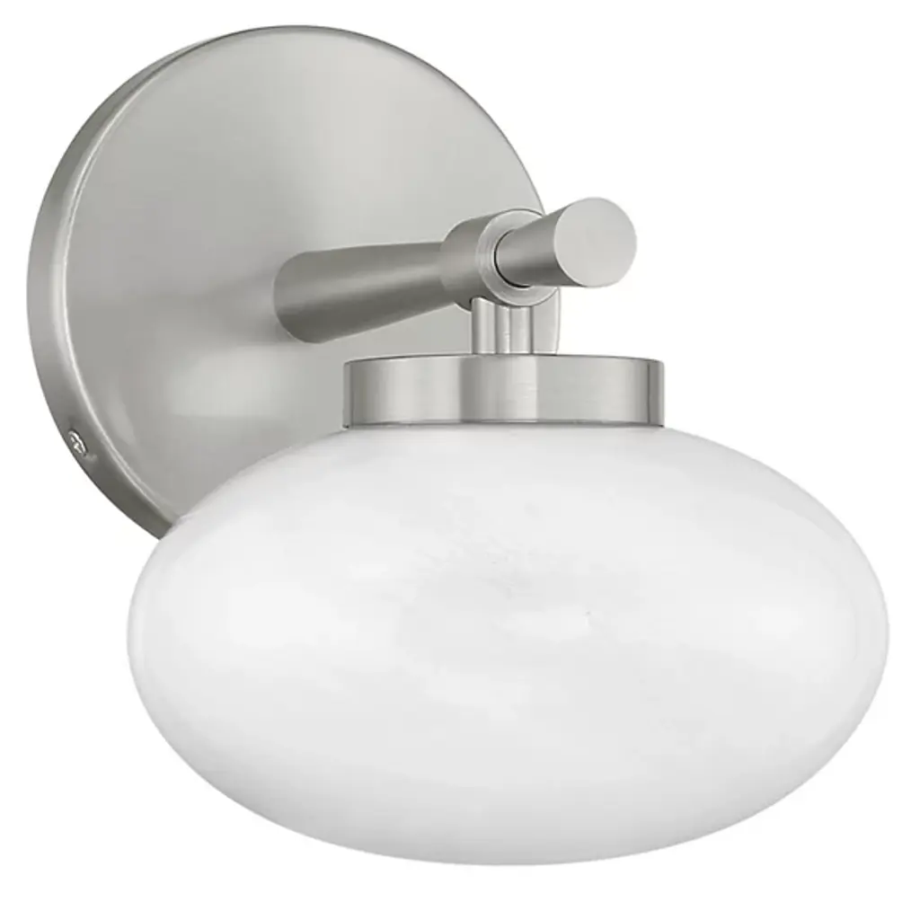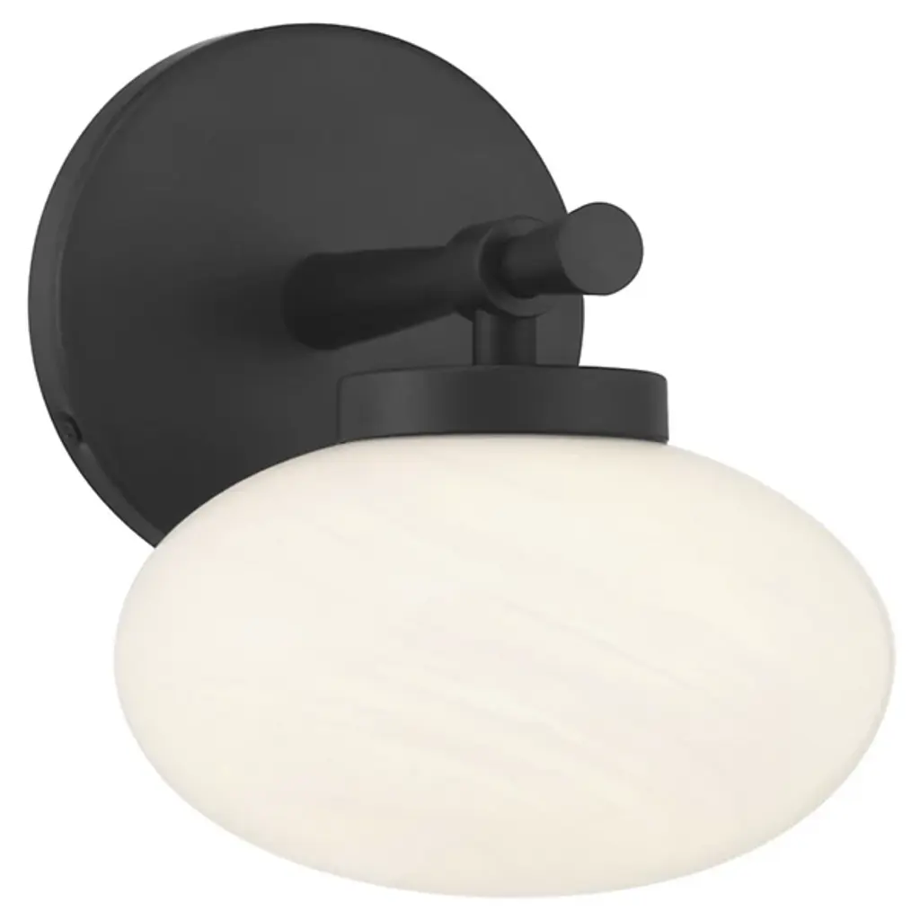 The Barrow Wall Sconce from Savoy House brings mid-century sensibilities to bathroom lighting with its oval glass shade. Its textured strie glass creates beautiful light patterns and its thoughtfully designed arm holds the shade at just the right distance for optimal illumination without overwhelming smaller spaces. This sconce works beautifully in pairs, flanking a mirror or individually lighting hallways and transitional spaces. With its damp-area rating, you can confidently install it in bathrooms without worrying about moisture damage. The fixture’s simple circular backplate keeps the focus on its beautiful glass shade.