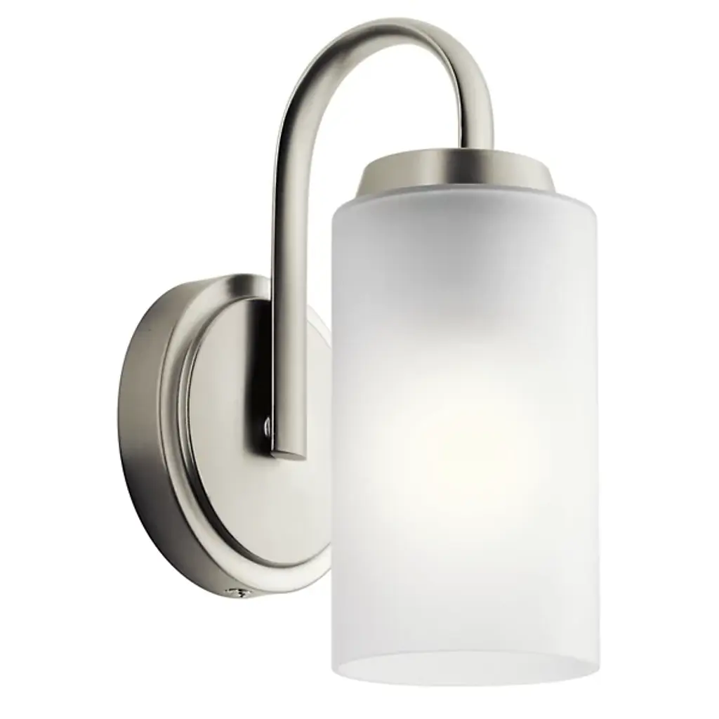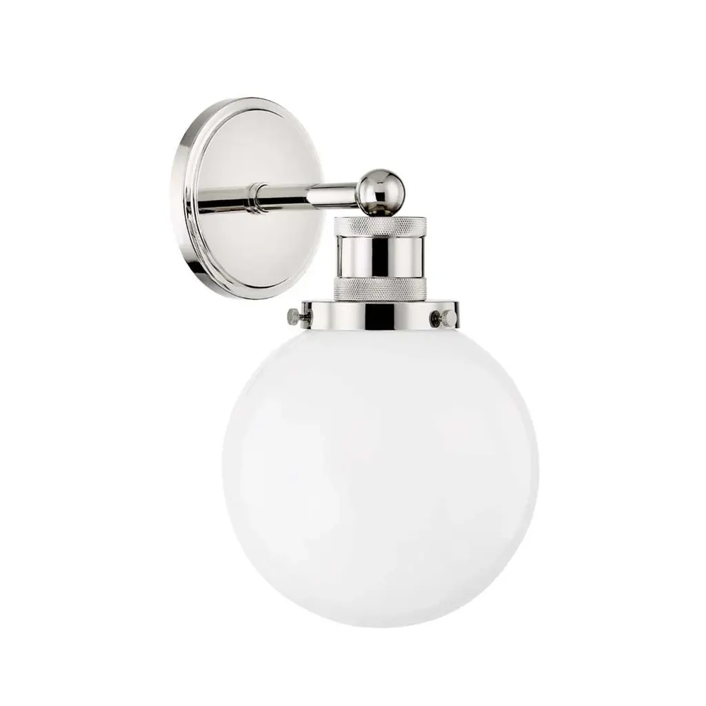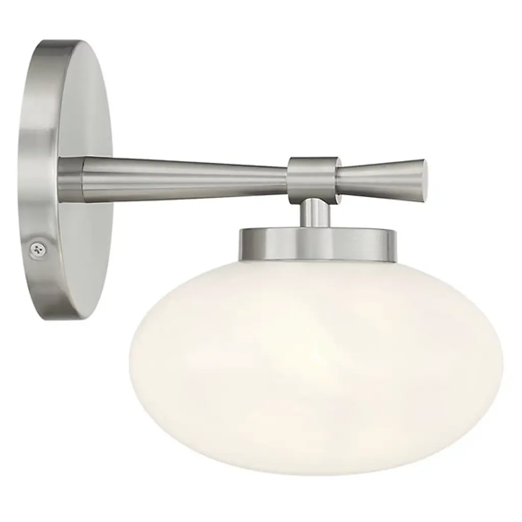 The Barrow Wall Sconce from Savoy House brings mid-century sensibilities to bathroom lighting with its oval glass shade. Its textured strie glass creates beautiful light patterns and its thoughtfully designed arm holds the shade at just the right distance for optimal illumination without overwhelming smaller spaces. This sconce works beautifully in pairs, flanking a mirror or individually lighting hallways and transitional spaces. With its damp-area rating, you can confidently install it in bathrooms without worrying about moisture damage. The fixture’s simple circular backplate keeps the focus on its beautiful glass shade.