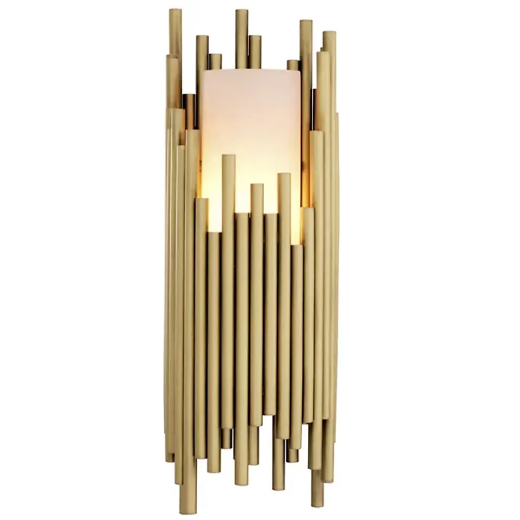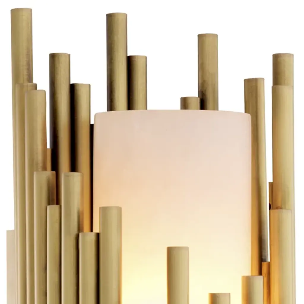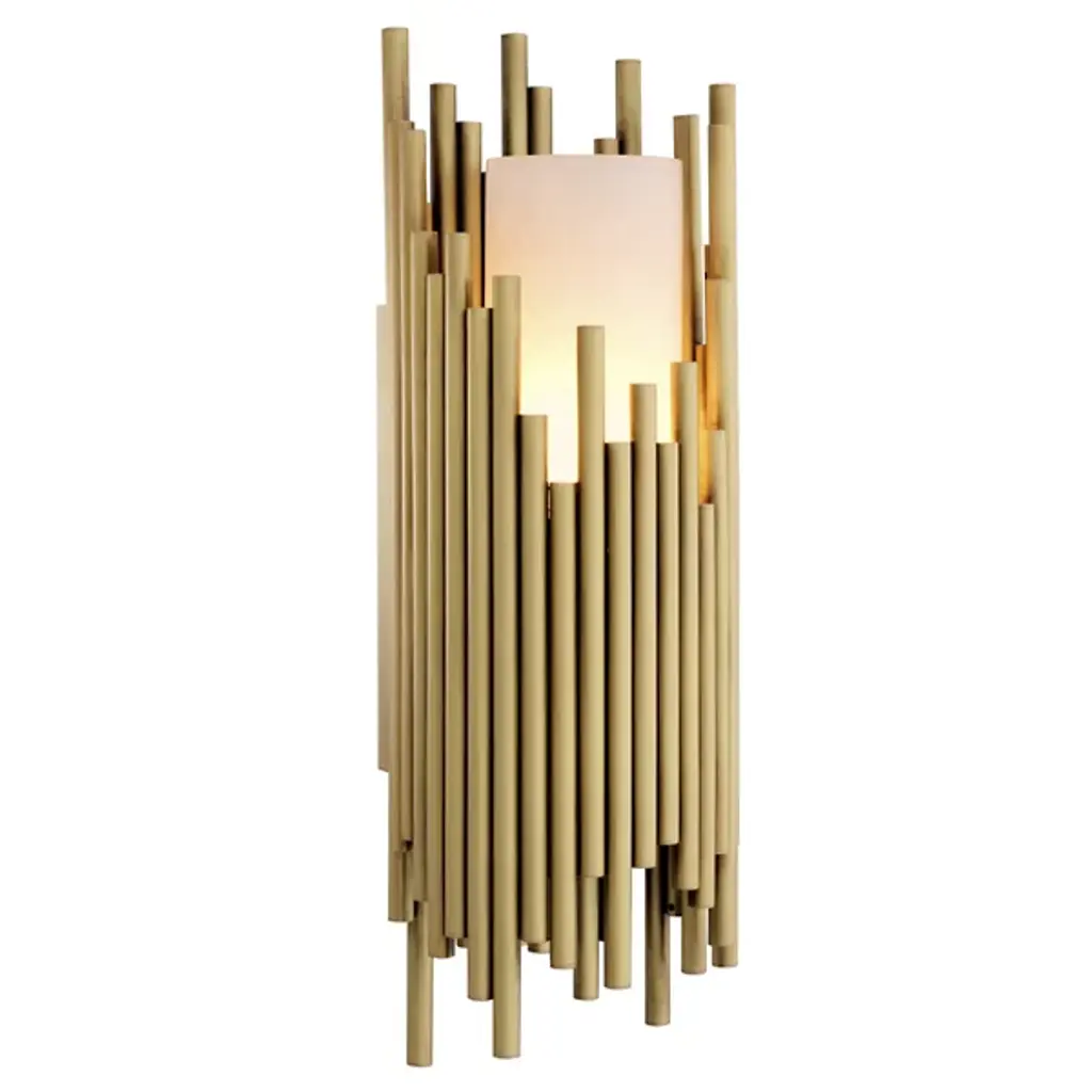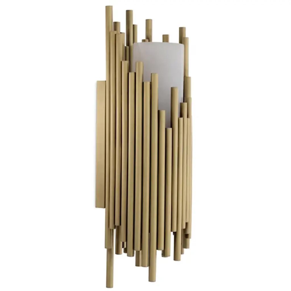 A nest of emotional light. The Bartoli Wall Sconce from Eichholtz is a piece of functional sculpture, giving the home’s architectural features a distinct focal point. Its modern character is evident in its use of clean shapes and lines. The sconce’s linear structure suggests the graphic, repeating motifs of the Art Deco style. This structure places slender metal rods at varying heights, creating a dynamic form that gets the eyes scanning across. The structure creates a cozy home for the alabaster diffuser inside. The light funnels and filters through the alabaster as an ambient glow, translating to a dramatic graphic silhouette.