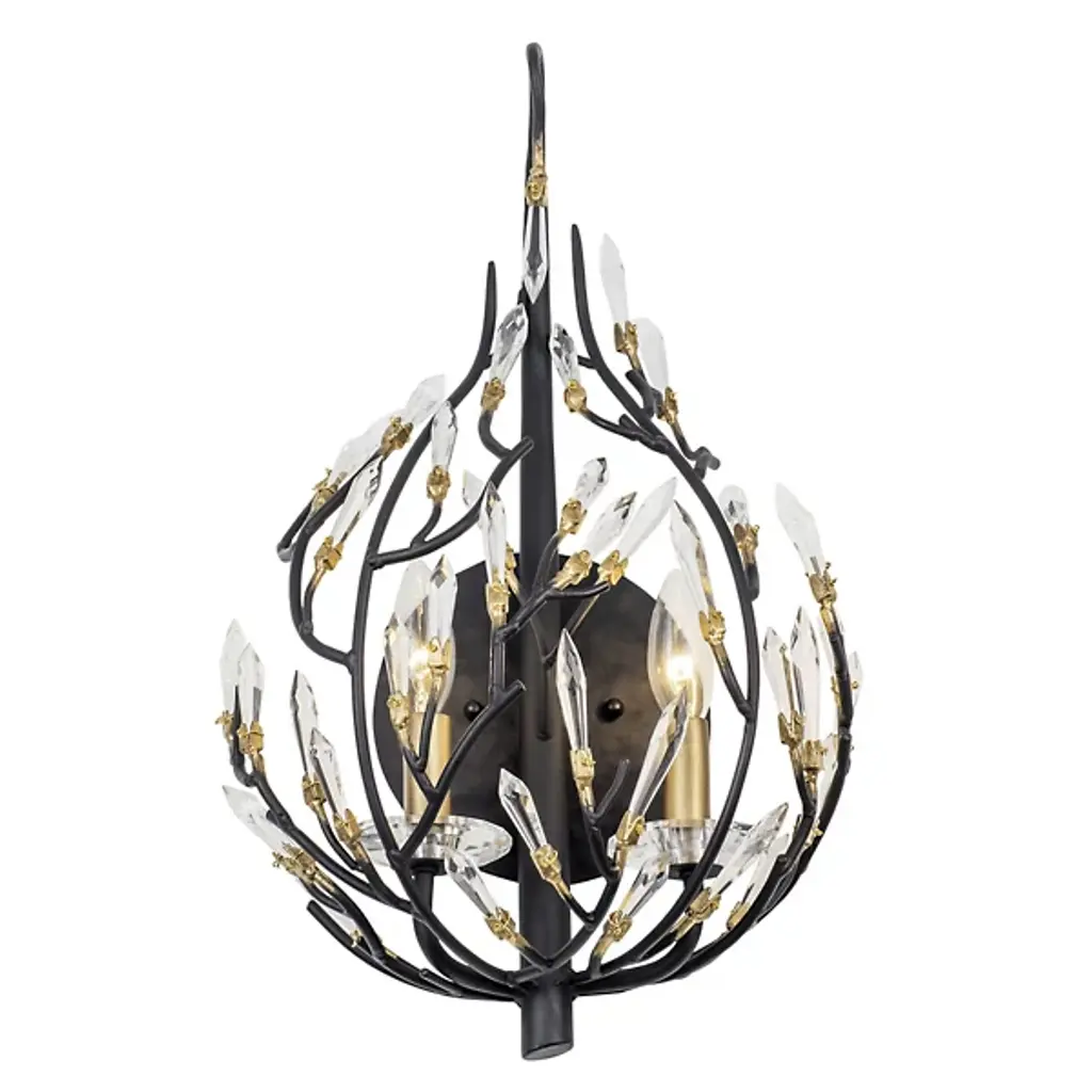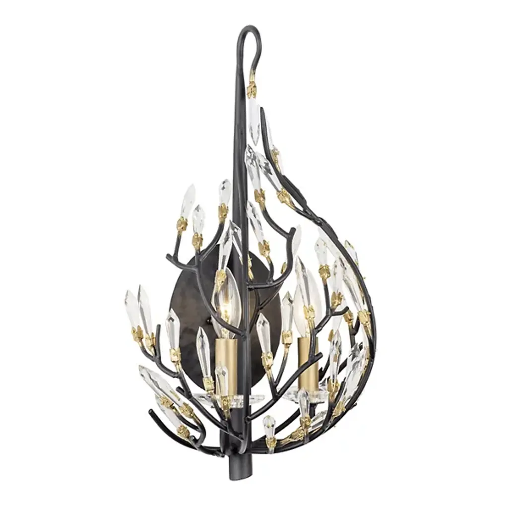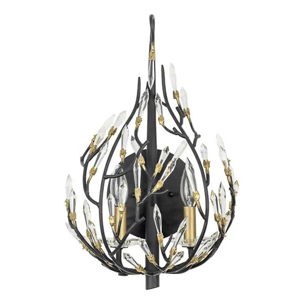Illuminate your space with the enchanting Bask Wall Sconce from Varaluz, a 2023 creation designed with a hand-hammered canopy. A sustainable fixture crafted from hand-forged recycled steel, this whimsical fixture extends an Artisanal Modern appeal, offering a unique crystal piece that combines fashion-influenced shapes with the curling branches of nature. The faceted premium crystals scatter out a glittering glimmer to the sides, handmade with sustainability in mind and showcasing distinctive elements, starting with the intricately hand-hammered canopy; it is glamorous and environmentally conscious.