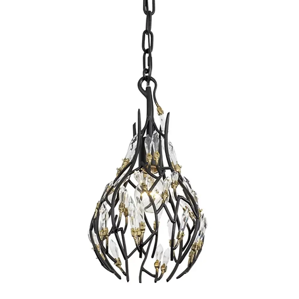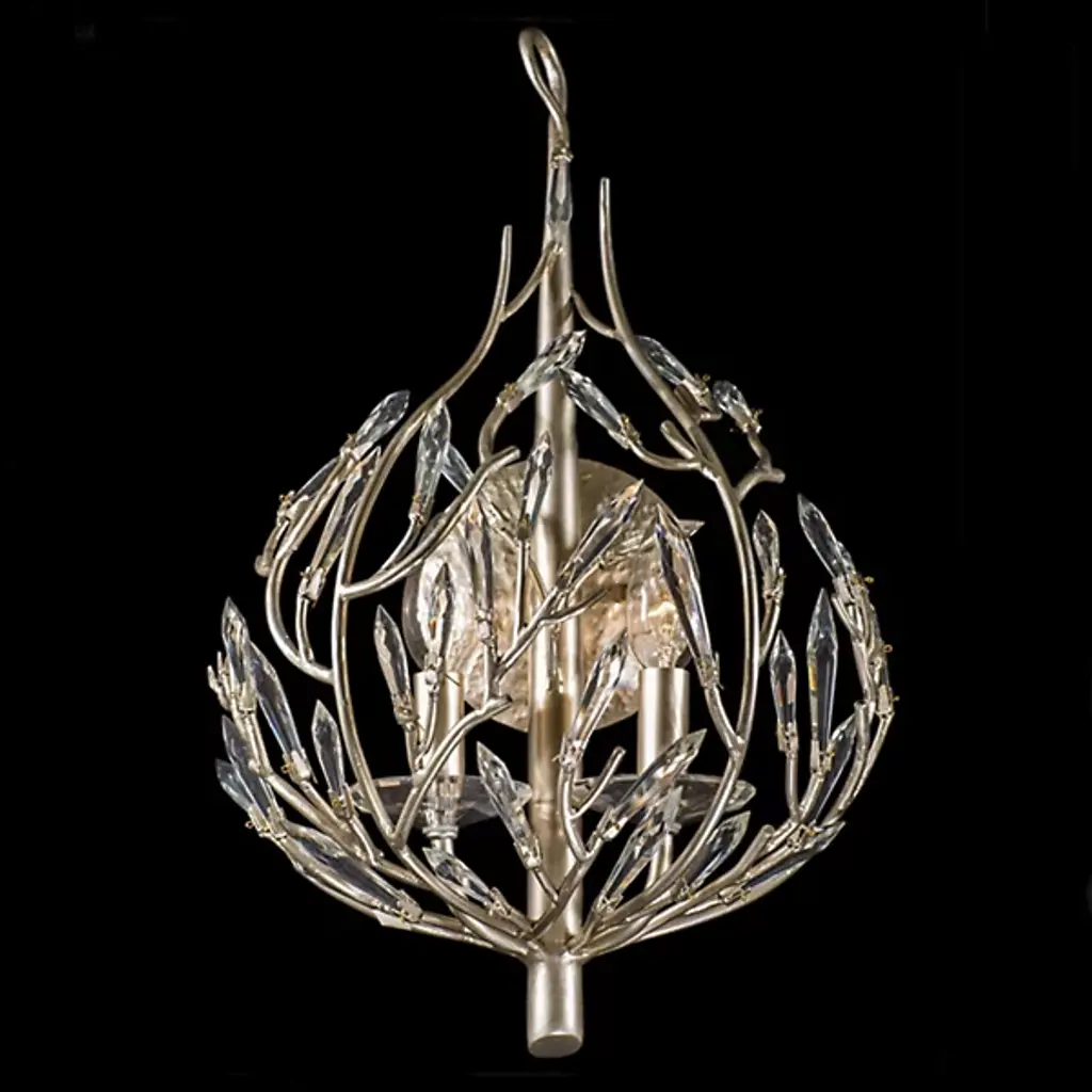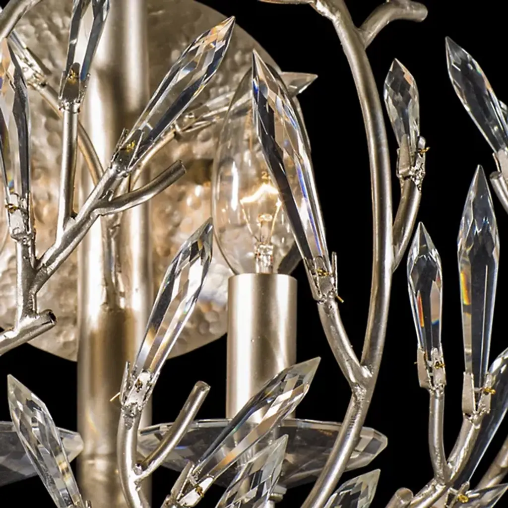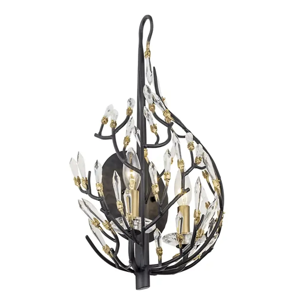Illuminate your space with the enchanting Bask Wall Sconce from Varaluz, a 2023 creation designed with a hand-hammered canopy. A sustainable fixture crafted from hand-forged recycled steel, this whimsical fixture extends an Artisanal Modern appeal, offering a unique crystal piece that combines fashion-influenced shapes with the curling branches of nature. The faceted premium crystals scatter out a glittering glimmer to the sides, handmade with sustainability in mind and showcasing distinctive elements, starting with the intricately hand-hammered canopy; it is glamorous and environmentally conscious.