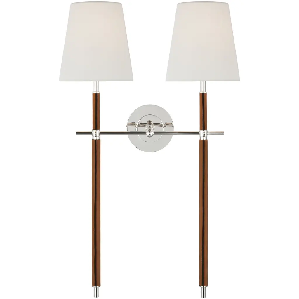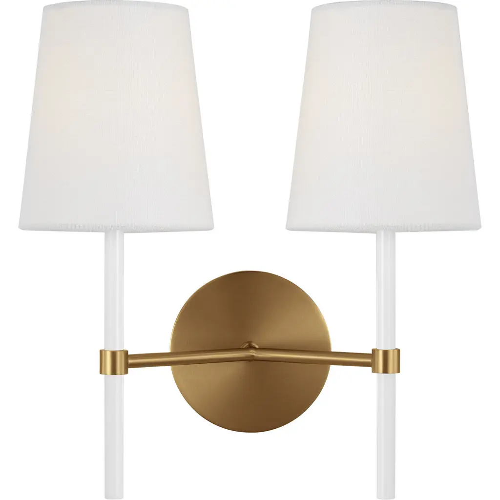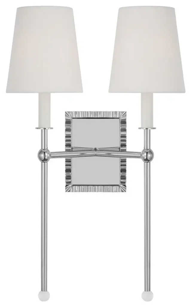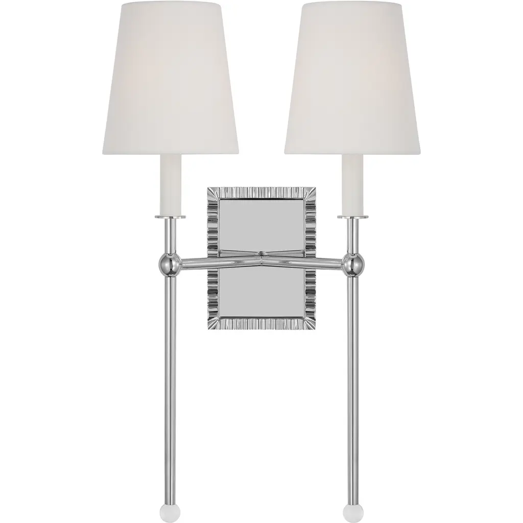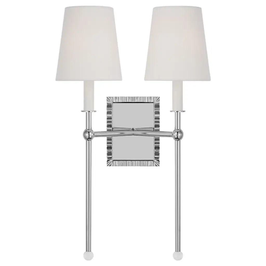 The Baxley Double Sconce from Visual Comfort Studio is a radiant piece designed by Alexa Hampton that effortlessly fuses classic and traditional aesthetics. Torch-like steel frameworks, crowned by linen shades, emit a warm glow from LEDs, while a central horizontal arm embellished with globes at each end adds an architectural element to the design. Secured by a backplate, Baxley gives you double the amount of light in a single fixture.