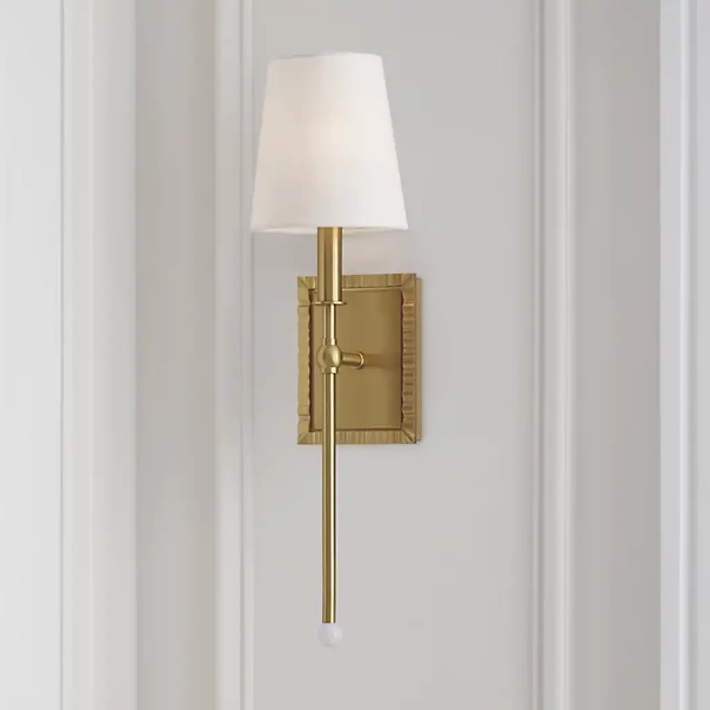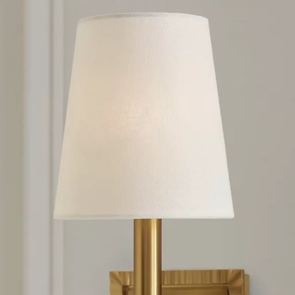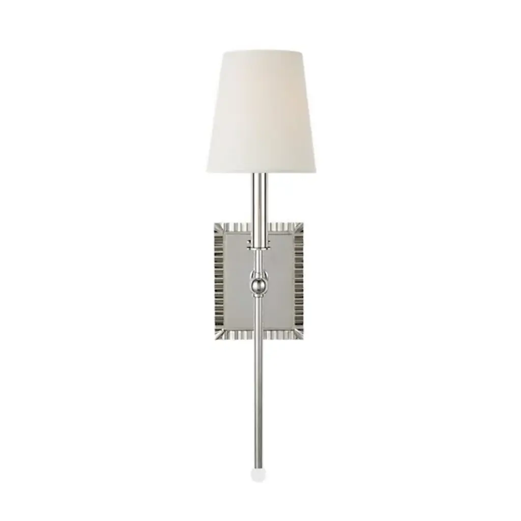 Classy silhouette with a crafted look. Flank your entryways and art pieces with the stylish design of the Baxley Wall Sconce from Visual Comfort Studio, formerly known as AH by Alexa Hampton, Like a lovely ribbon draped around the edges of a picture frame, textured metal lines a rectangular backplate with a stylish unfurled appearance. The slender figure of a tailed lamp holder appears in front, accented at the end with a charming glass sphere. A fabric lampshade completes the traditional-inspired design, taking in light from inside and translating it into an ambient glow.