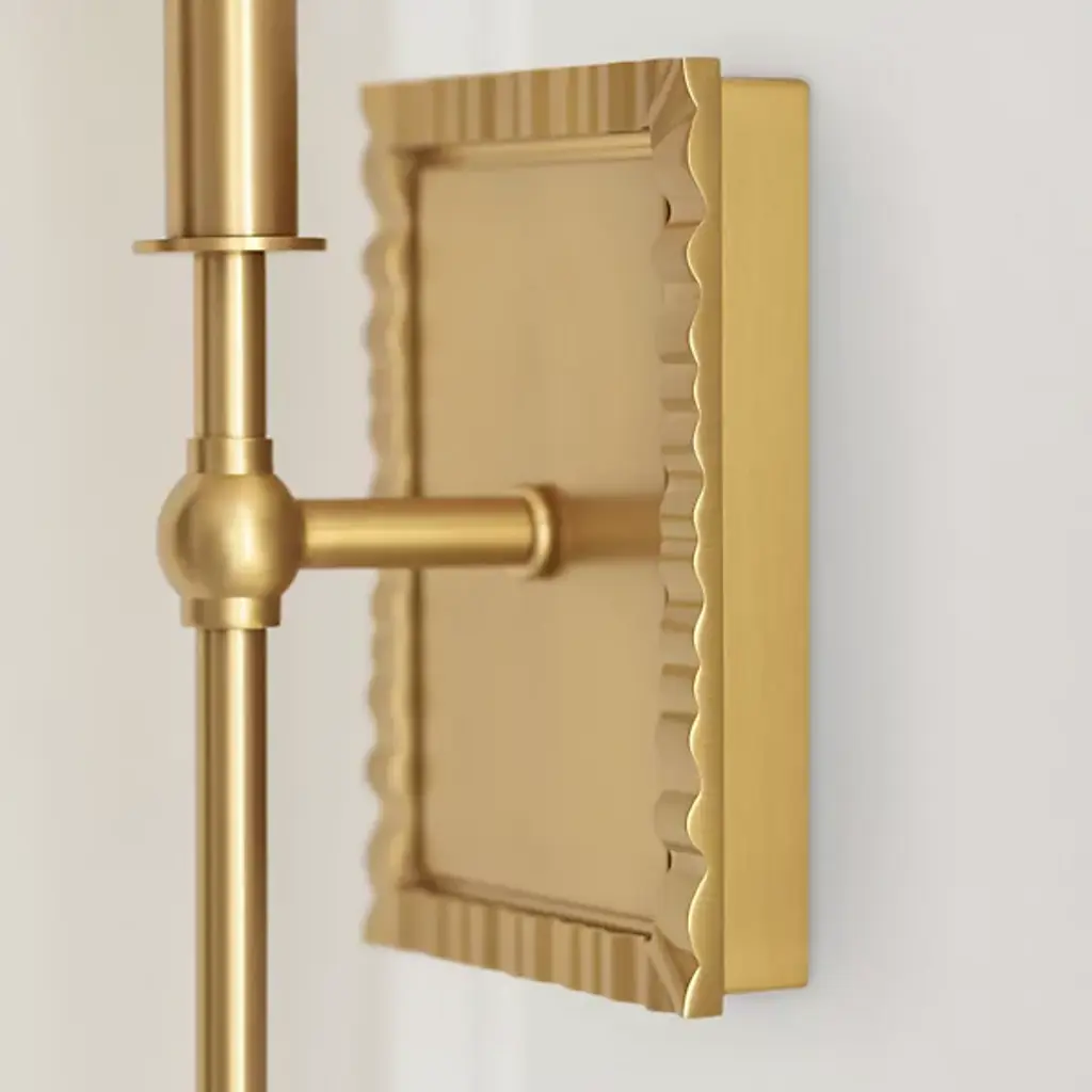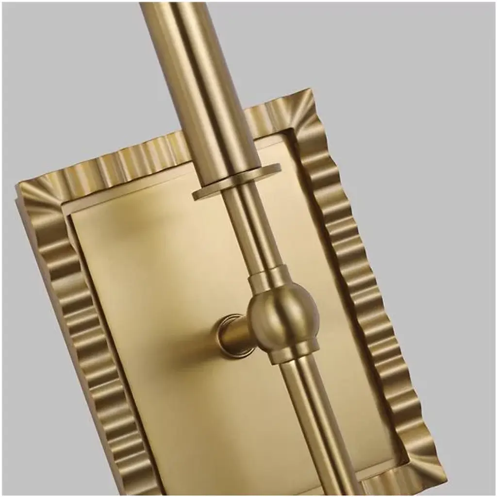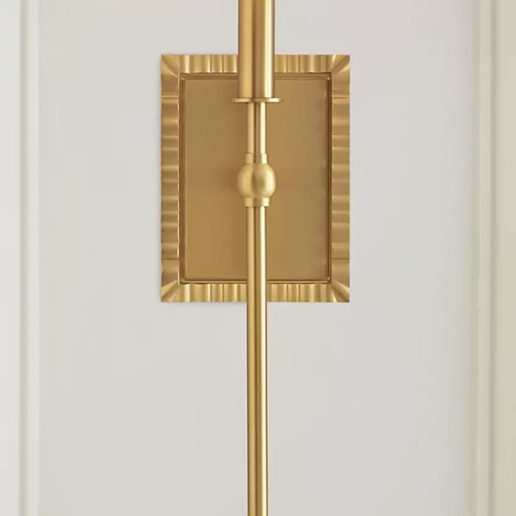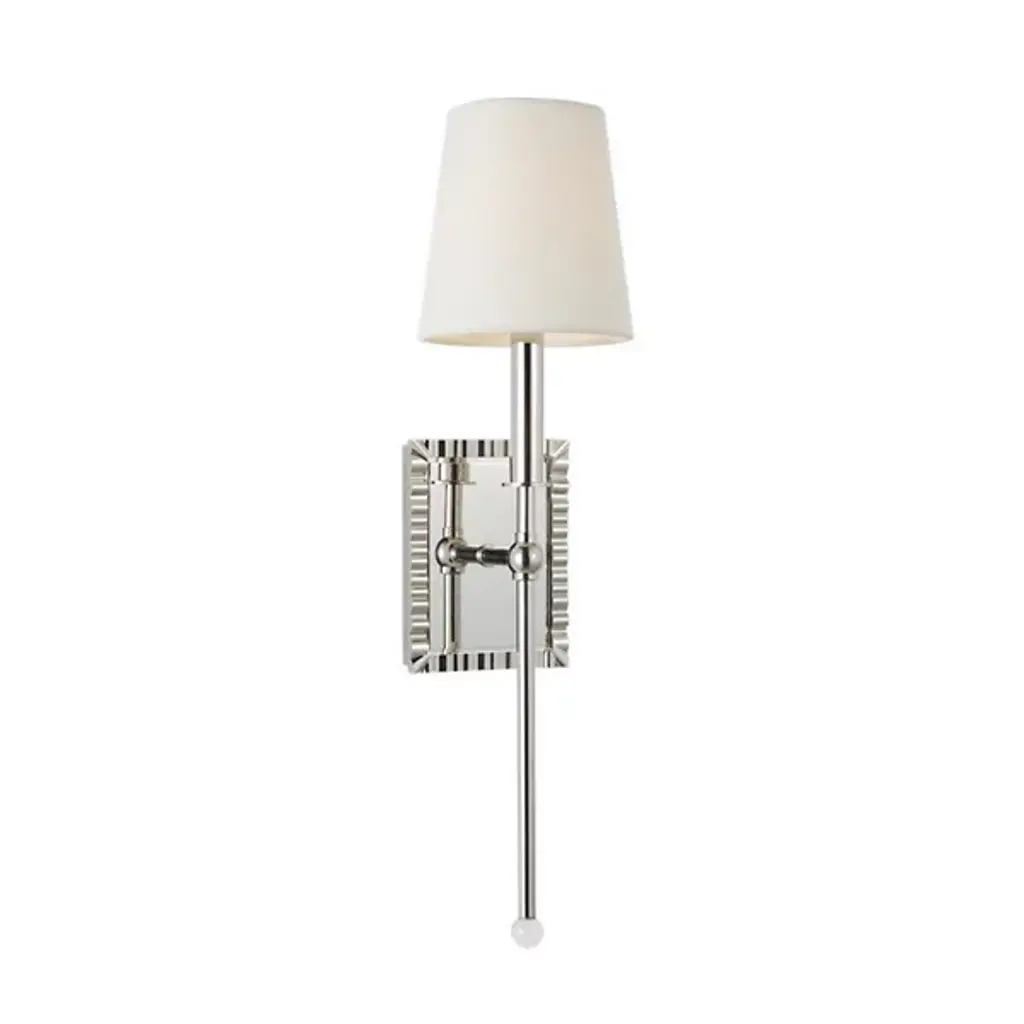 Classy silhouette with a crafted look. Flank your entryways and art pieces with the stylish design of the Baxley Wall Sconce from Visual Comfort Studio, formerly known as AH by Alexa Hampton, Like a lovely ribbon draped around the edges of a picture frame, textured metal lines a rectangular backplate with a stylish unfurled appearance. The slender figure of a tailed lamp holder appears in front, accented at the end with a charming glass sphere. A fabric lampshade completes the traditional-inspired design, taking in light from inside and translating it into an ambient glow.