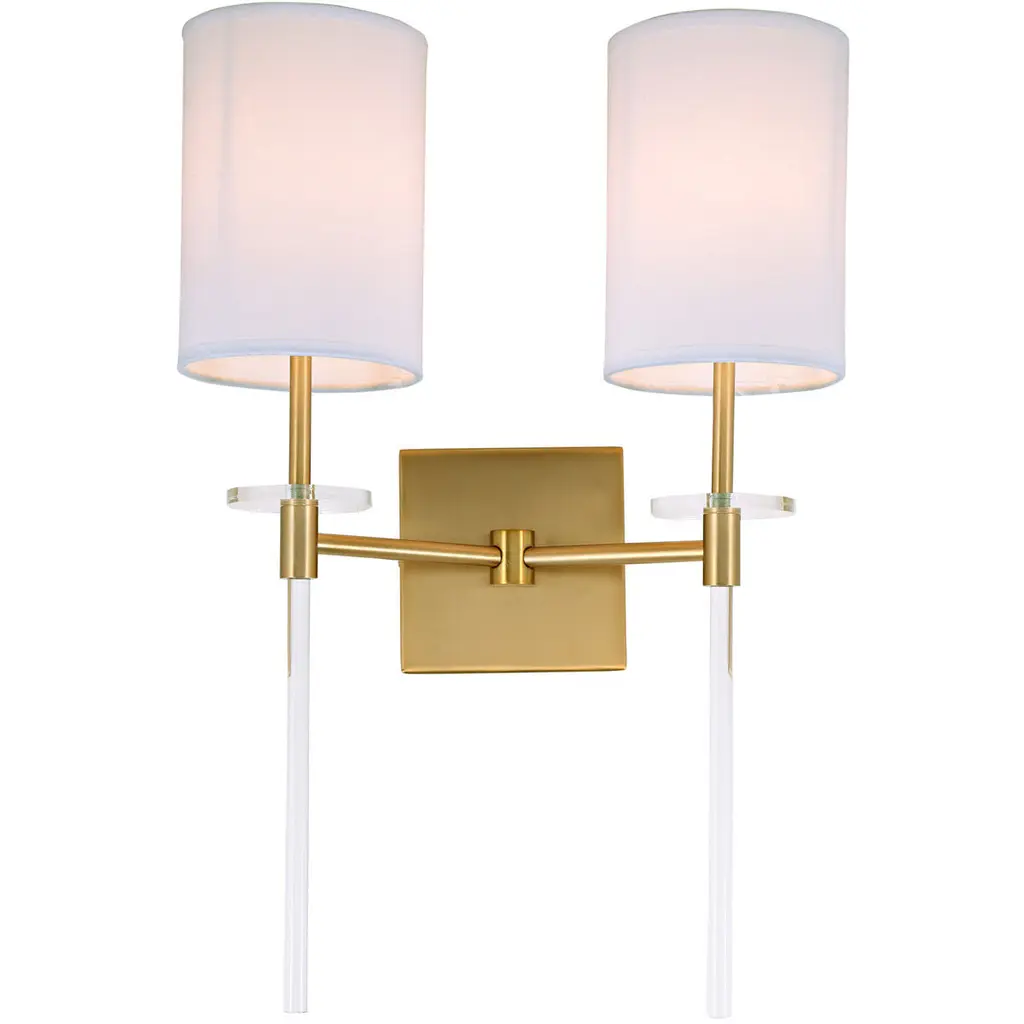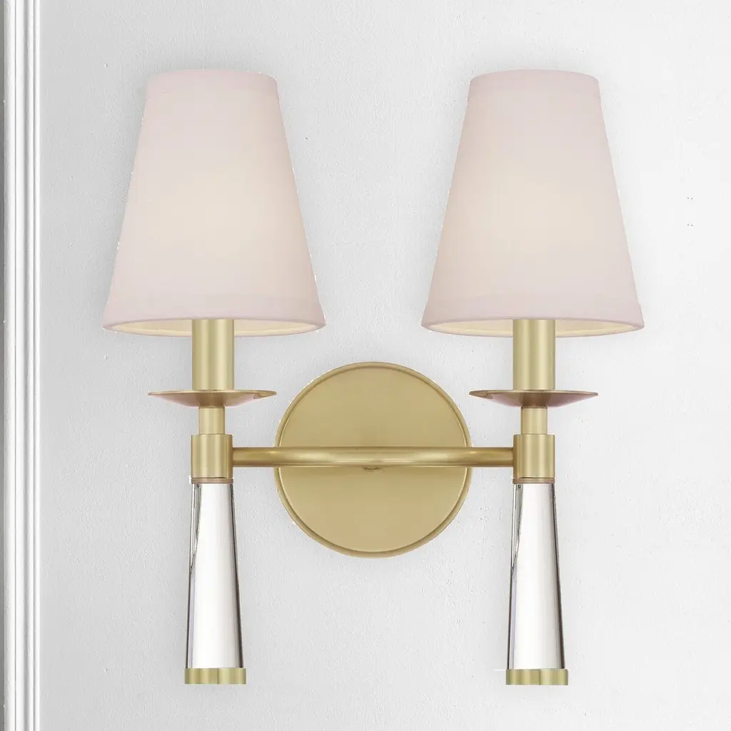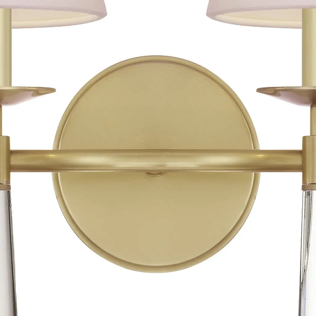 This sleek sconce is crafted of steel with solid glass stems and an aged brass finish. Two silk shades complete the piece. Hardwired.