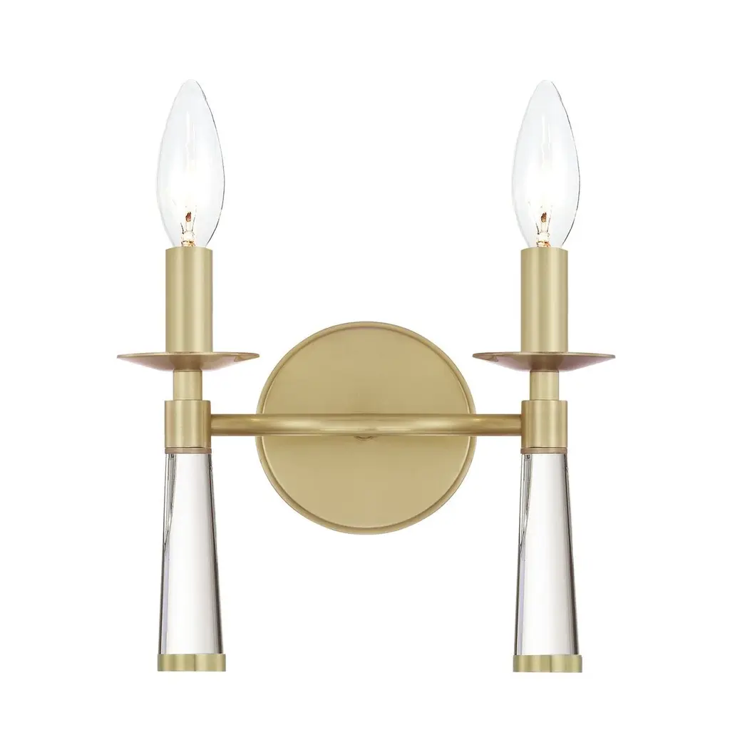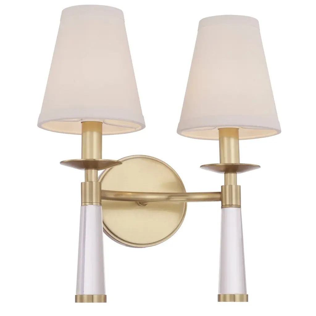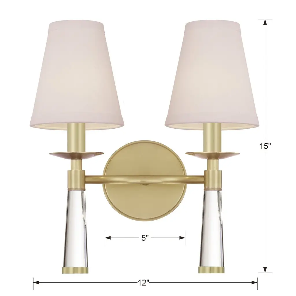 This sleek sconce is crafted of steel with solid glass stems and an aged brass finish. Two silk shades complete the piece. Hardwired.