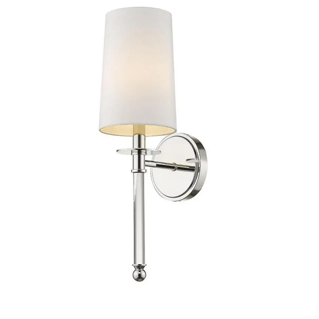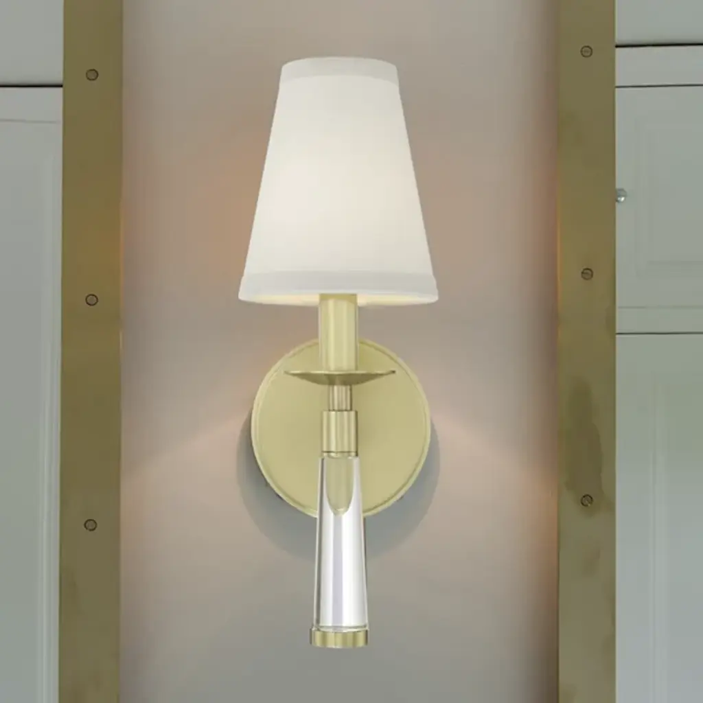 The Crystorama Baxter Wall Sconce features the perfect blend of chic and minimalist style. The white silk shade is accented with a thick clear glass stem, finished with steel hardware in a rich finish. When lit, the illumination is gracefully diffused through the luxurious silk shade, filling the space with a fashionable aesthetic and intriguing mixture of materials.