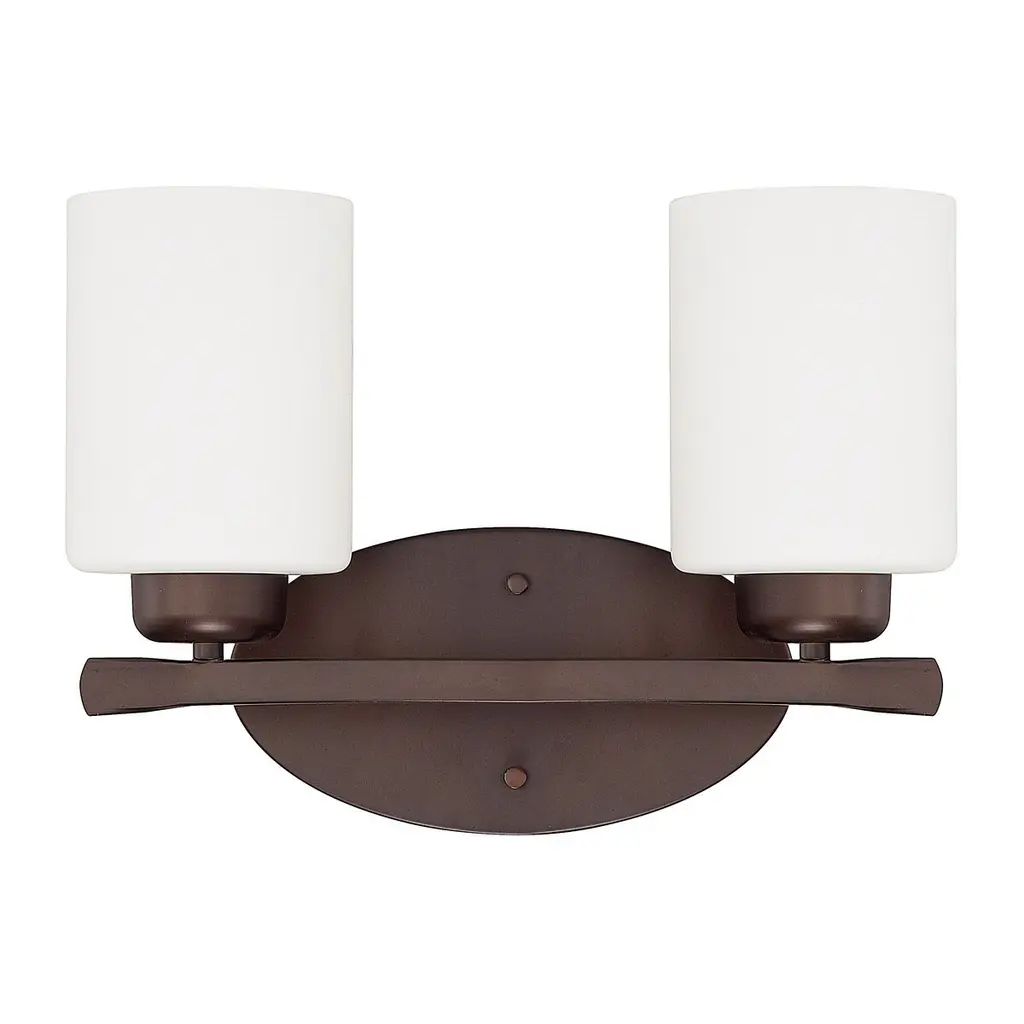 The Bayfield two light vanity fixture in bronze offers shadow-free lighting in your powder room, spa, or master bath room. The Bayfield bath collection by delivers simplicity with flair. The transitional design is a subtle combination of clean lines and flared, angular Satin Etched glass shades to bring style and warmth to the bathroom no matter the budget. Offered in Chrome, Burnt Sienna and Brushed Nickel finishes, the bath lighting collection offers one-light, two-light, three-light and four-light vanity fixtures. Both incandescent lamping and ENERGY STAR-qualified LED lamping are available; all fixtures are California Title 24 compliant.