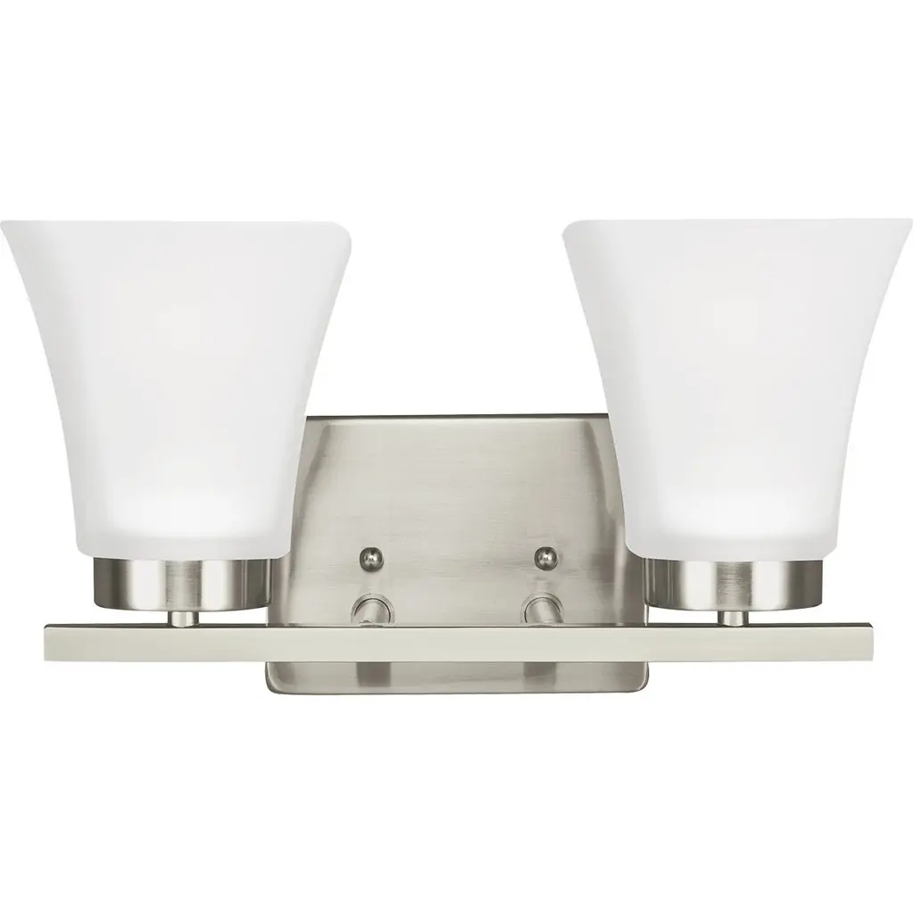 The Bayfield two light vanity fixture in chrome offers shadow-free lighting in your powder room, spa, or master bath room. The Bayfield bath collection by delivers simplicity with flair. The transitional design is a subtle combination of clean lines and flared, angular Satin Etched glass shades to bring style and warmth to the bathroom no matter the budget. Offered in Chrome, Burnt Sienna and Brushed Nickel finishes, the bath lighting collection offers one-light, two-light, three-light and four-light vanity fixtures. Both incandescent lamping and ENERGY STAR-qualified LED lamping are available; all fixtures are California Title 24 compliant.