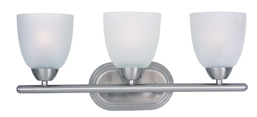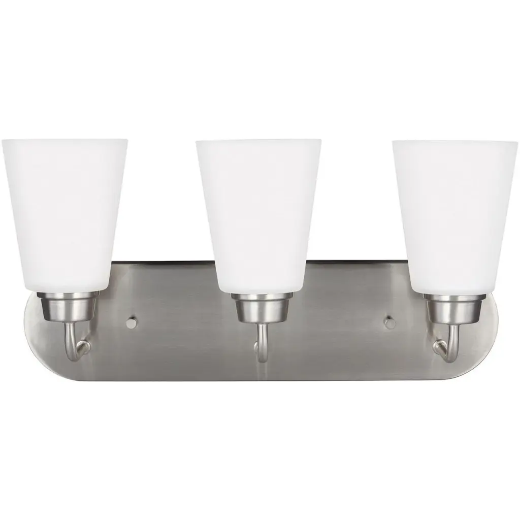 The Bayfield three light vanity fixture in brushed nickel provides abundant light for your bath vanity, while adding a layer of today's style to your interior design. The Bayfield bath collection by delivers simplicity with flair. The transitional design is a subtle combination of clean lines and flared, angular Satin Etched glass shades to bring style and warmth to the bathroom no matter the budget. Offered in Chrome, Burnt Sienna and Brushed Nickel finishes, the bath lighting collection offers one-light, two-light, three-light and four-light vanity fixtures. Both incandescent lamping and ENERGY STAR-qualified LED lamping are available; all fixtures are California Title 24 compliant.
