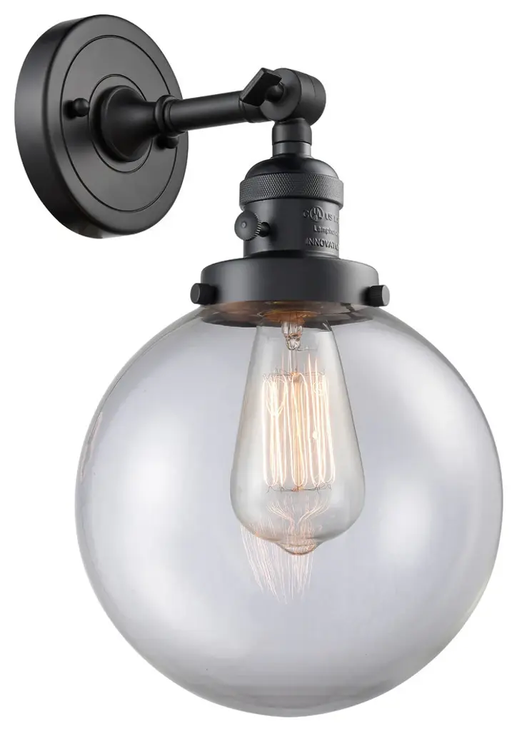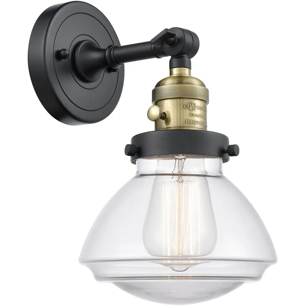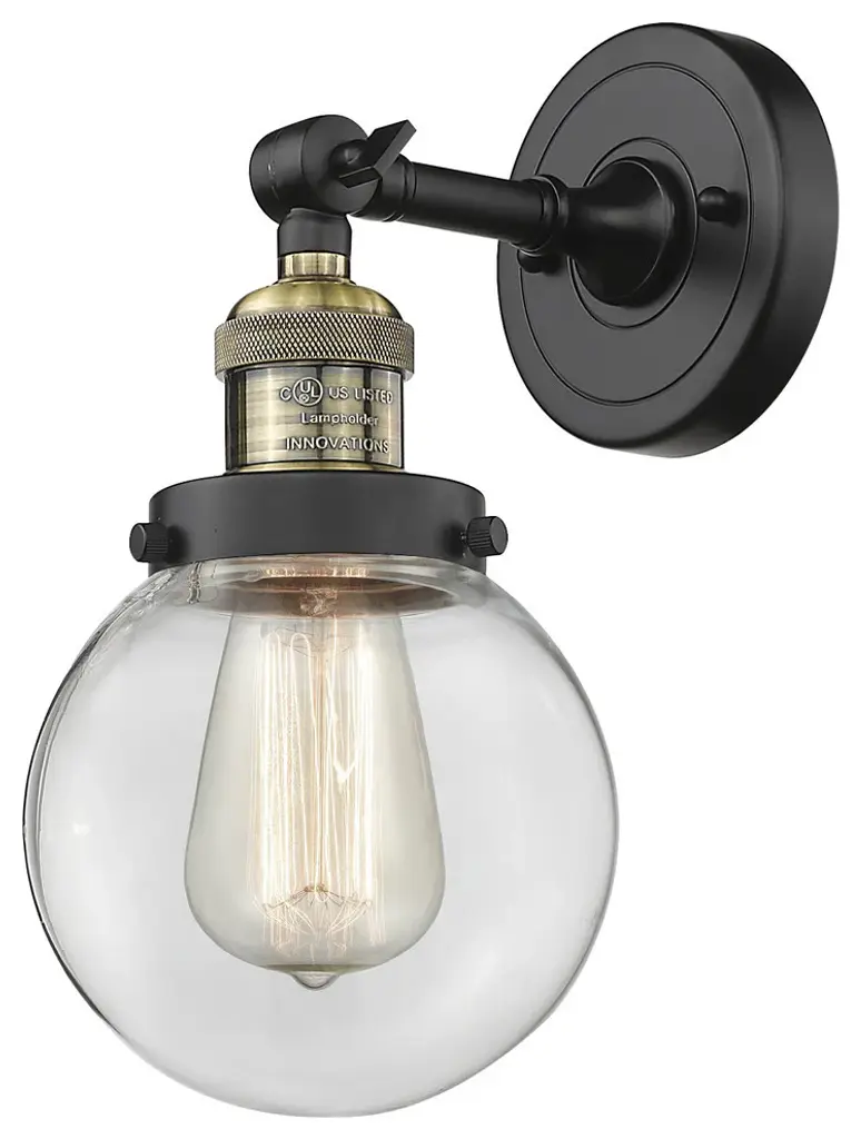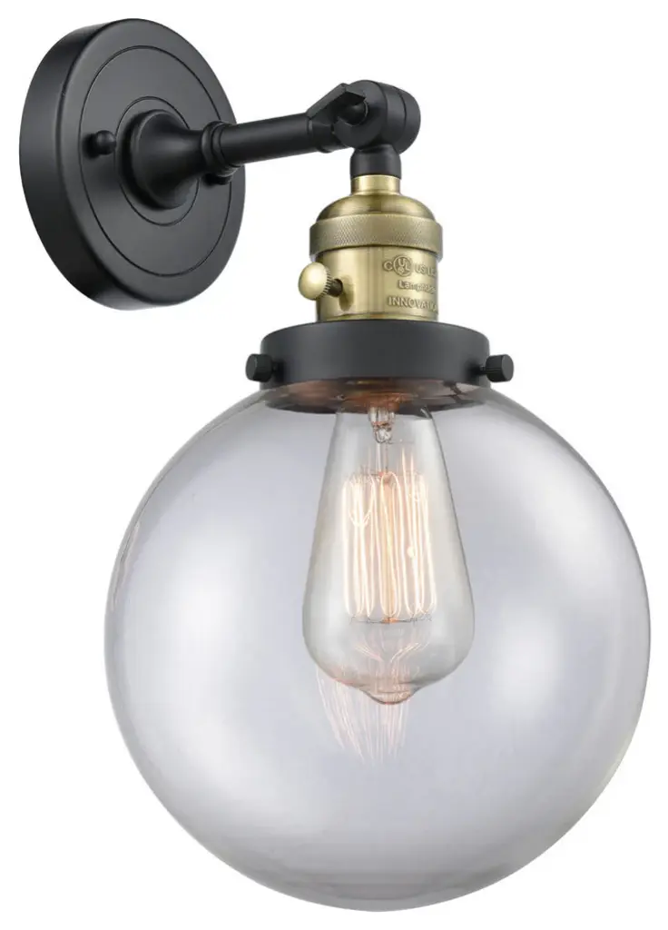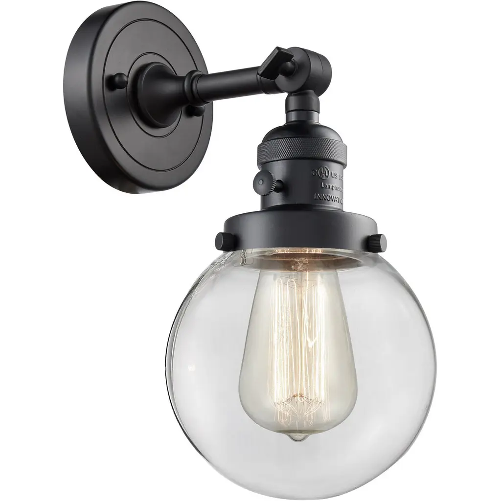 One of our largest and original collections, the Franklin Restoration is made up of a vast selection of heavy metal finishes and a large array of metal and glass shades that bring a touch of industrial into your home.Features:Solid brass 180 degree adjustable swivel with internal teeth that lock in at 5 degree intervals with engraved cast cup3 Way (High-Low-Off) switch included on socketFixture can be hung with bulbs facing up or down as a wall mount or facing down as a ceiling mount4.5 inch 2mm heavy cast backplateDistance from outlet opening to top of fixture 2.25 inchesRated for 100 watt maximumUL/CUL Damp RatedCompatible with Incandescent, LED, Fluorescent and Halogen bulbsNumber of Bulbs: 1Bulb Wattage: 3.5Bulb Type: LEDBulb Included: IncludedVoltage: 120Finish: Matte Black Finish Shade Finish: Clear Shade