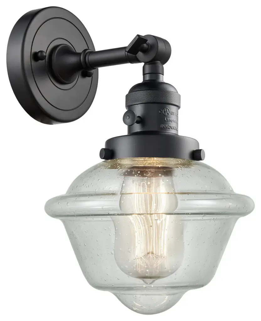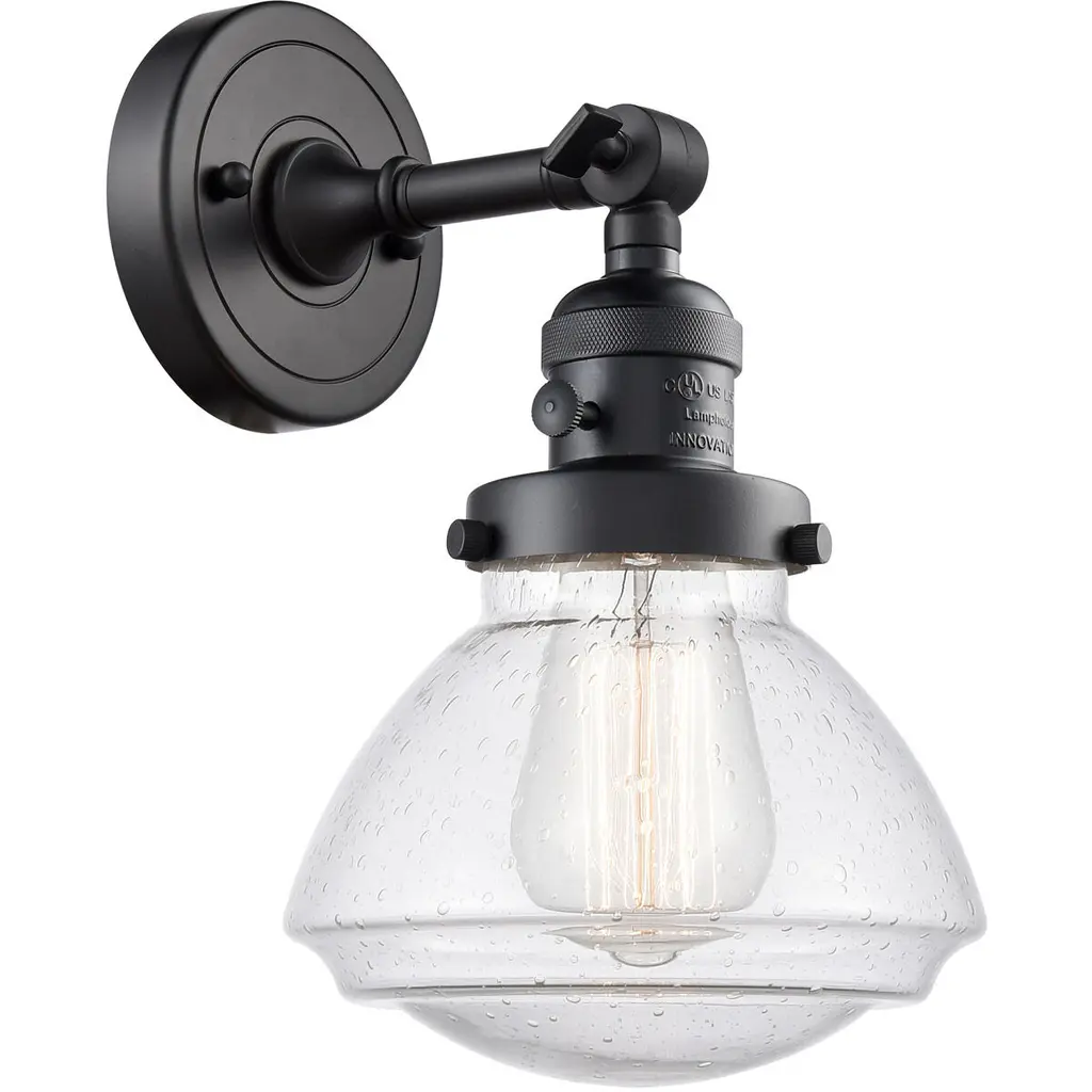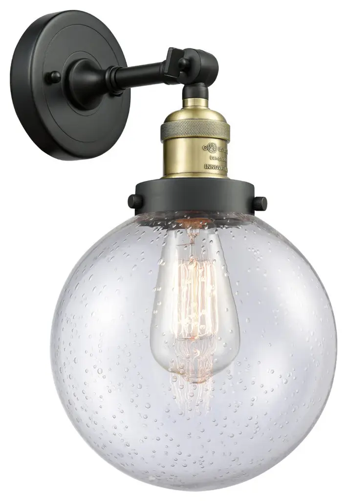 One of our largest and original collections, the Franklin Restoration is made up of a vast selection of heavy metal finishes and a large array of metal and glass shades that bring a touch of industrial into your home.Features:Solid brass 180 degree adjustable swivel with internal teeth that lock in at 5 degree intervals with engraved cast cup3 Way (High-Low-Off) switch included on socketFixture can be hung with bulbs facing up or down as a wall mount or facing down as a ceiling mount4.5 inch 2mm heavy cast backplateDistance from outlet opening to top of fixture 2.25 inchesRated for 100 watt maximumUL/CUL Damp RatedCompatible with Incandescent, LED, Fluorescent and Halogen bulbsNumber of Bulbs: 1Bulb Wattage: 3.5Bulb Type: LEDBulb Included: IncludedVoltage: 120Finish: Matte Black Finish Shade Finish: Seedy Shade.