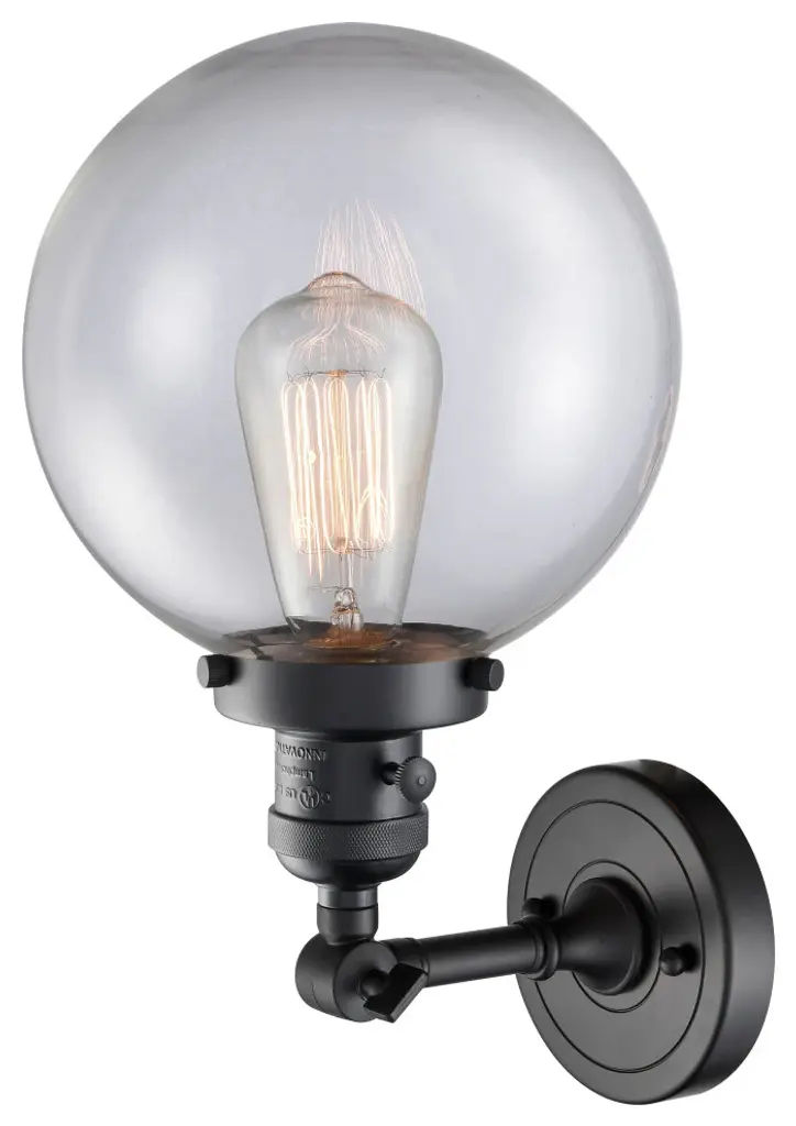 One of our largest and original collections, the Franklin Restoration is made up of a vast selection of heavy metal finishes and a large array of metal and glass shades that bring a touch of industrial into your home.Features:Solid brass 180 degree adjustable swivel with internal teeth that lock in at 5 degree intervals, and engraved cast cup3 way (High-Low-Off) switch included on socketFixture can be hung with bulbs facing up or down as a wall mount, or facing down as a ceiling mountDistance from outlet opening to top of fixture 2.25 inchRated for 100 watt maximumUL/CUL and ETL/CETL damp ratedCompatible with incandescent, LED, fluorescent and halogen bulbsNumber of Bulbs: 1Bulb Wattage: 60Bulb Type: IncandescentBulb Included: NoVoltage: 120Finish: Matte Black Finish Shade Finish: Clear Shade.
