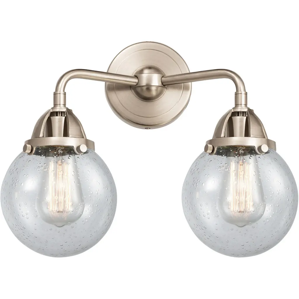 INNOVATIONS 616-2W-SN-G204-8 Beacon 2 Light 15.5 inch Bath Vanity Light Brushed Satin Nickel. Style: Art Nouveau, Industrial, Restoration-Vintage, Transitional . Collection Name: Edison. Metal Finish(Body): Brushed Satin Nickel. Metal Finish(Canopy/Backplate): Brushed Satin Nickel. Material: Steel, Cast Brass, Glass. Dimension(in): 13.625(H) x 17(W) x 8.5(Ext). Bulb: (2)60W Medium Base Incandescent(Not Included). Voltage: 120. Dimmable: Yes. Color Temperature (Kelvin): 2200. Color Rendering Index (CRI): 99.9. Lumens: 220. Life Expectancy (Hours): 2000. Glass Shade Description: Seedy Beacon. Glass Type: Seedy; Ribbed. Shade Shape: Bowl. Glass or Metal Shade Color: Seedy. Shade Material: Glass. Shade Dimension(in): 8(W) x 8.375(H). Fitter Measurement (Glass Or Metal Shade Fitter Size): 3.25 inch Fitter. Backplate Dimension(in): 4.5(W) x 0.75(Depth). ADA Compliant: No. California Proposition 65 Warning Required: Yes. UL/ETL Certification Type: Damp Location.
