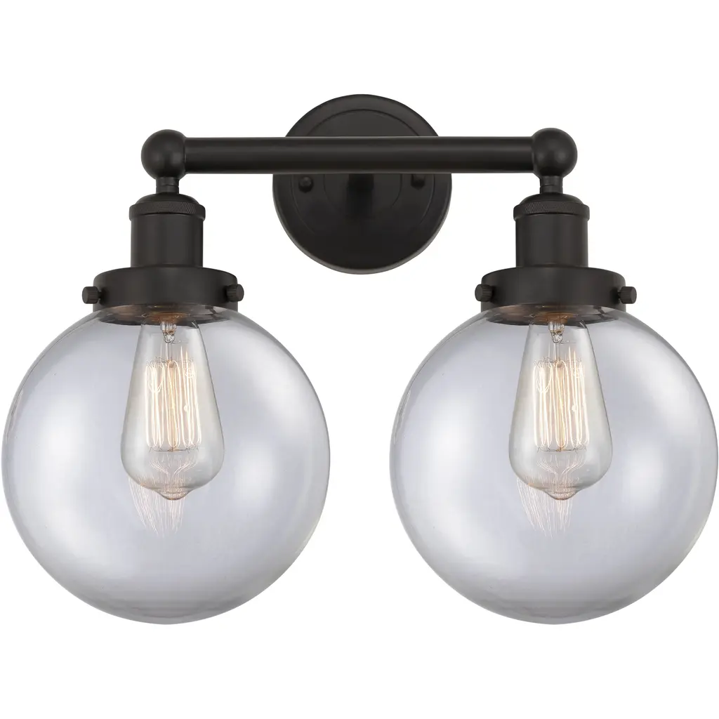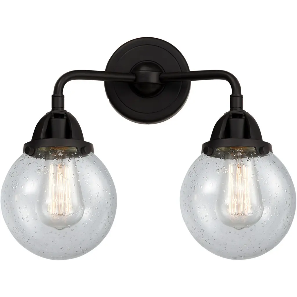 INNOVATIONS 616-2W-BK-G204-8 Beacon 2 Light 15.5 inch Bath Vanity Light Matte Black. Style: Art Nouveau, Industrial, Restoration-Vintage, Transitional . Collection Name: Edison. Metal Finish(Body): Matte Black. Metal Finish(Canopy/Backplate): Matte Black. Material: Steel, Cast Brass, Glass. Dimension(in): 13.625(H) x 17(W) x 8.5(Ext). Bulb: (2)60W Medium Base Incandescent(Not Included). Voltage: 120. Dimmable: Yes. Color Temperature (Kelvin): 2200. Color Rendering Index (CRI): 99.9. Lumens: 220. Life Expectancy (Hours): 2000. Glass Shade Description: Seedy Beacon. Glass Type: Seedy; Ribbed. Shade Shape: Bowl. Glass or Metal Shade Color: Seedy. Shade Material: Glass. Shade Dimension(in): 8(W) x 8.375(H). Fitter Measurement (Glass Or Metal Shade Fitter Size): 3.25 inch Fitter. Backplate Dimension(in): 4.5(W) x 0.75(Depth). ADA Compliant: No. California Proposition 65 Warning Required: Yes. UL/ETL Certification Type: Damp Location.