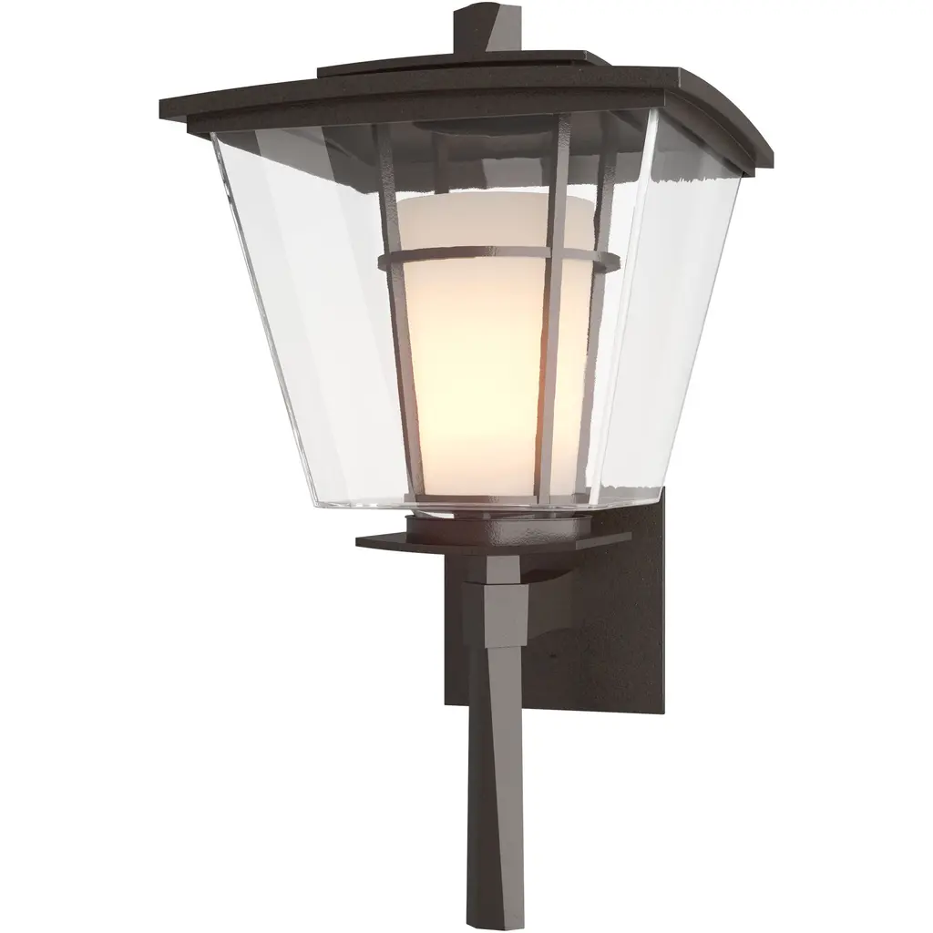 The Hubbardton Forge Beacon Hall Coastal Outdoor Wall Sconce beautifully captures the classic lines of the traditional coach lantern. Yet it also defines a new simplicity using the language of hand forged materials and the elegance of blown glass. The durable, rust-free aluminum construction paired with the simplicity of the hand-blown glass cylinder encased by clear glass panels proves that classic never go out of style. The coastal finishes are meant to endure harsh salt water environments and have been tested to 100% humidity and water with salinity 50% greater than the average found in the Atlantic or Pacific.