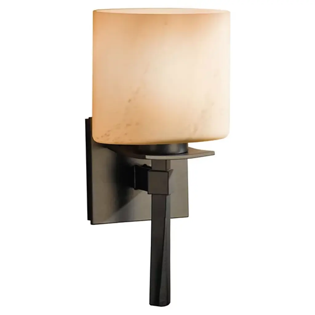 If this handsome piece had not been designed to be mounted to a wall, it would make for the most fashionable modern torch ever assembled. The Beacon Hall Wall Sconce No. 204820 from Hubbardton Forge features a gentle opaque lamp shade with a protruding hand-forged asymmetrical metal stem long enough to hold, all framed by a square mount with a similar finish. Incandescent bulbs filtered through its soft cylindrical lampshade help produce a golden ambient light. It is an excellent piece for framing large mirrors, artworks, or accompanying doorways.