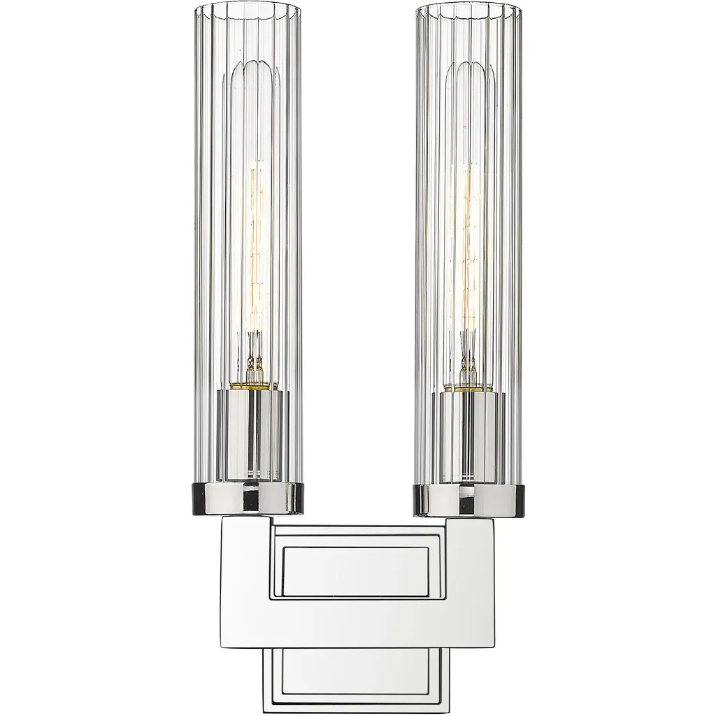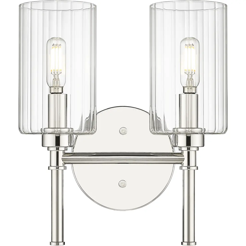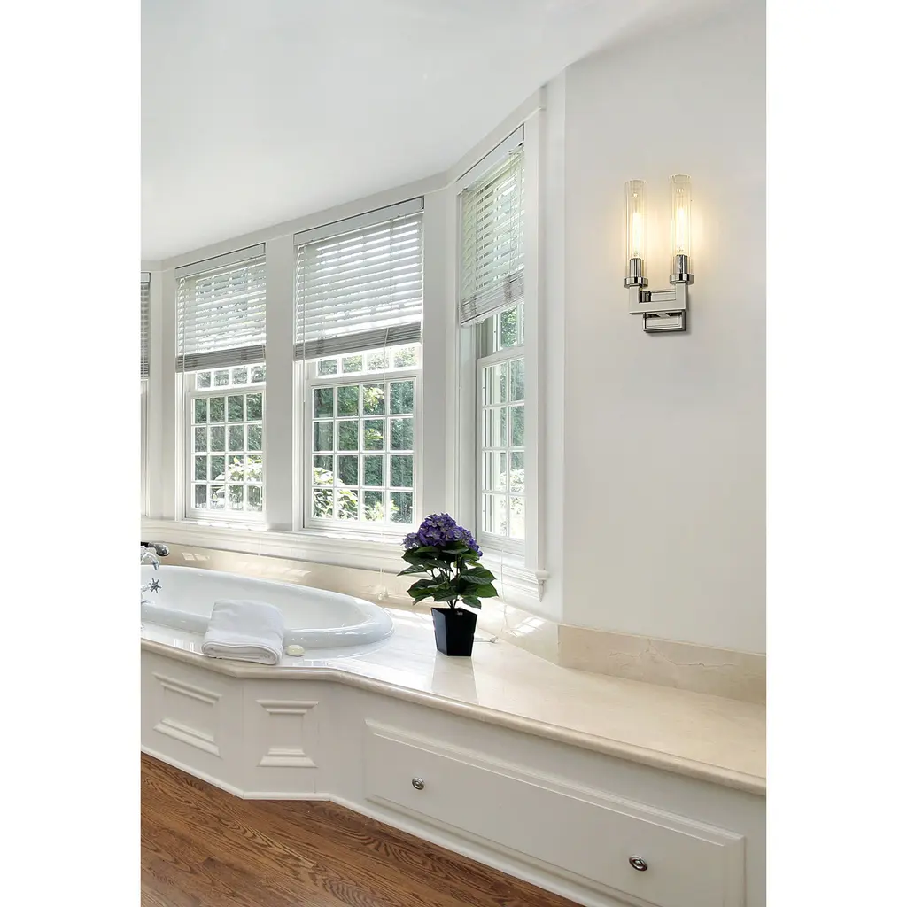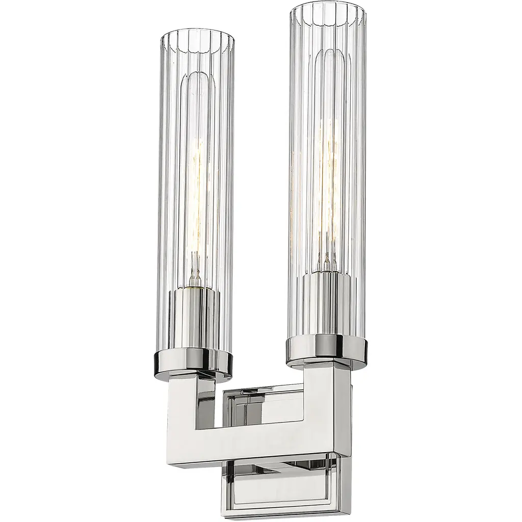 Minimalism goes sophisticated and tasteful in the design of the chic Beau two-light metal wall sconce. Add this fixture to a contemporary hallway, entryway, or bedroom, delivering an upscale modern vibe with a minimalist aesthetic. Sleek tubular fluted glass shades sit side by side, mounted to a wall plate and frame made of gleaming polished nickel finish steel.