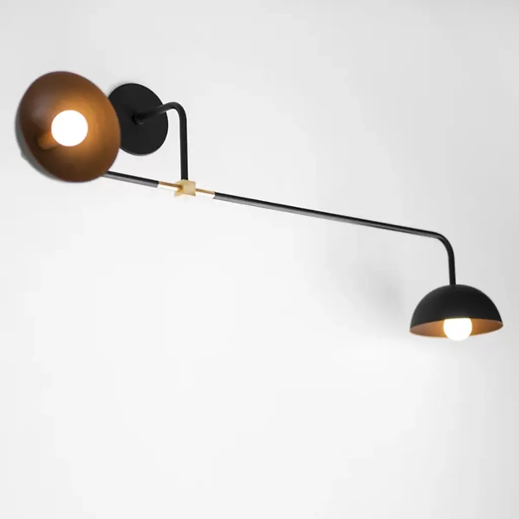 Strong, sophisticated, seductive. The Beaubien Wall Sconce from Lambert & Fils is a functional piece of sculpture for your wall, presenting you with a memorable silhouette from the front and the sides. The piece draws inspiration from traditional Chinese screens and the Memphis movement. Designer Samuel Lambert captures the ornamental quality of the two visual languages with a humble, yet complex design aesthetic. The beauty in the sconce's asymmetry is that it feels fluid and natural when mounted in any direction. Its long metal arm pleases in its slender contour. Metal dome shades face in opposite directions, giving you a peek at the milk glass globe from the front or the side. The globes draw you closer as their warm light glazes the shade and exits as a soft, two-part ambient glow.